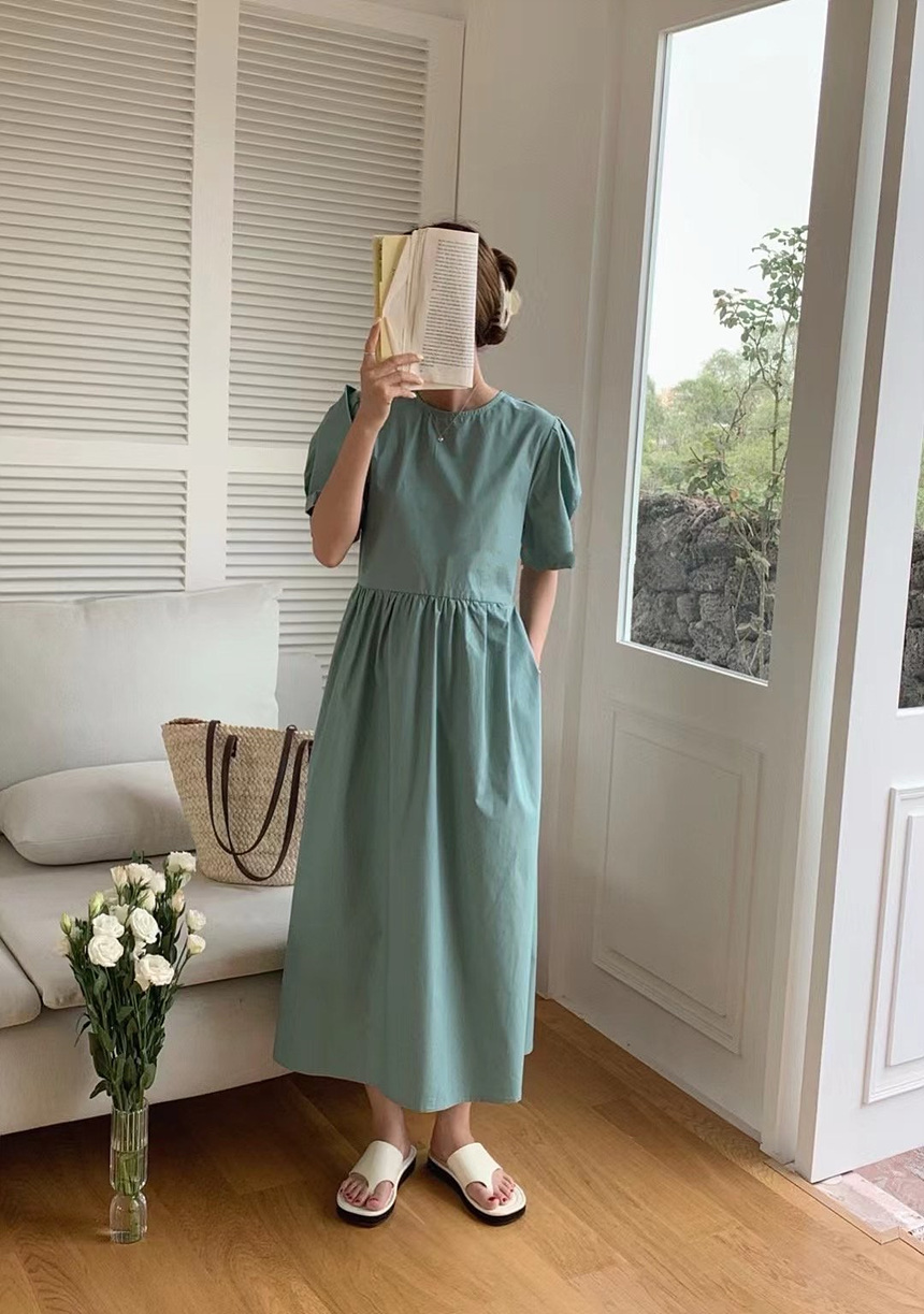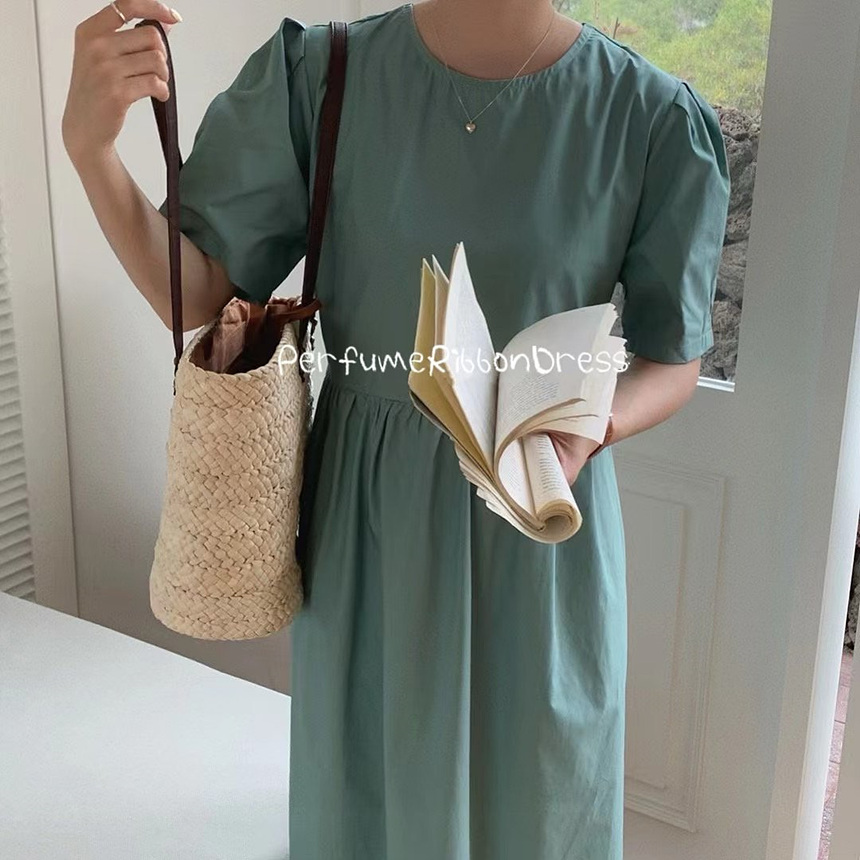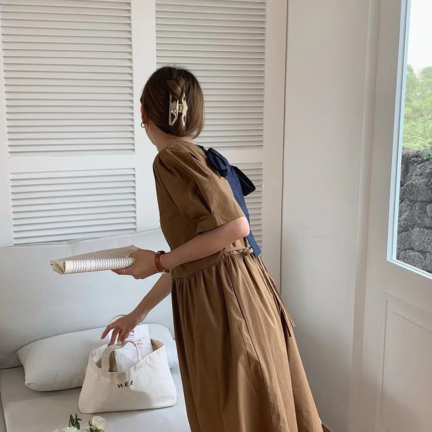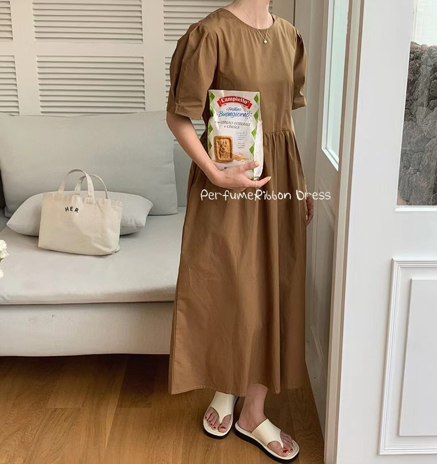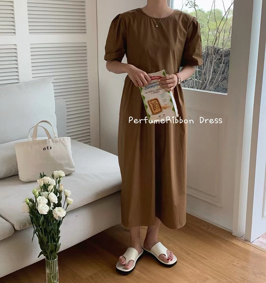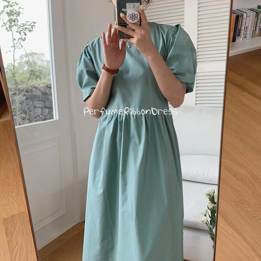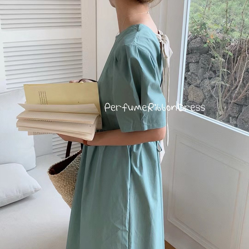 바로발송 백 리본 반소매 퍼프 롱 원피스