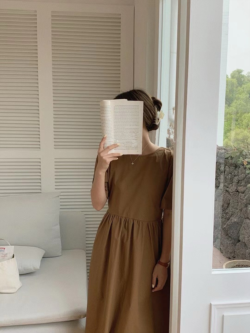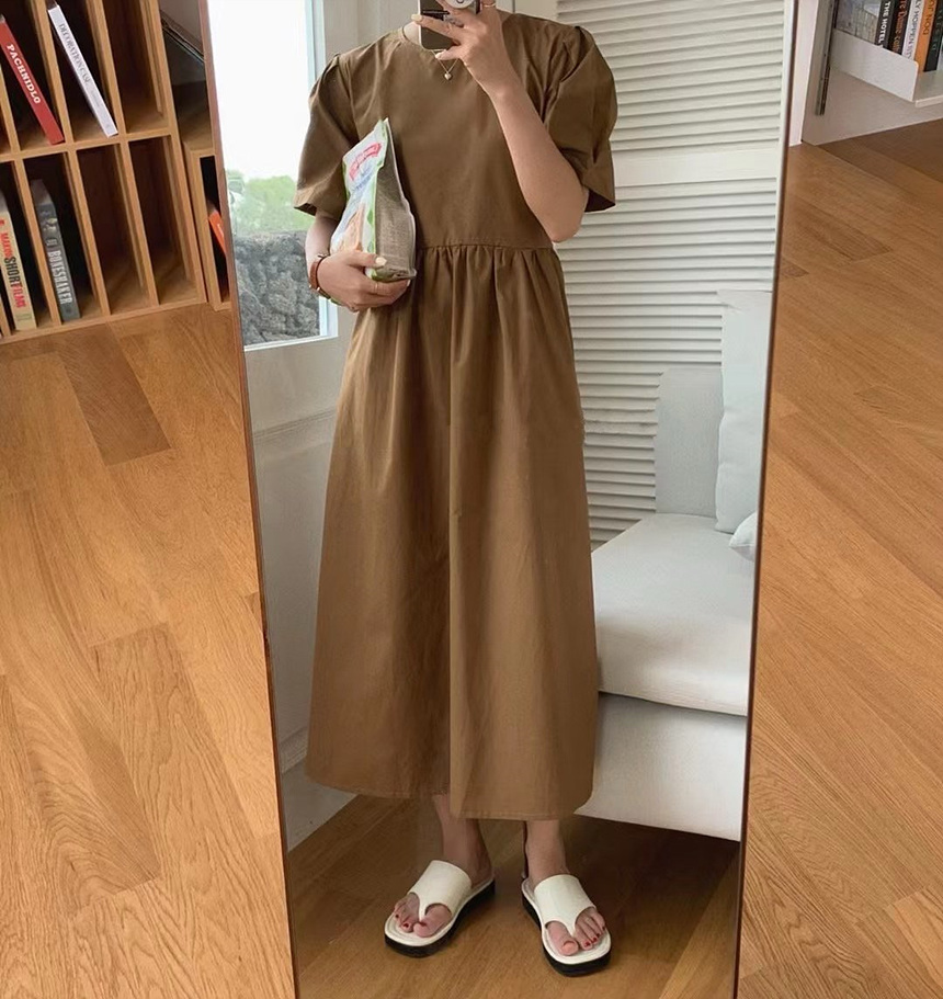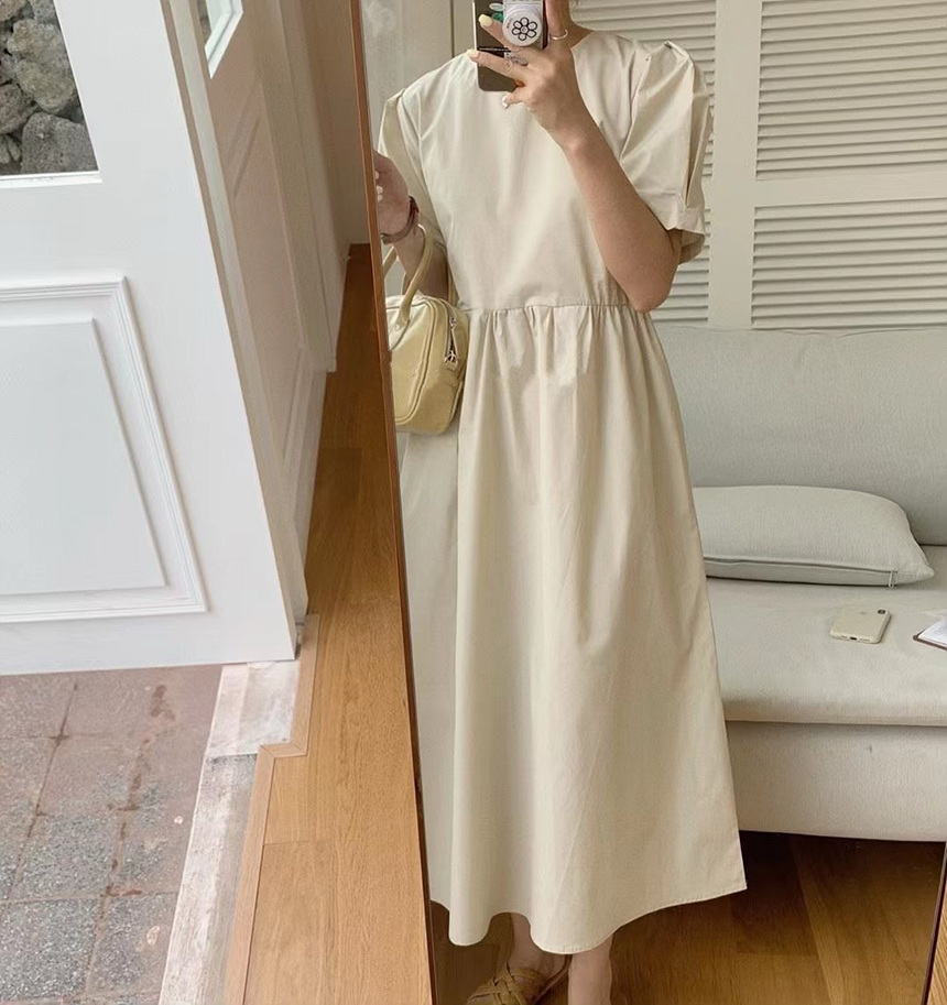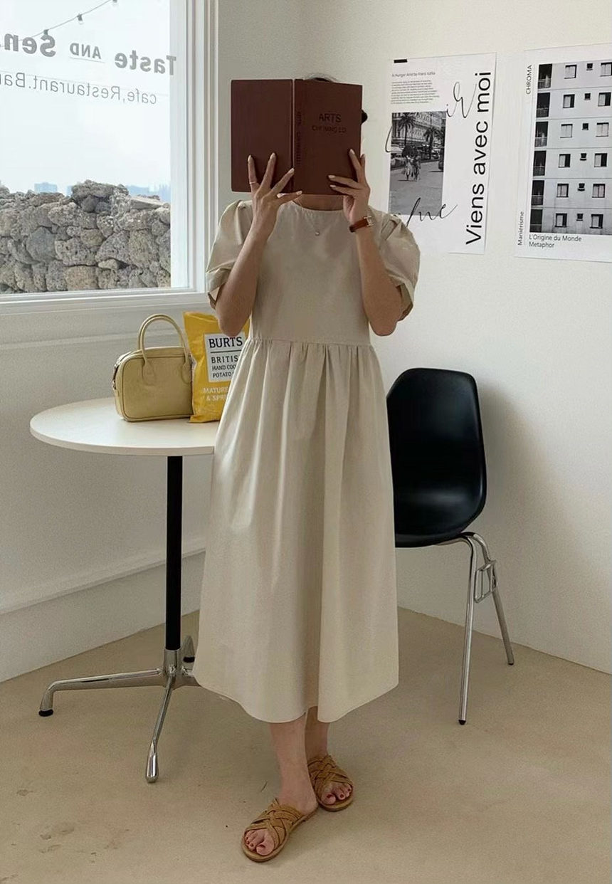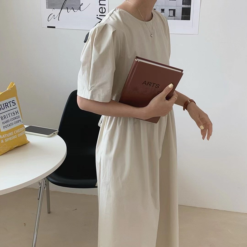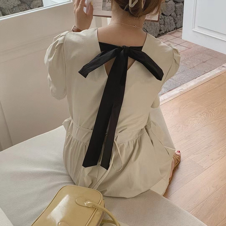 바로발송 백 리본 반소매 퍼프 롱 원피스