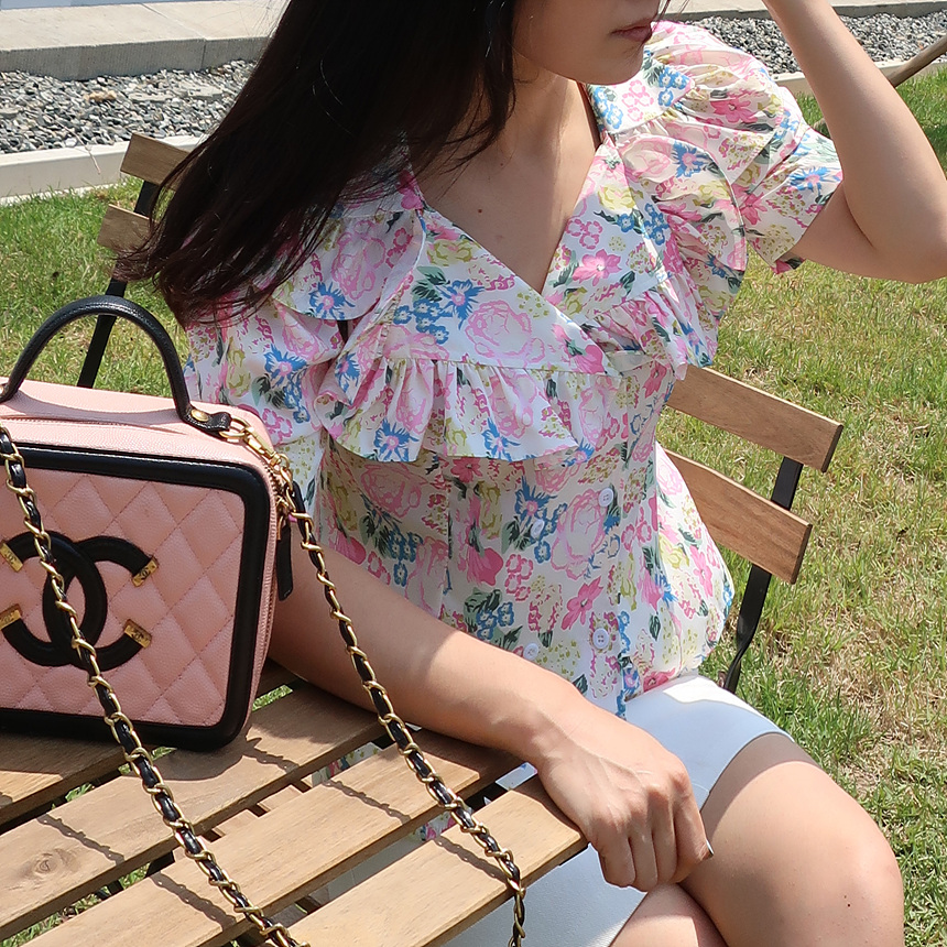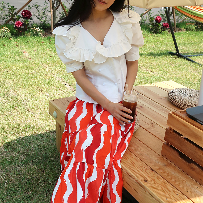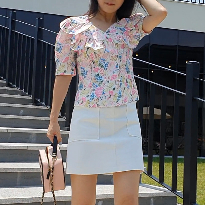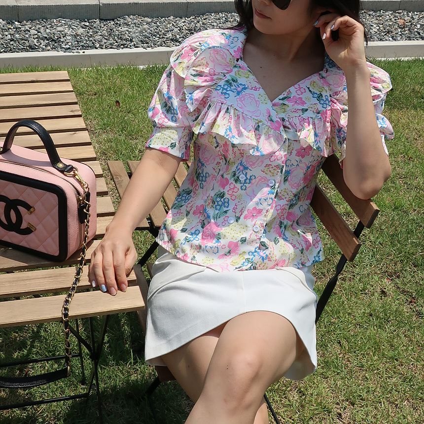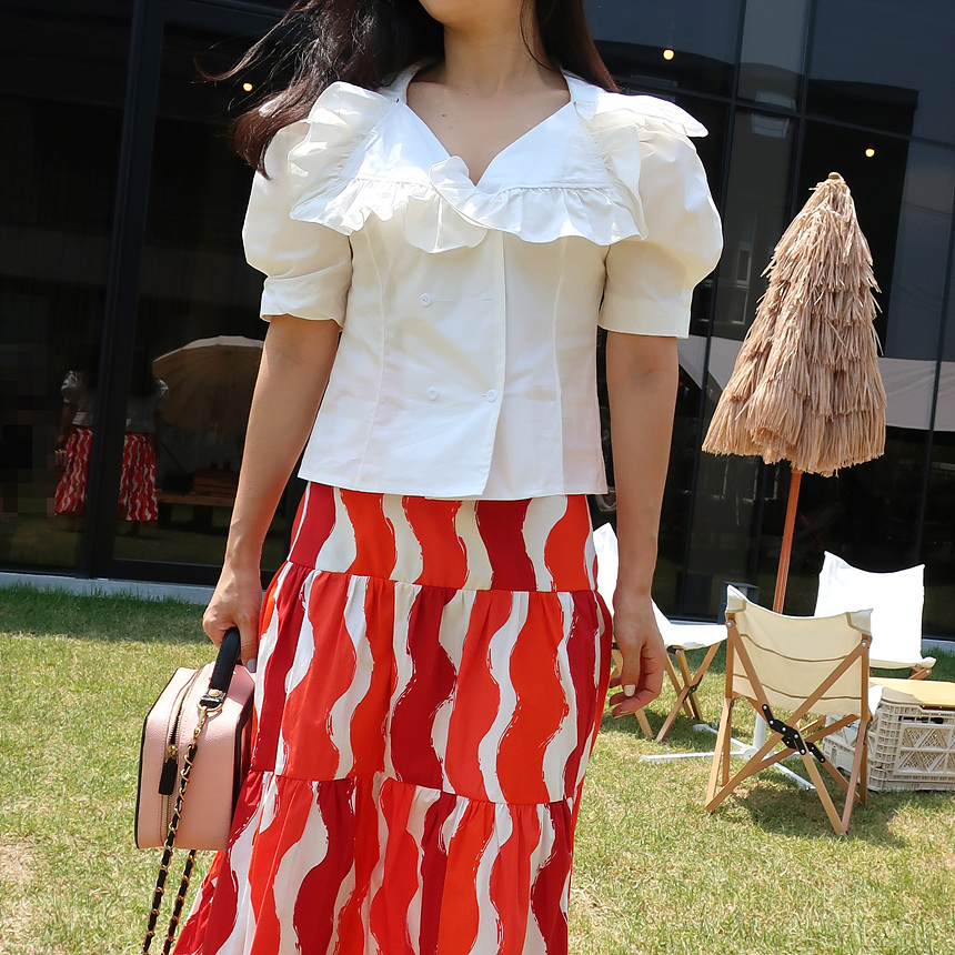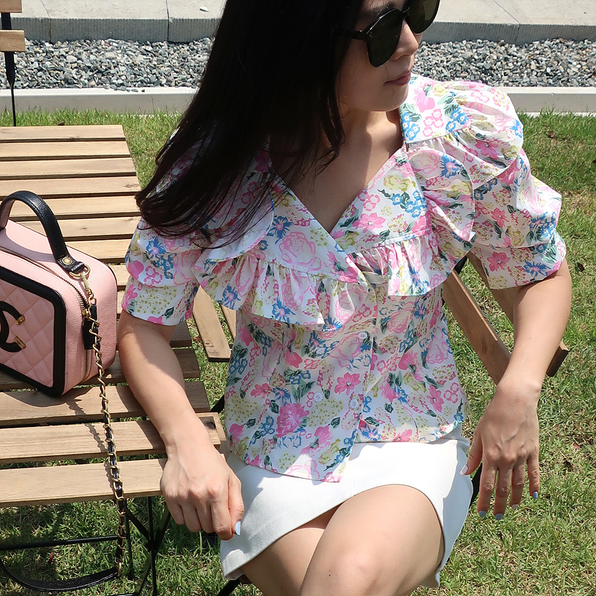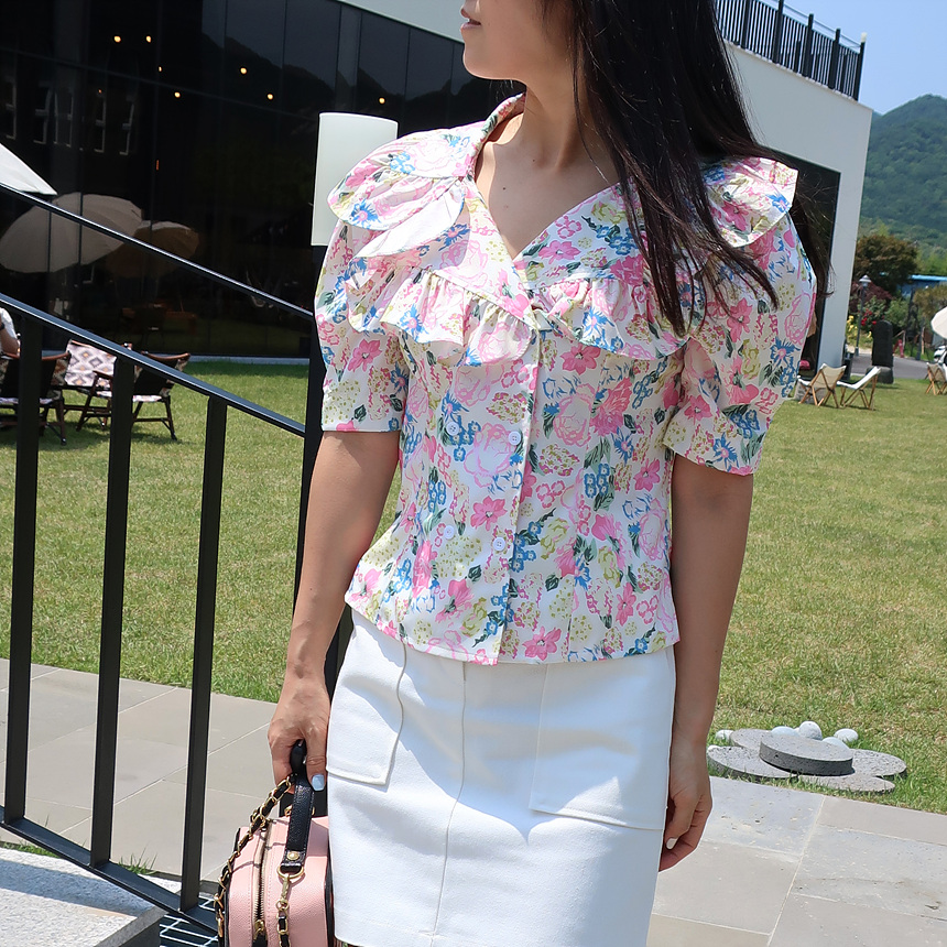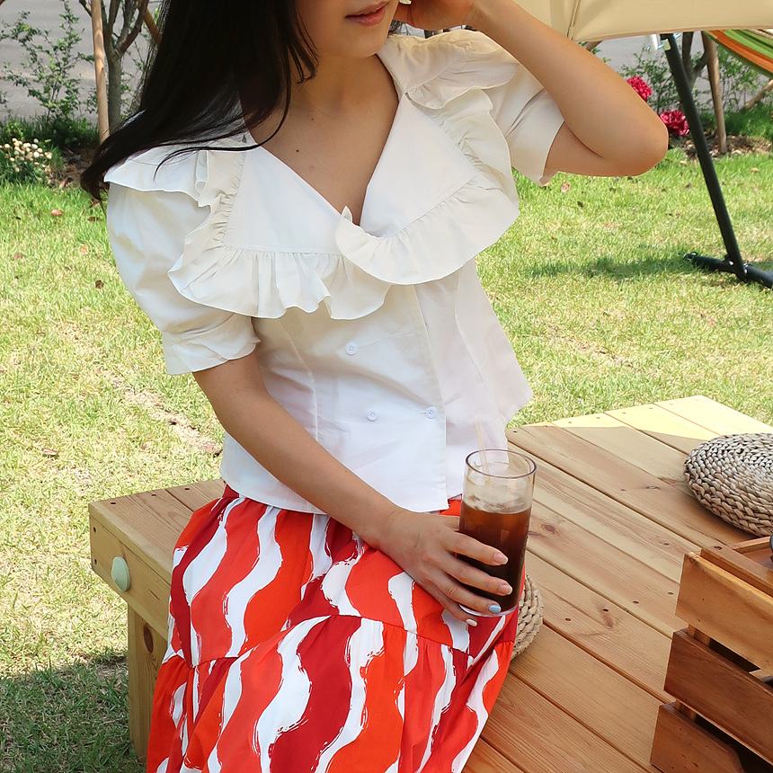 바로발송 브이넥 볼륨 프릴 반팔 크롭 블라우스