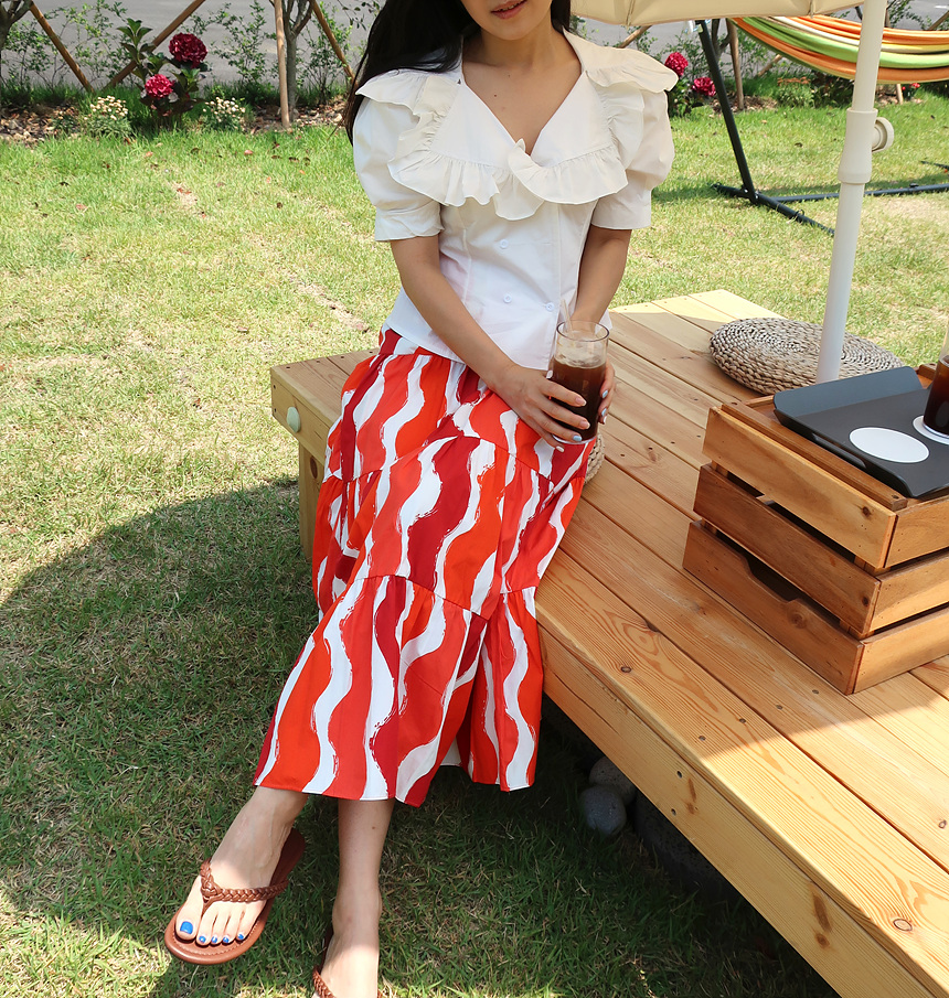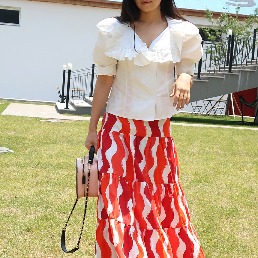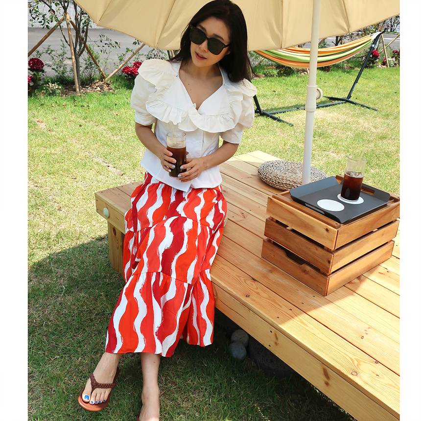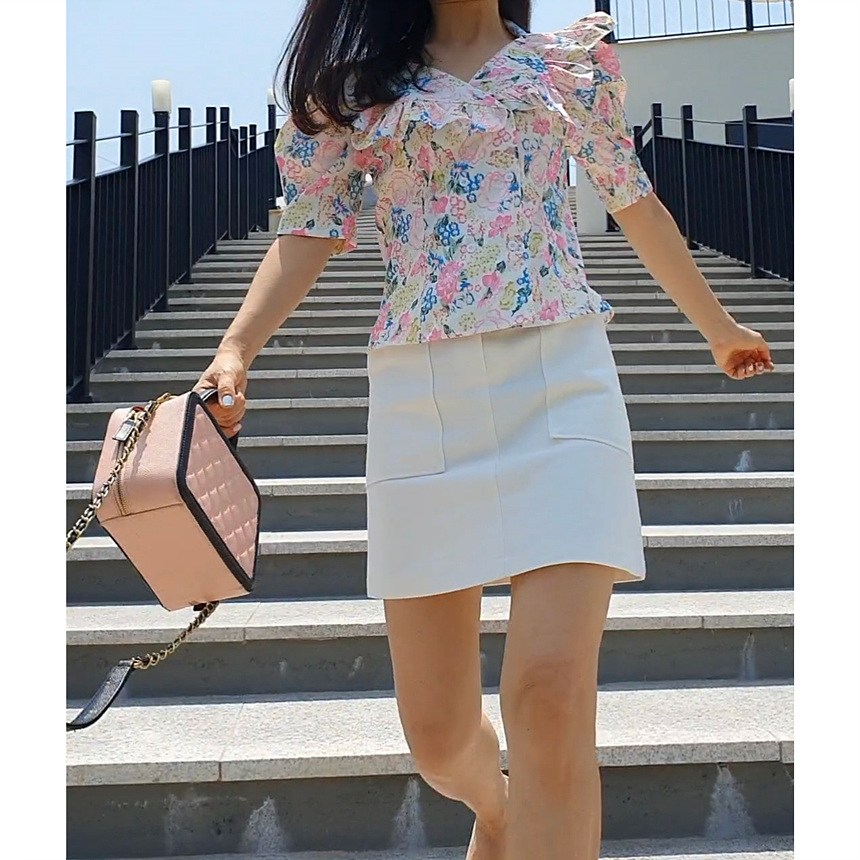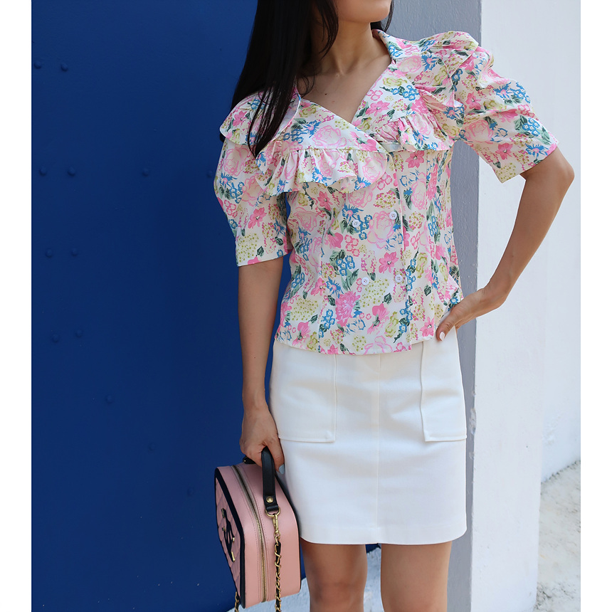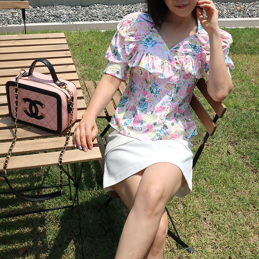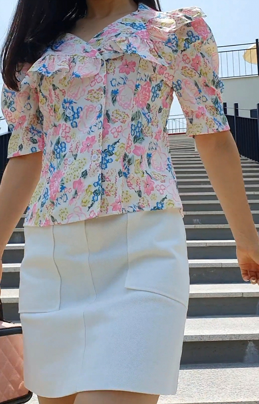 바로발송 브이넥 볼륨 프릴 반팔 크롭 블라우스