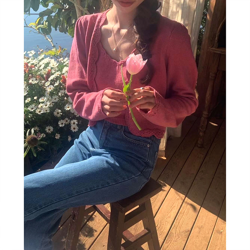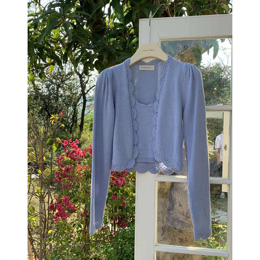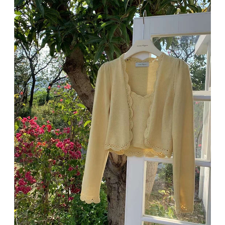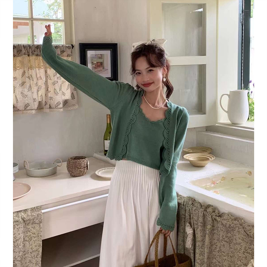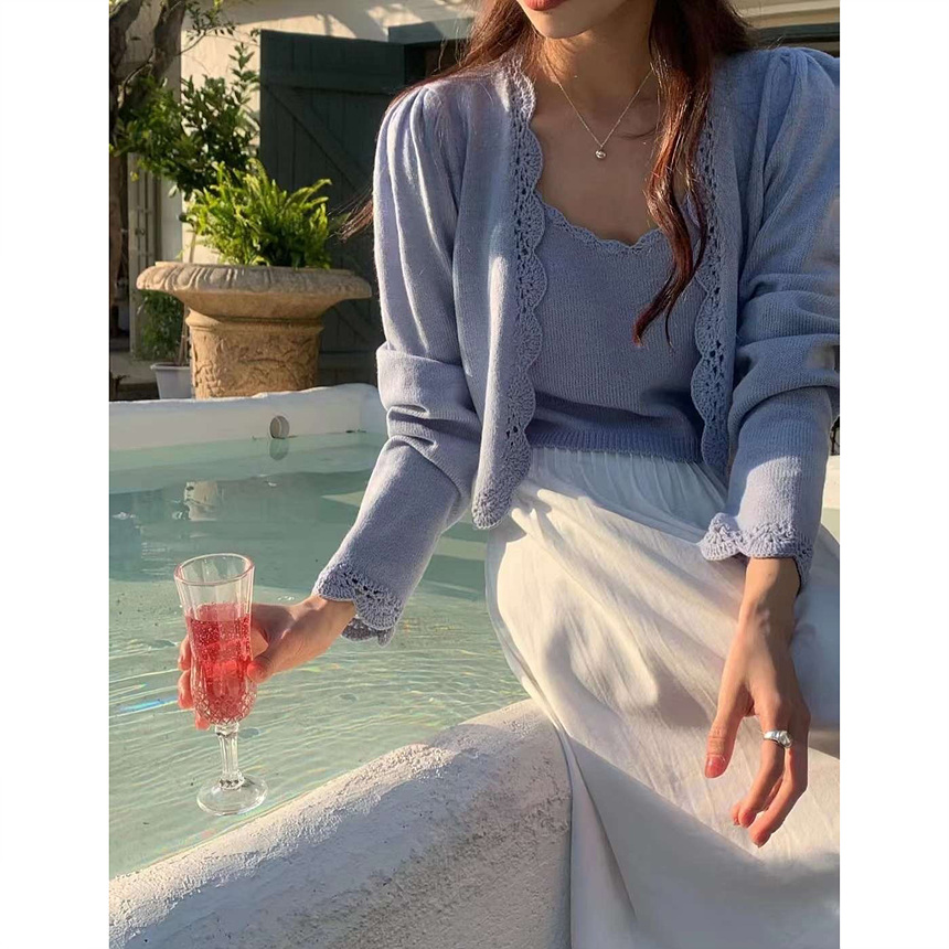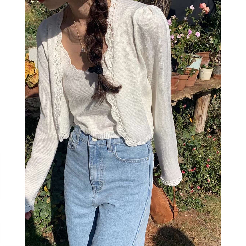 바로발송 뜨개 레이스 크롭 나시 가디건 세트