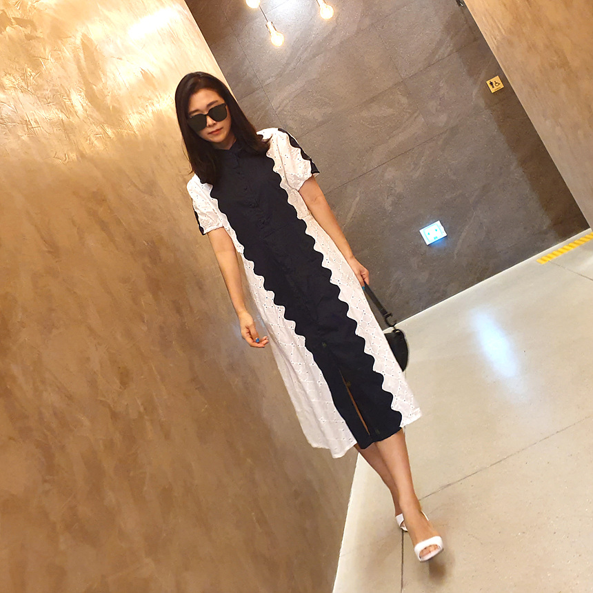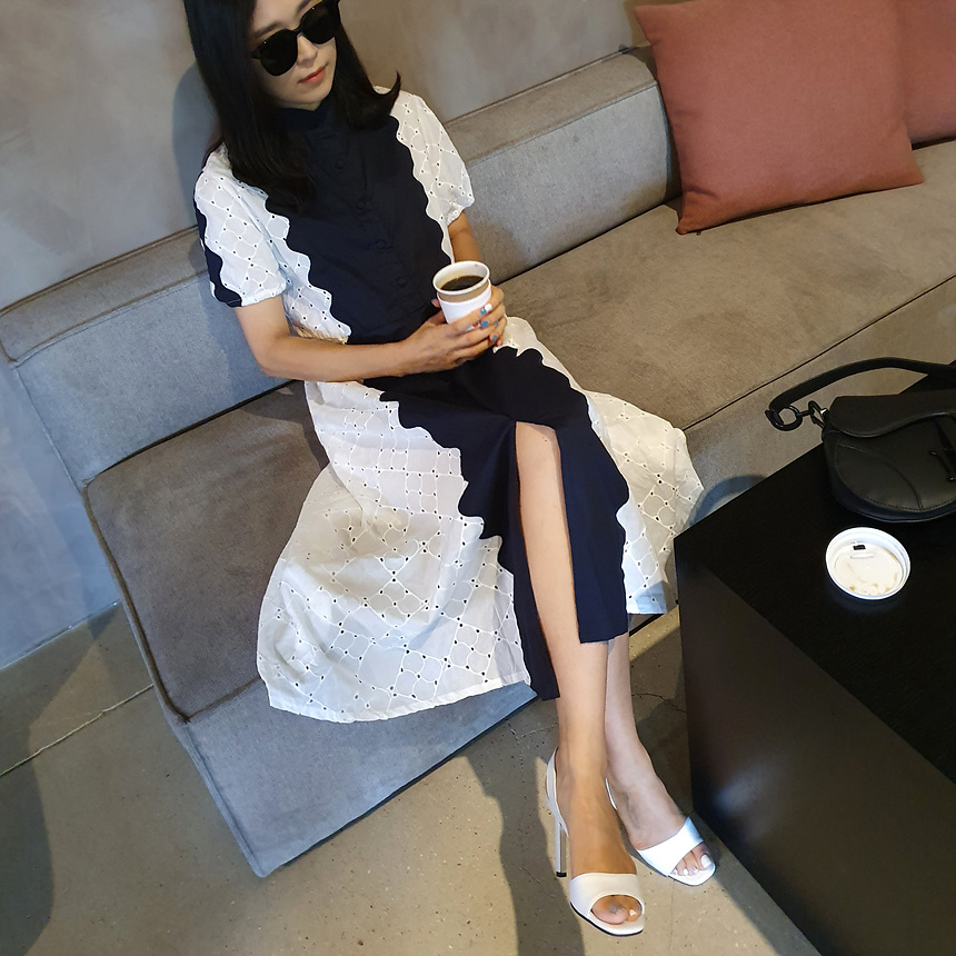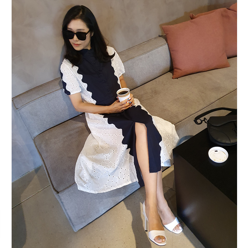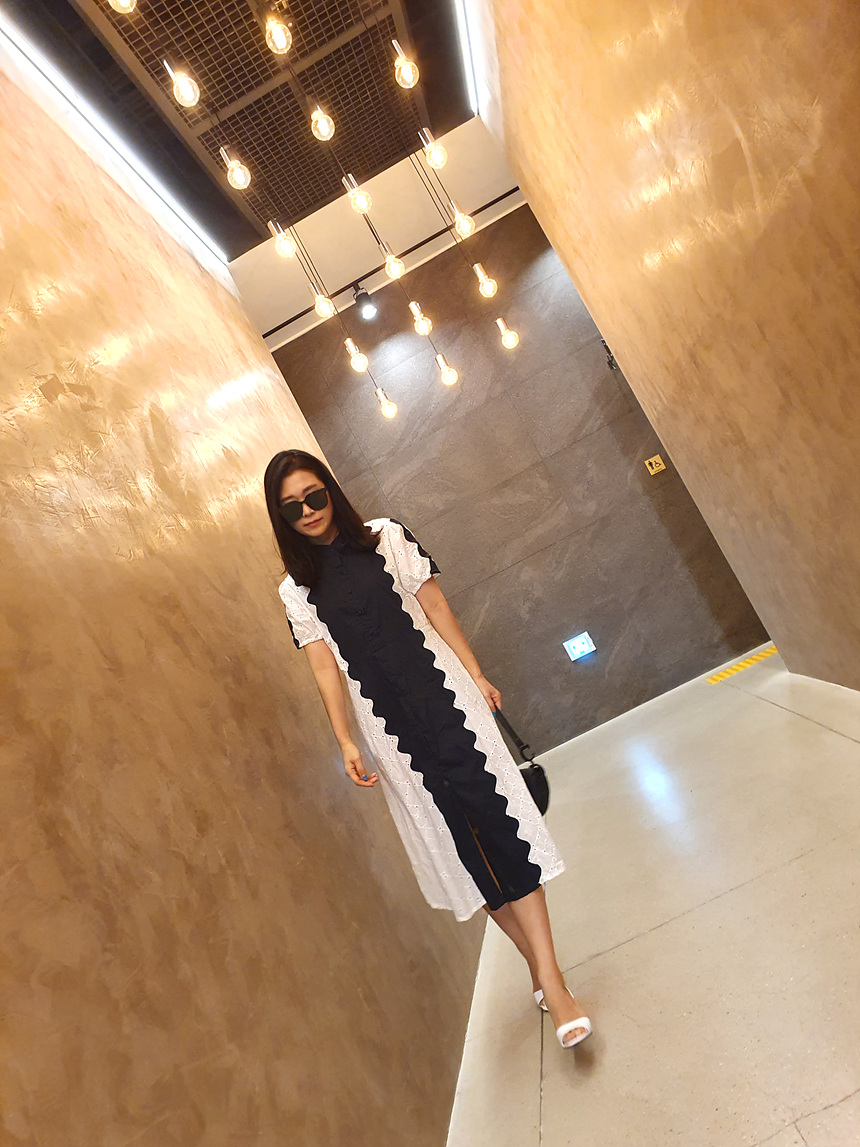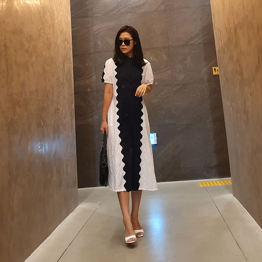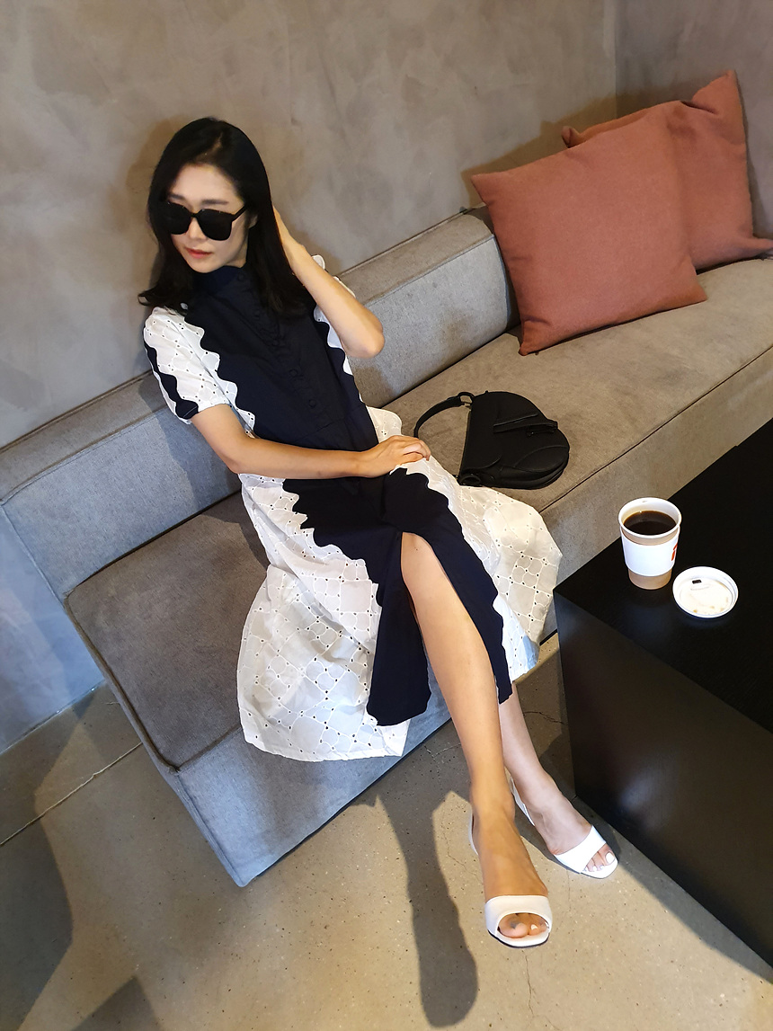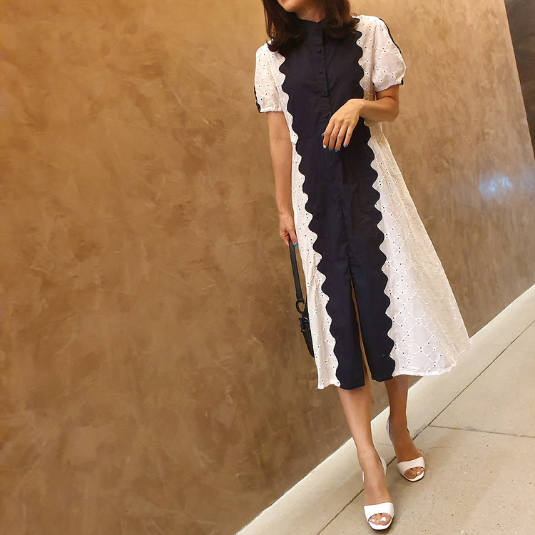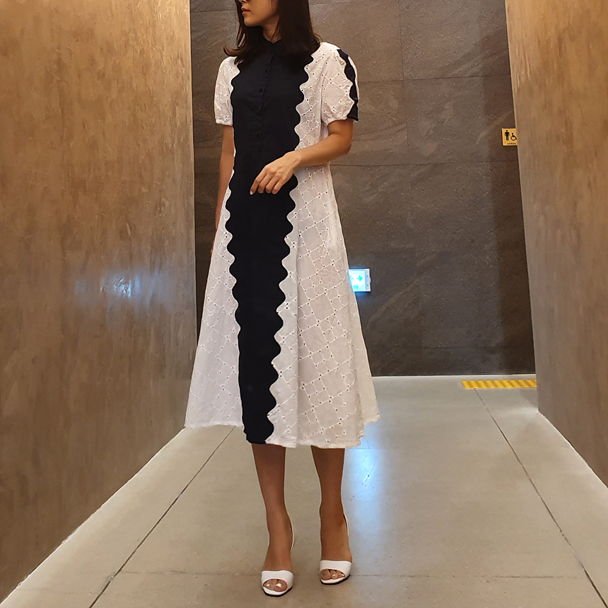 바로발송 투톤 배색 펀칭 레이스 롱 원피스
