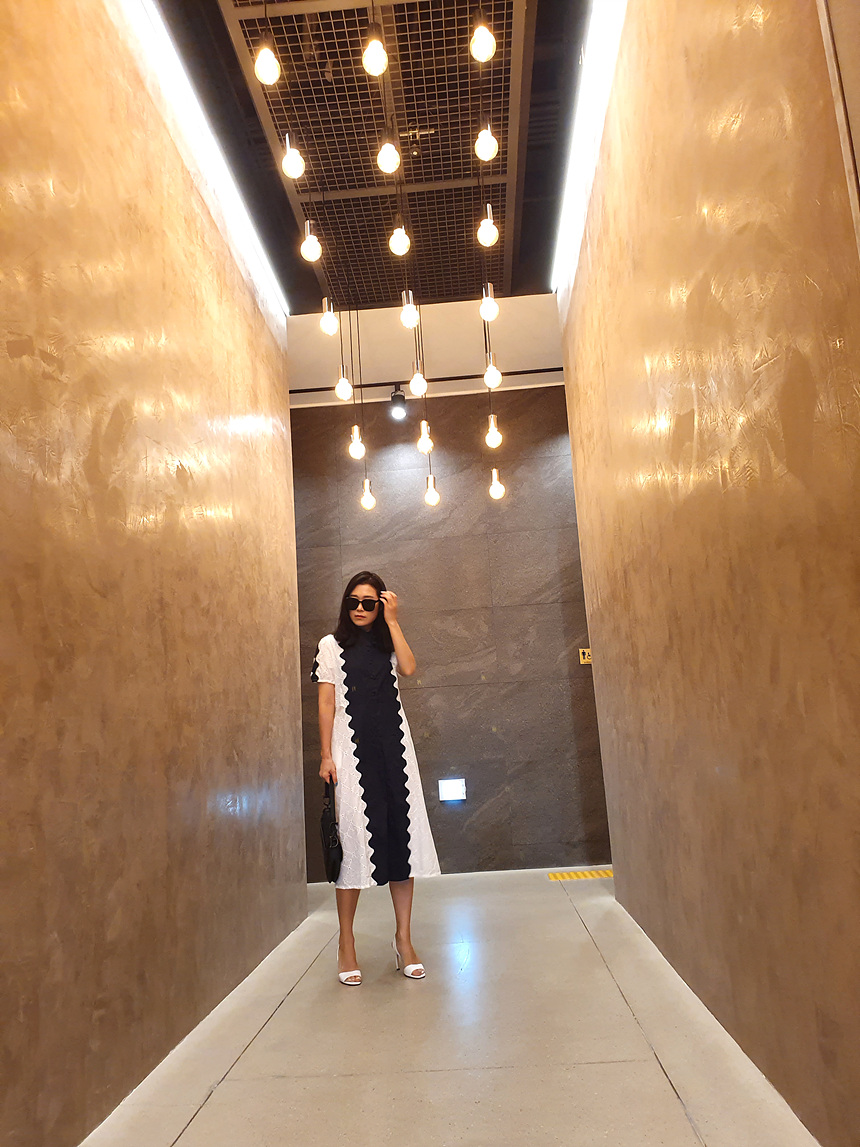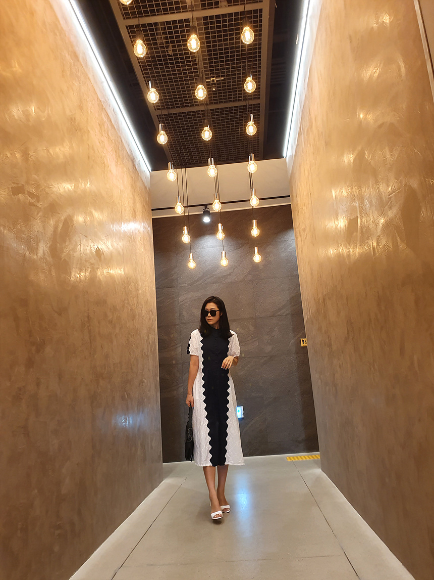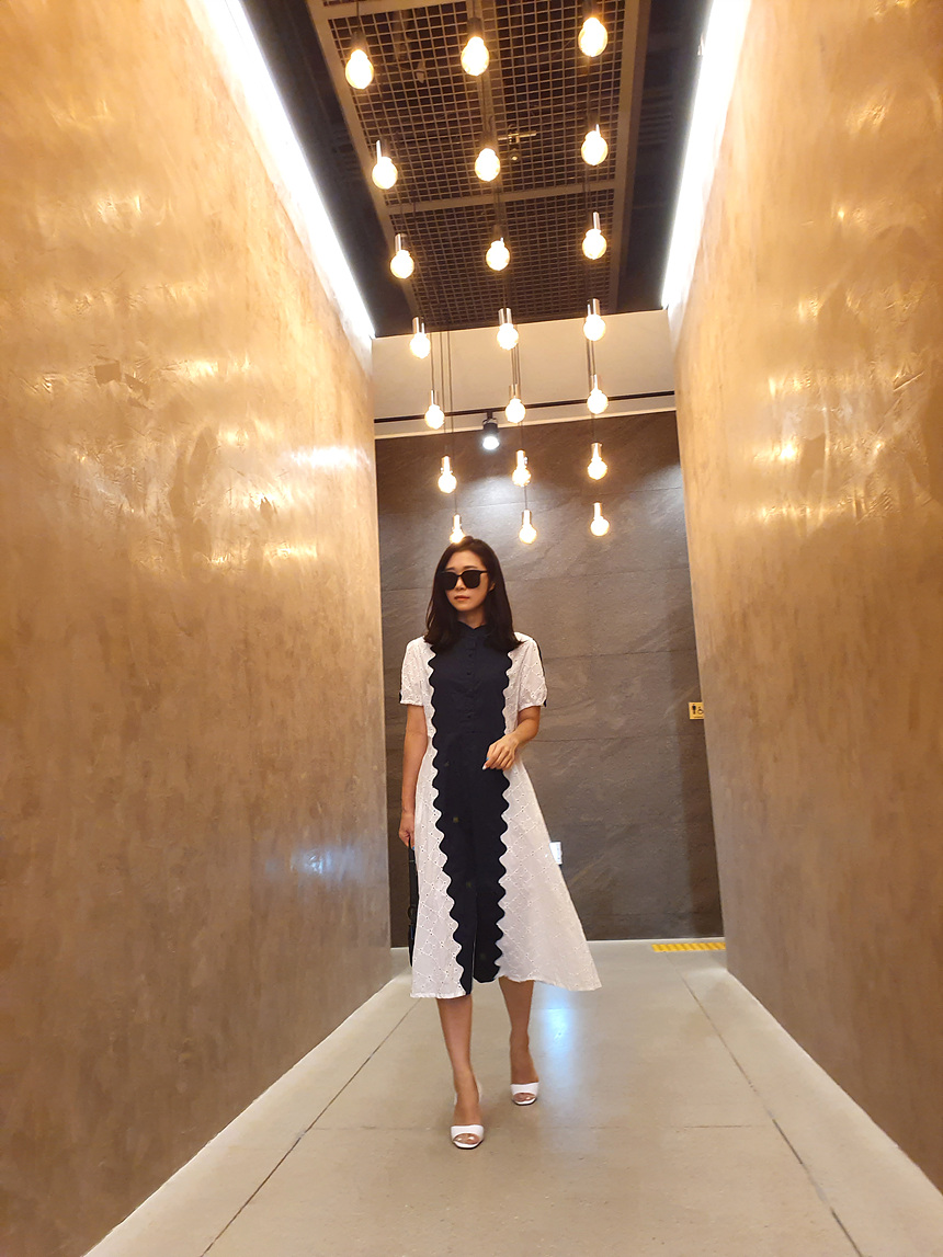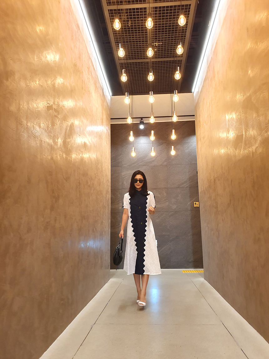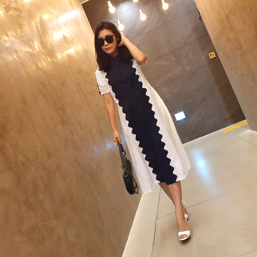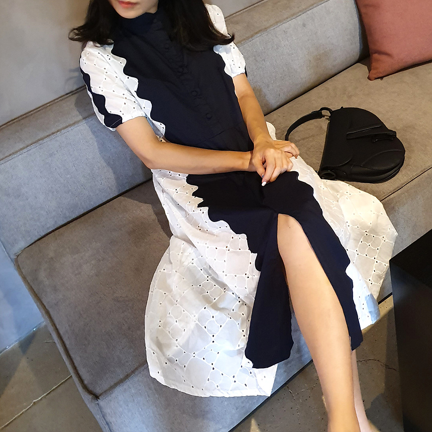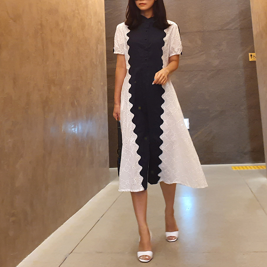바로발송 투톤 배색 펀칭 레이스 롱 원피스