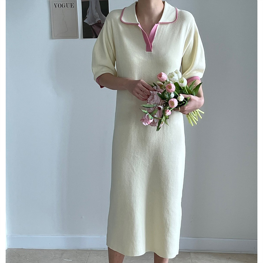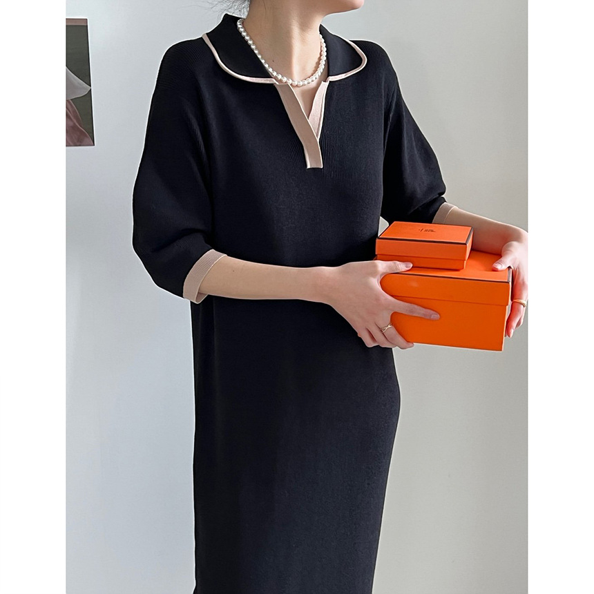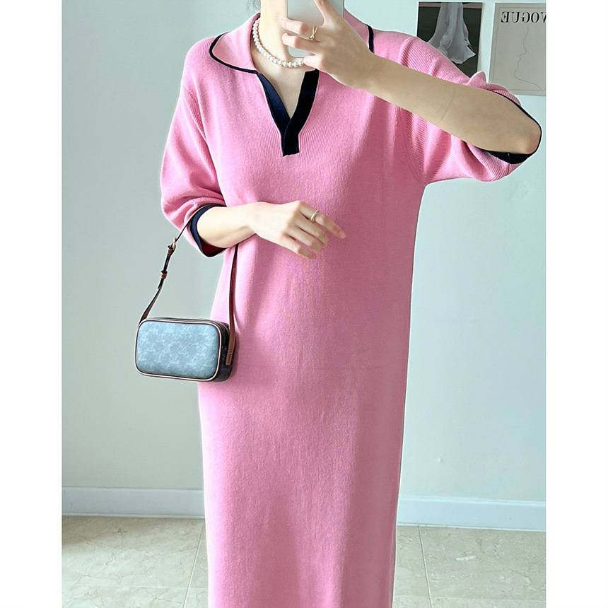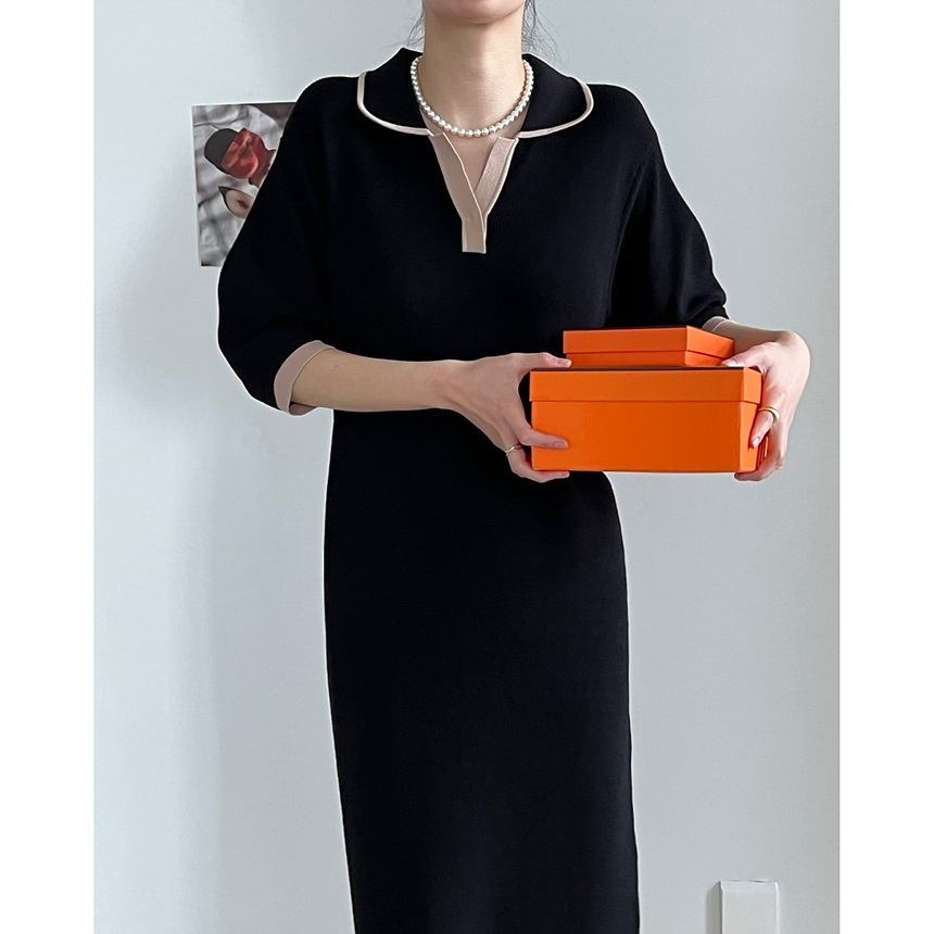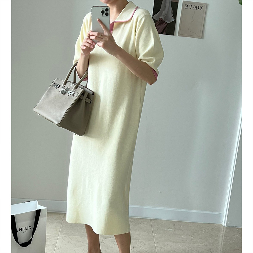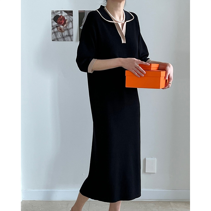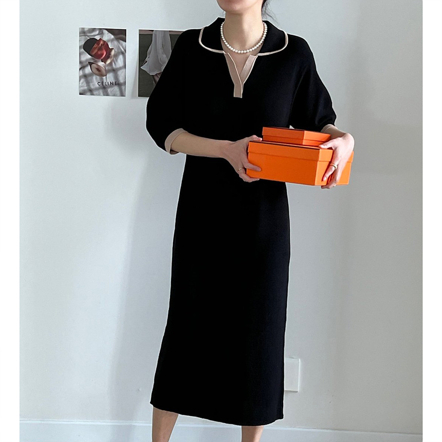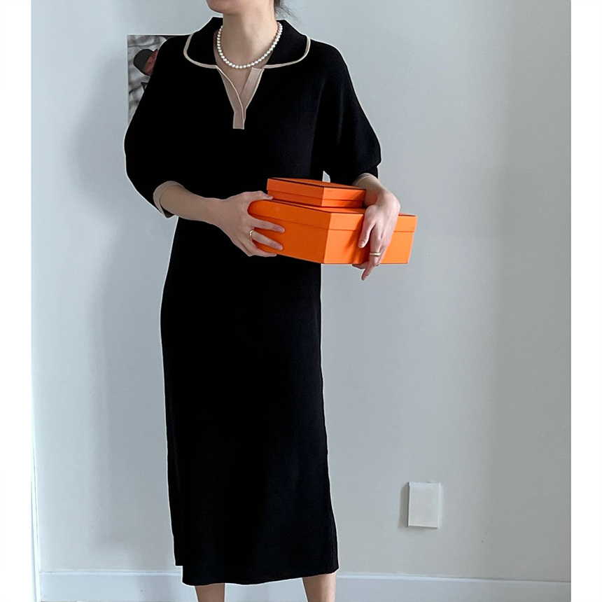 바로발송 엘레강스 볼륨 배색 니트 롱 원피스