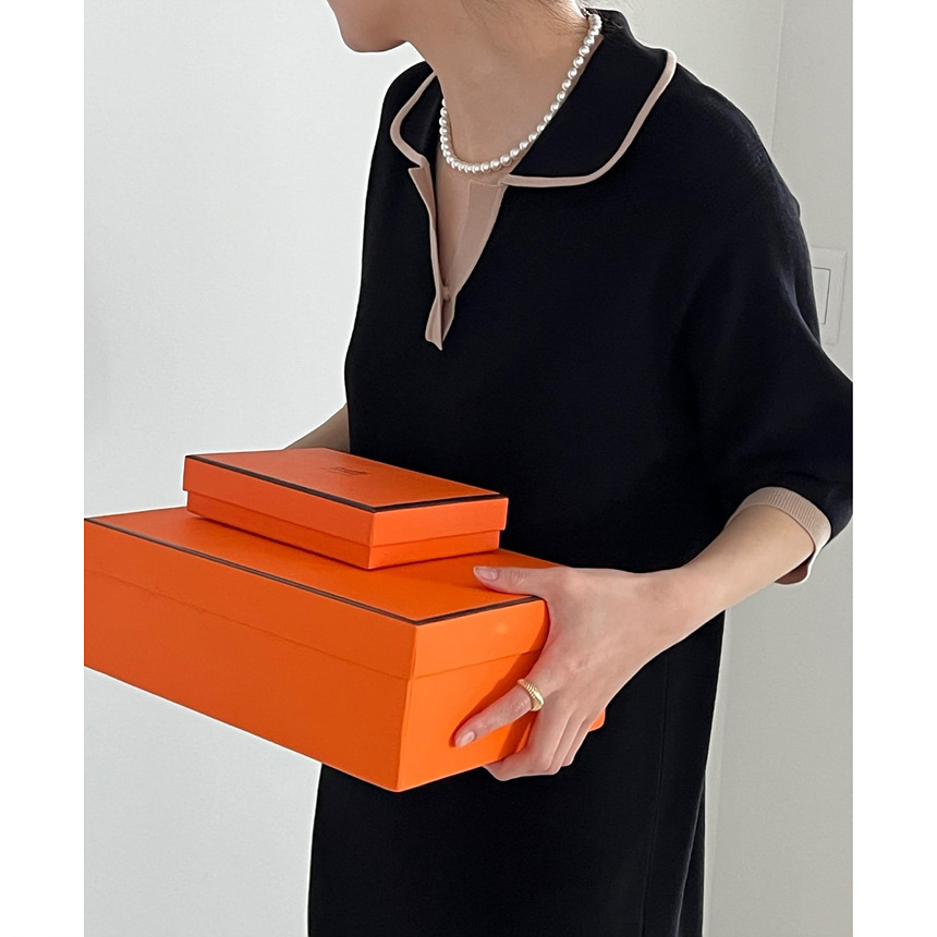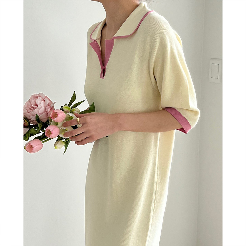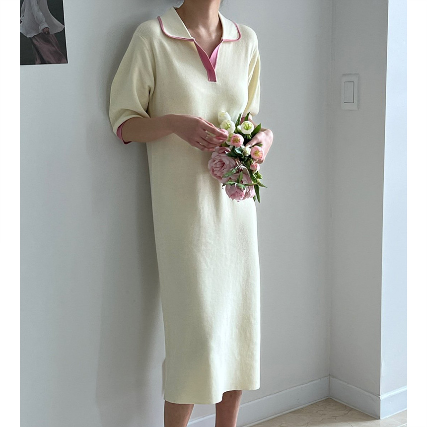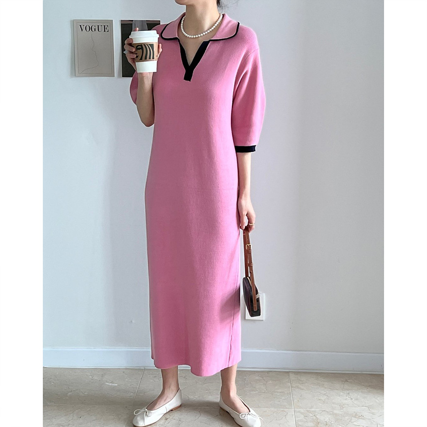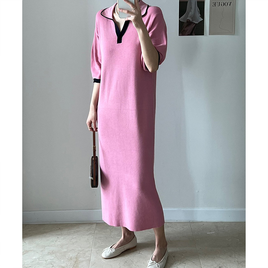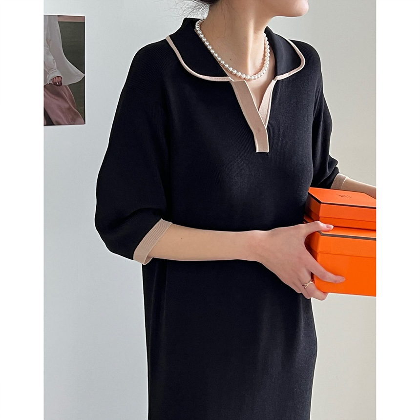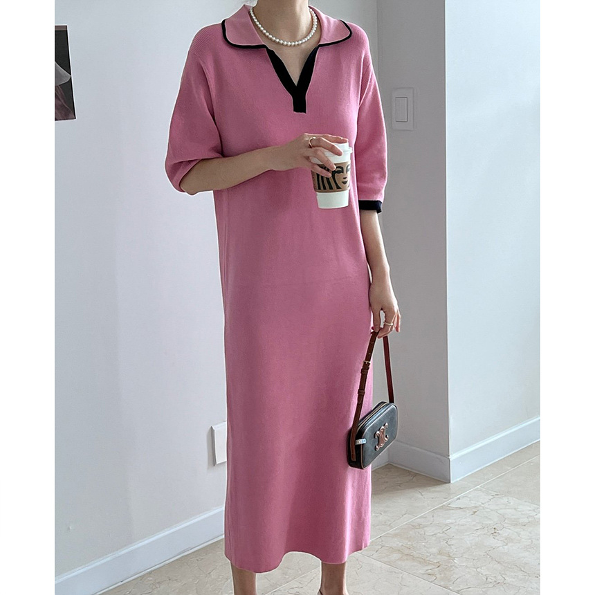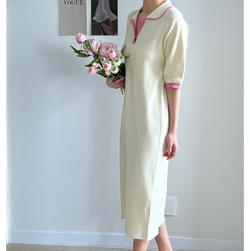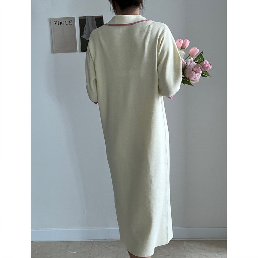 바로발송 엘레강스 볼륨 배색 니트 롱 원피스