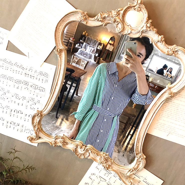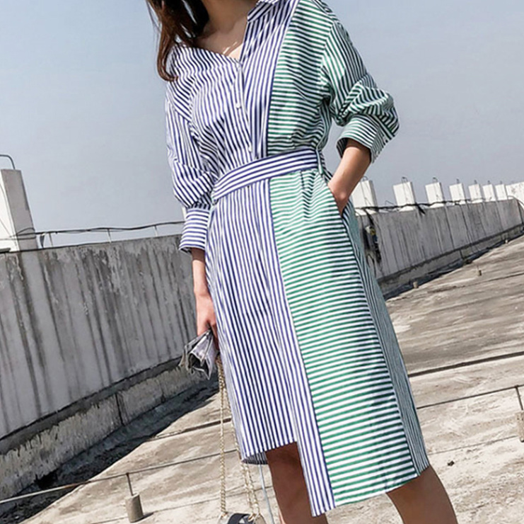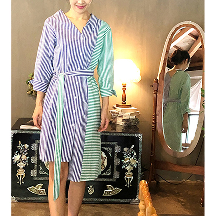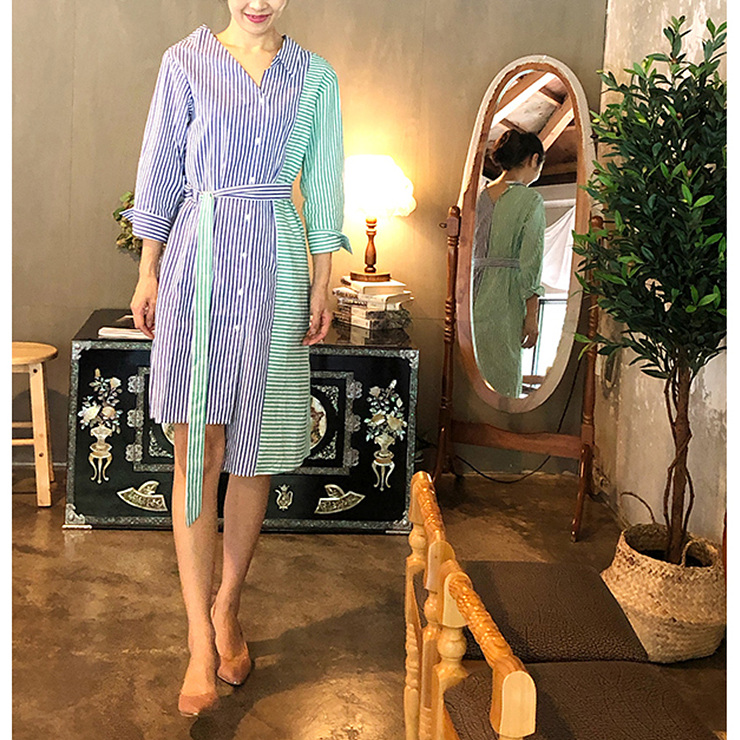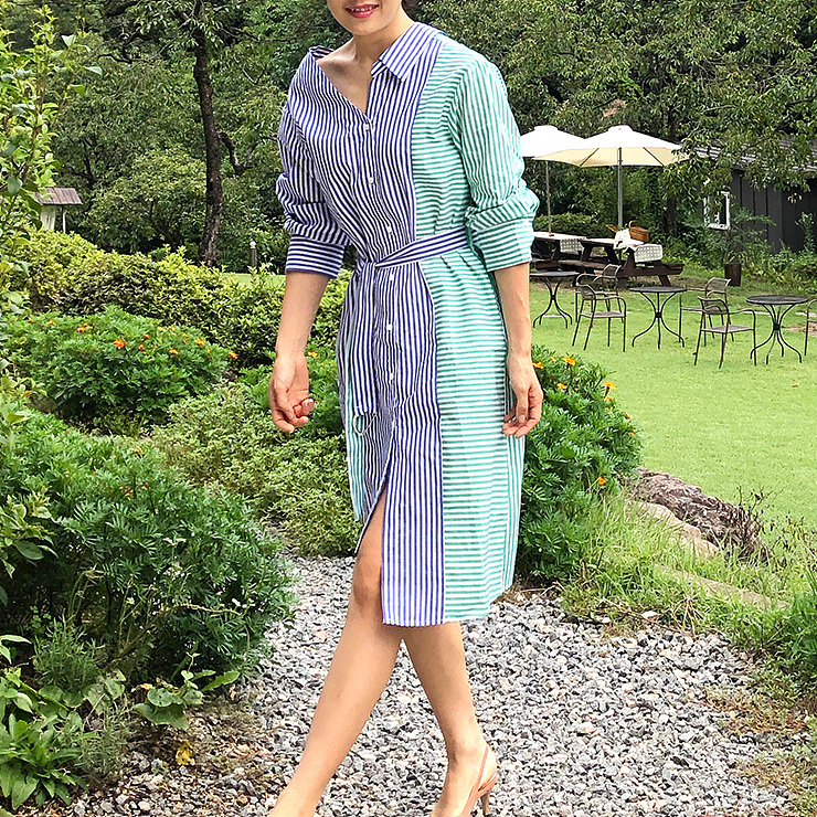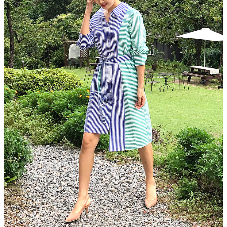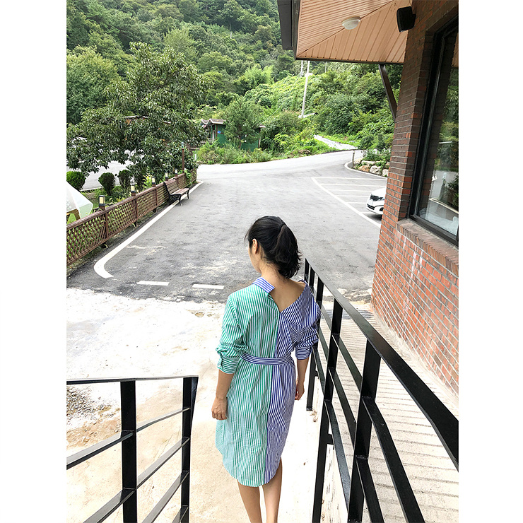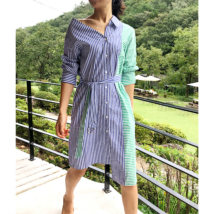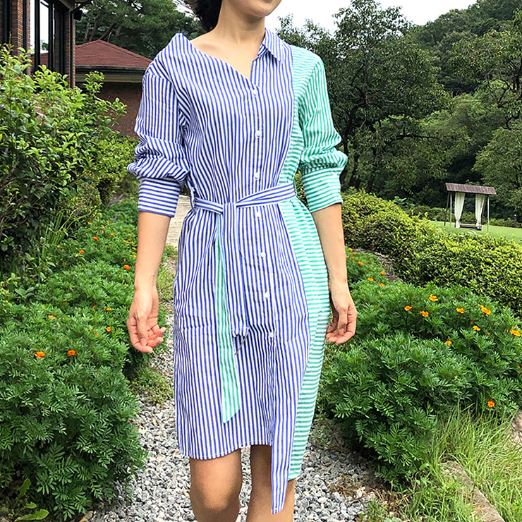 창고정리 / 바로발송 유니크 언발 스트라이프 셔츠 원피스