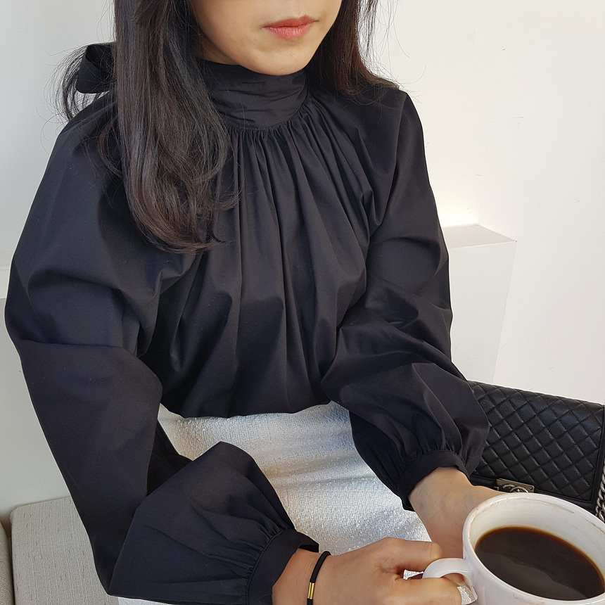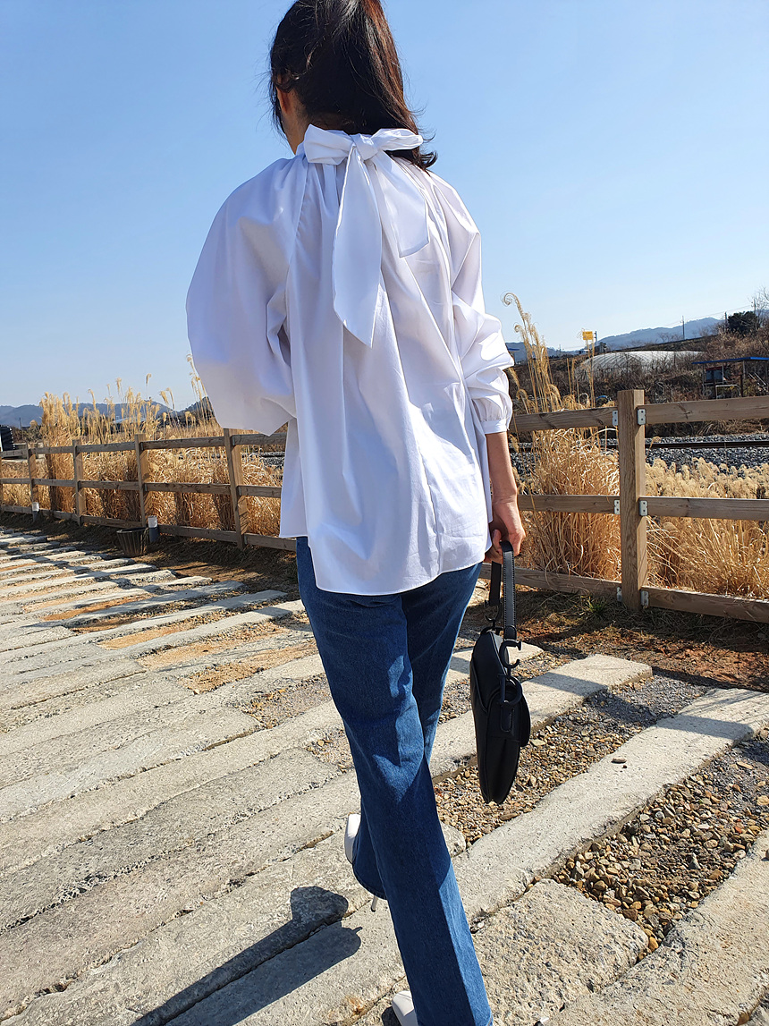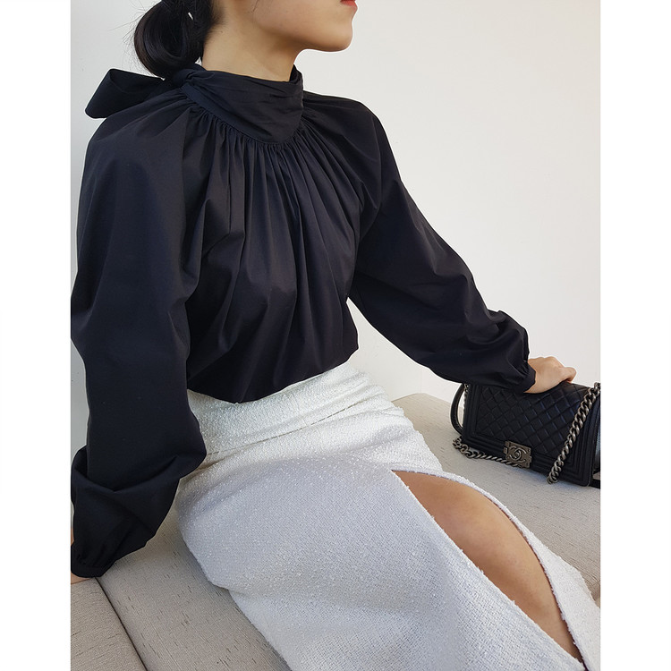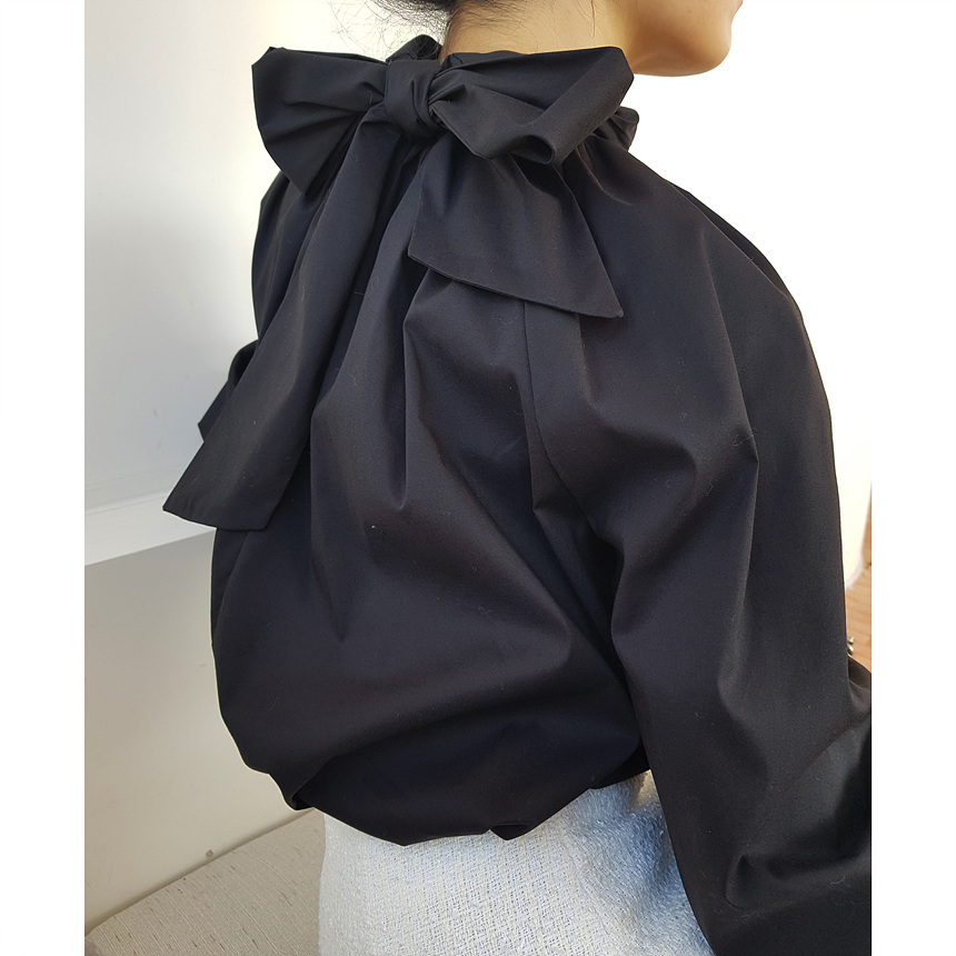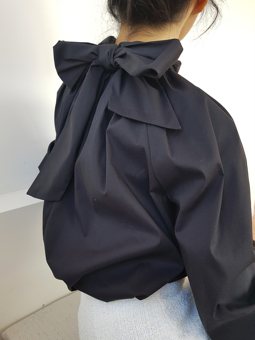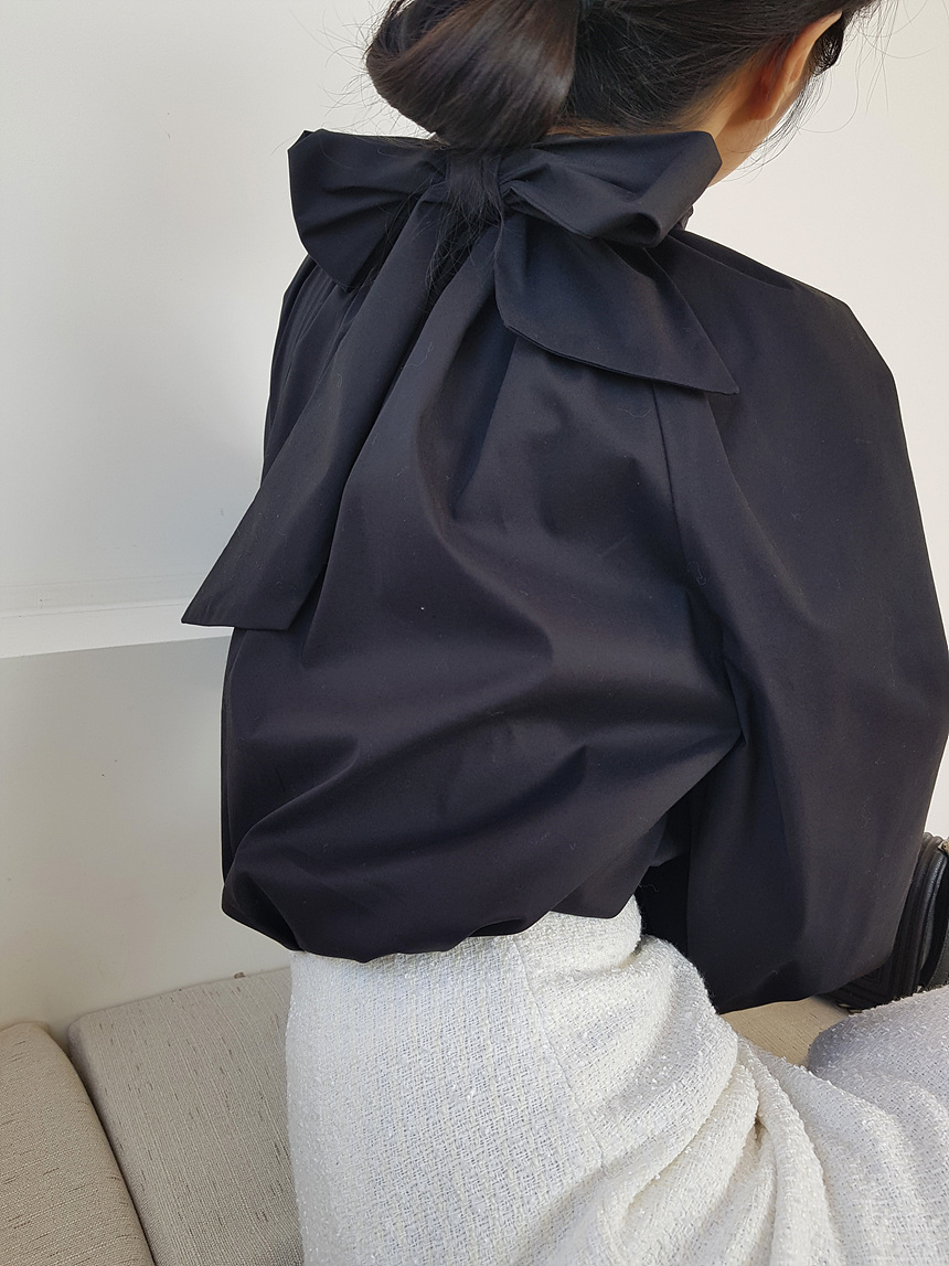 바로발송 루즈핏 볼륨 셔링 리본 블라우스