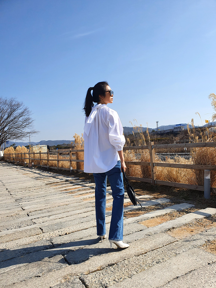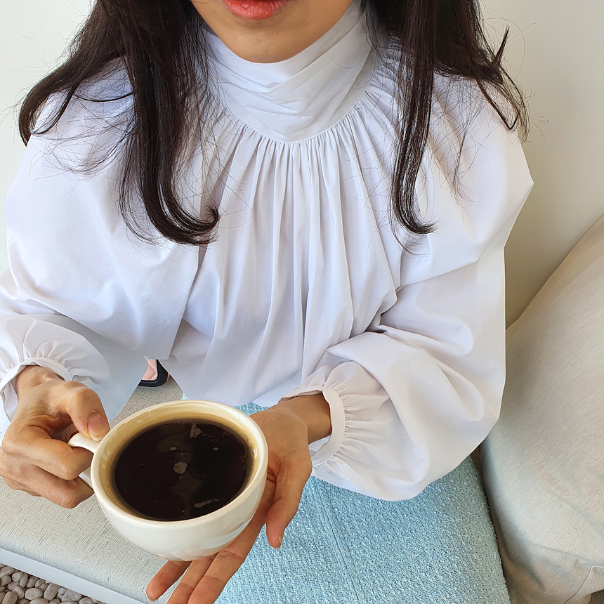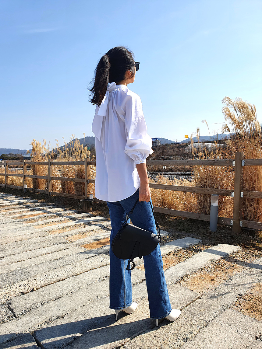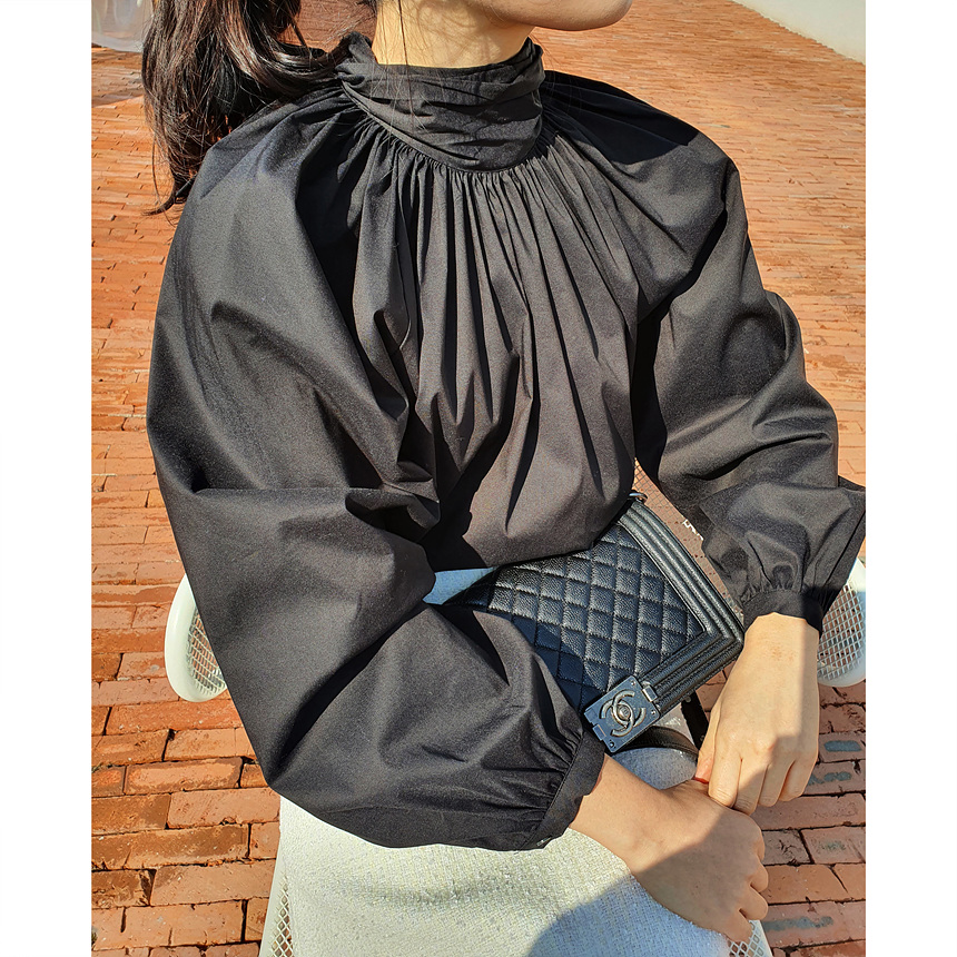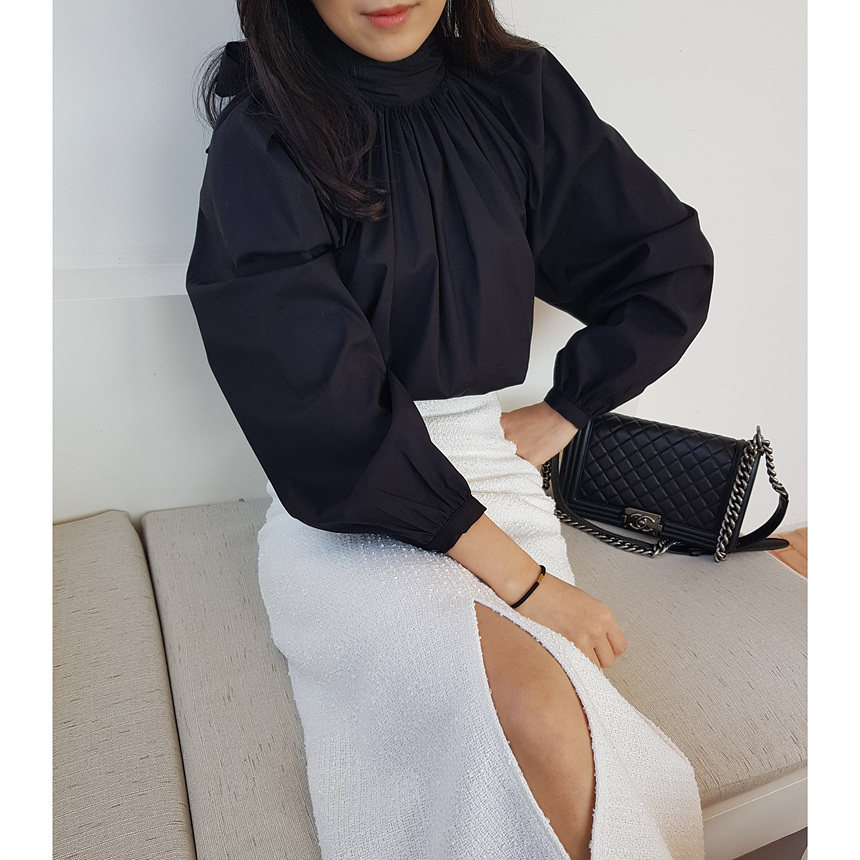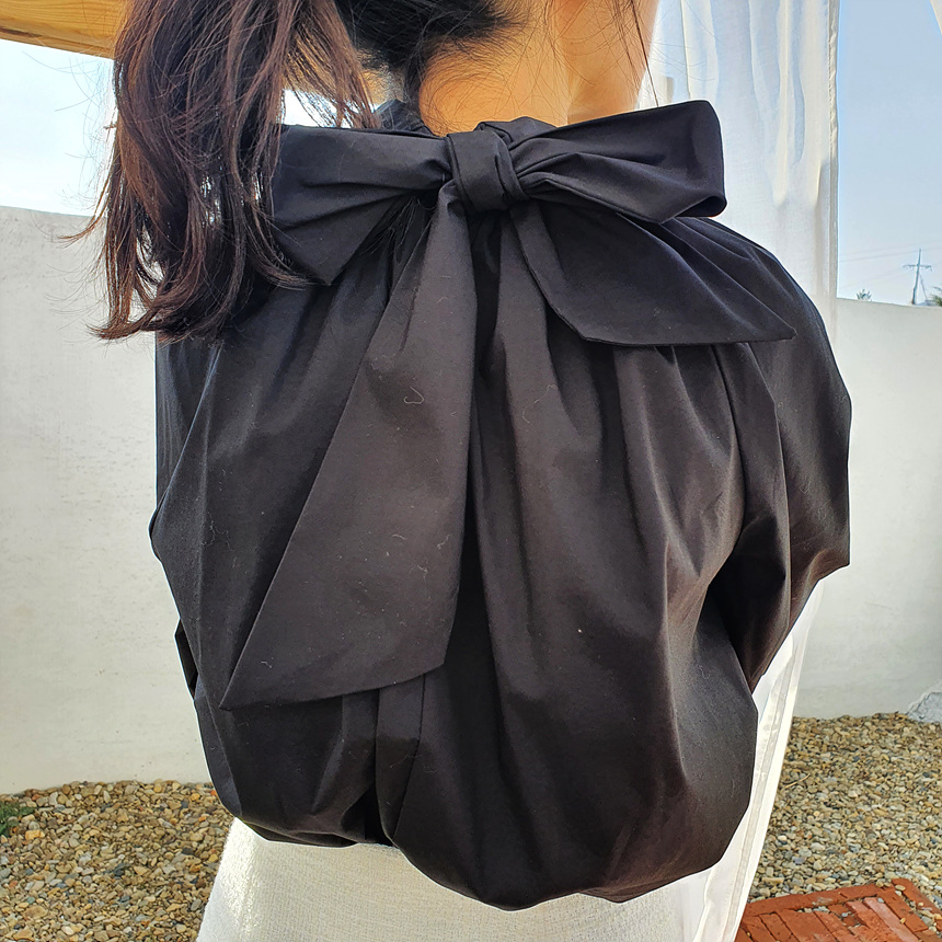 바로발송 루즈핏 볼륨 셔링 리본 블라우스
