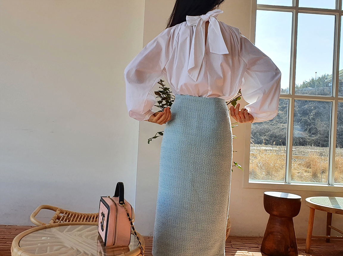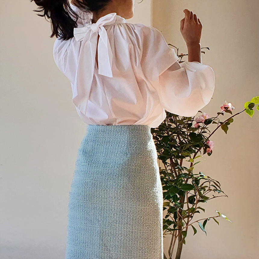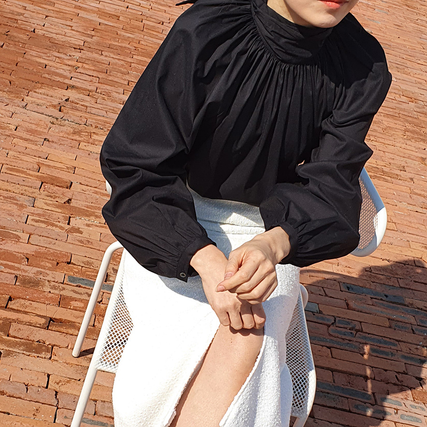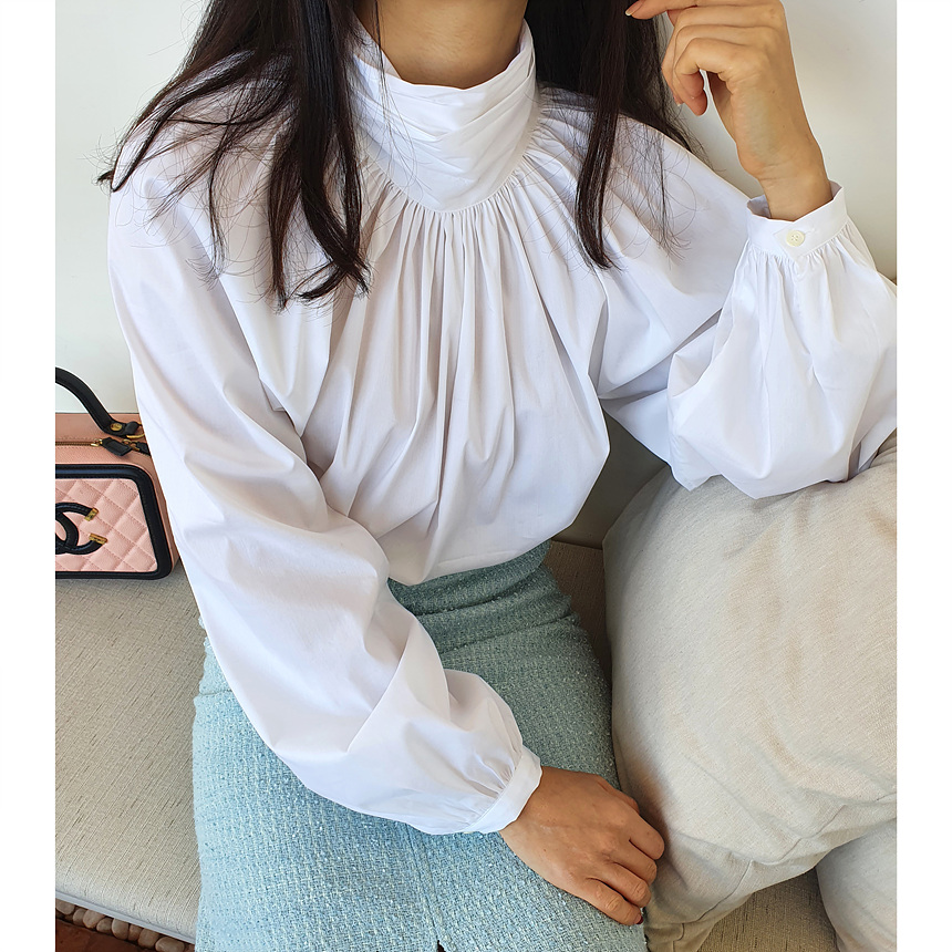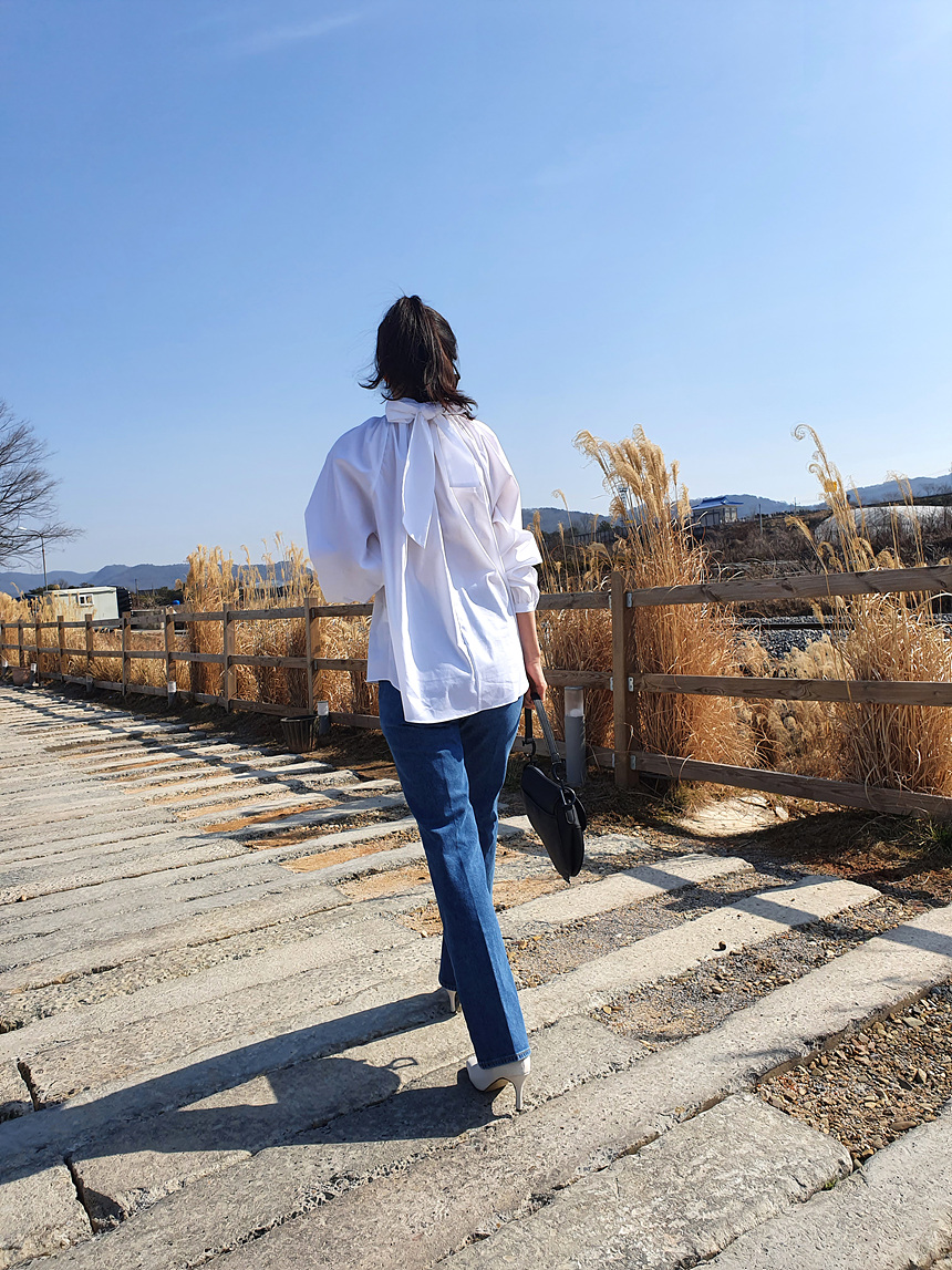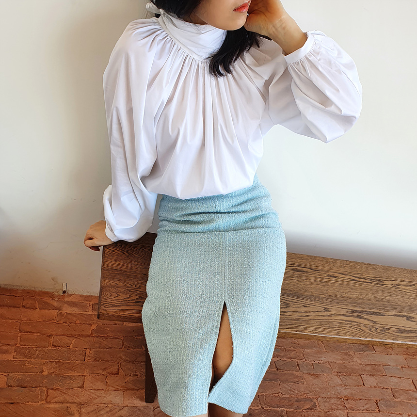 바로발송 루즈핏 볼륨 셔링 리본 블라우스