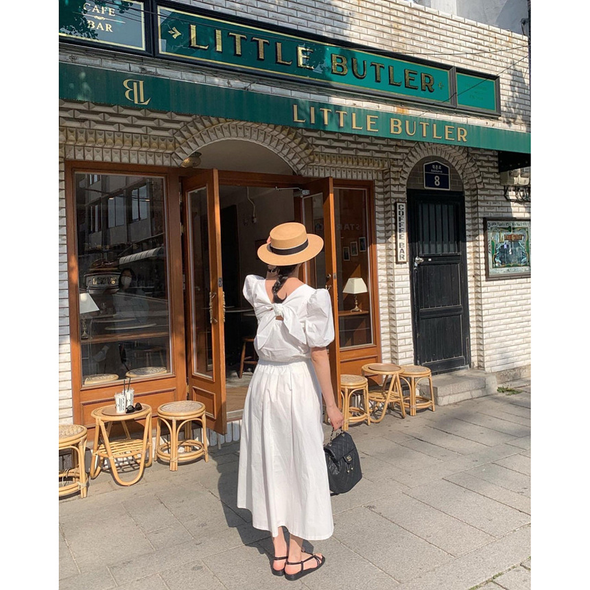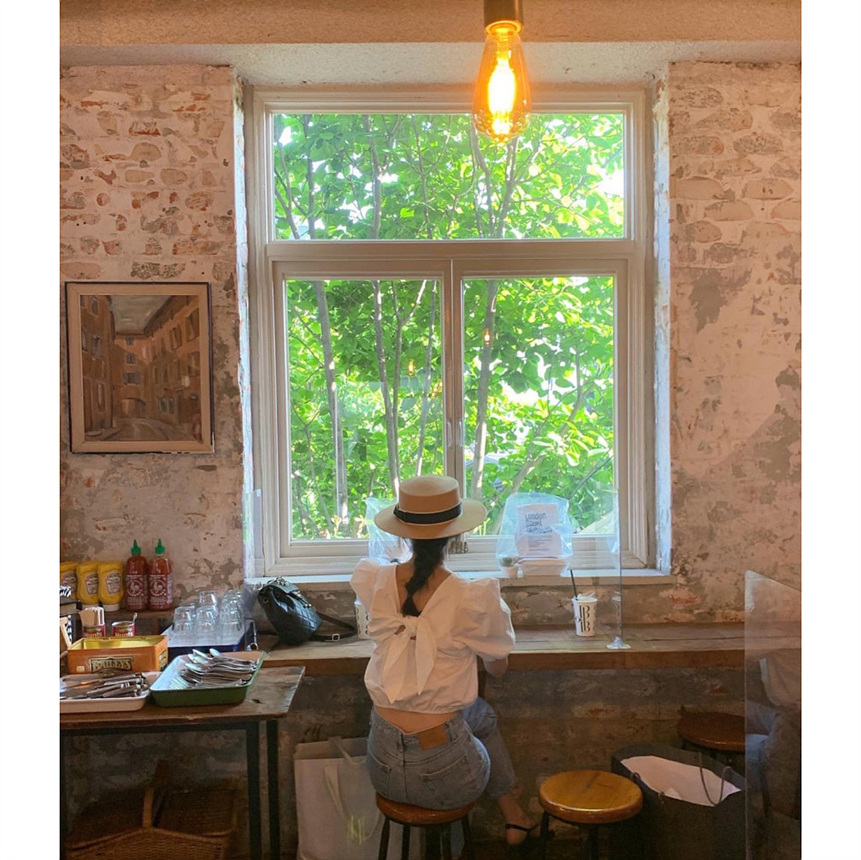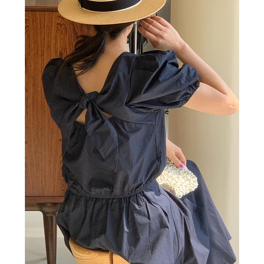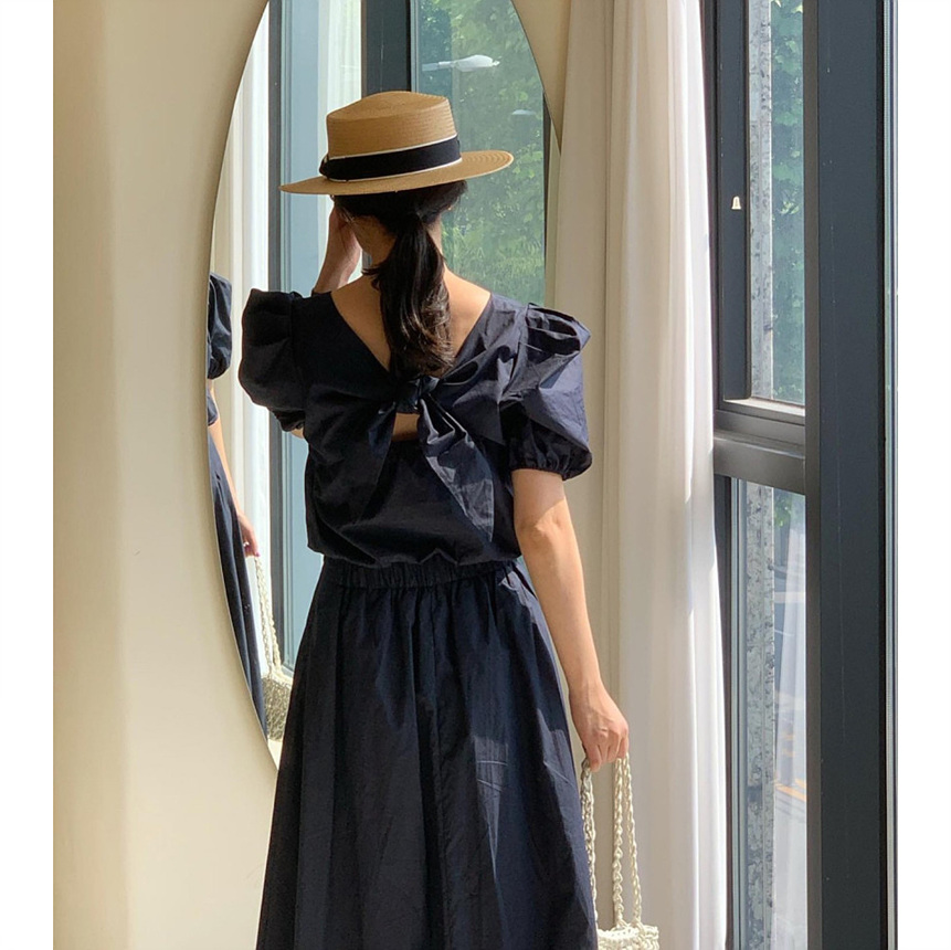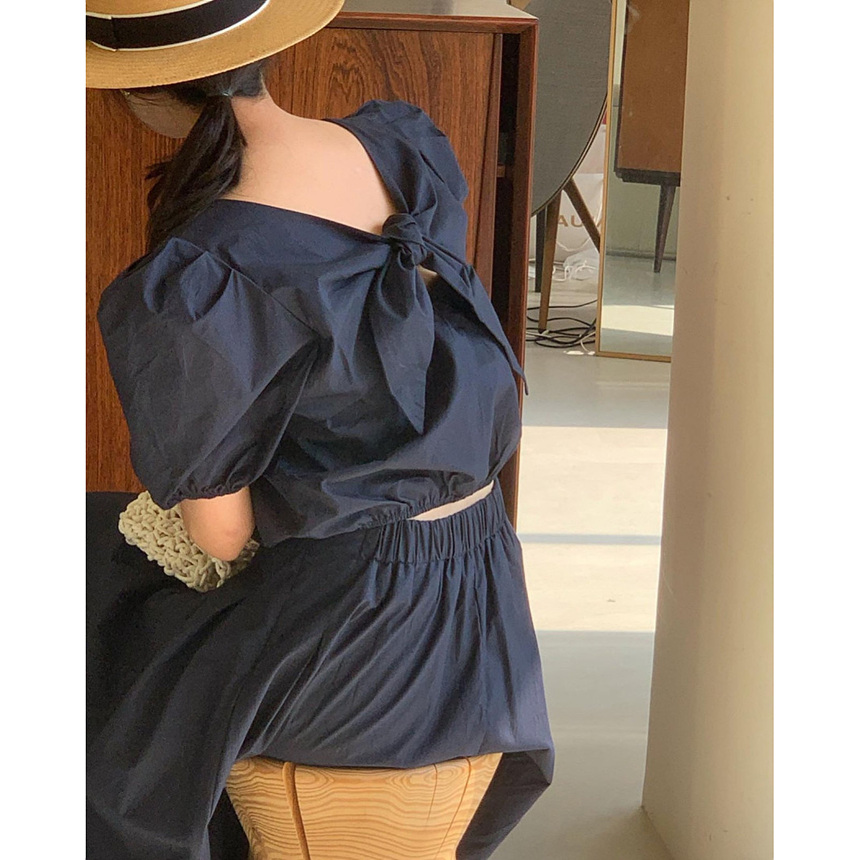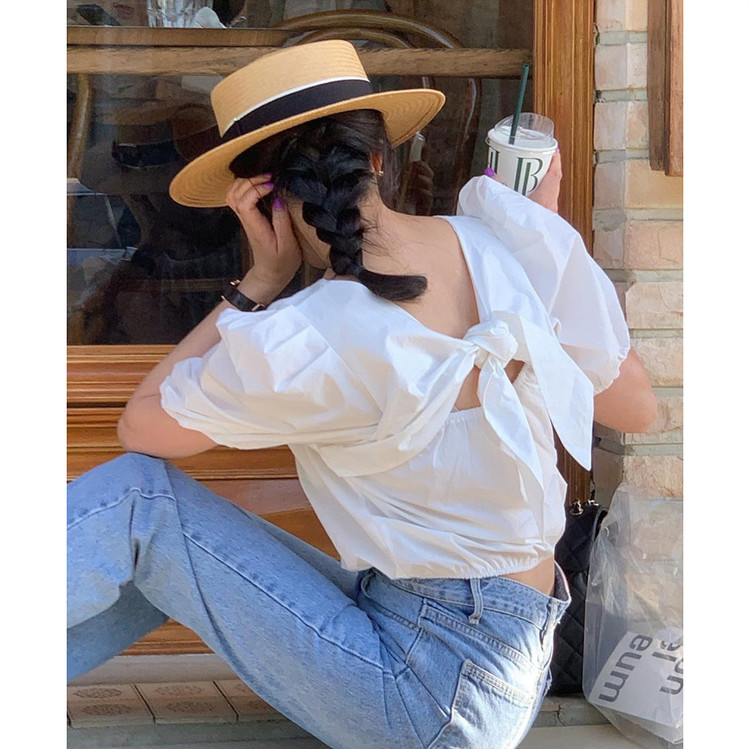 바로발송 시아 뒷리본 셔링 크롭 블라우스
