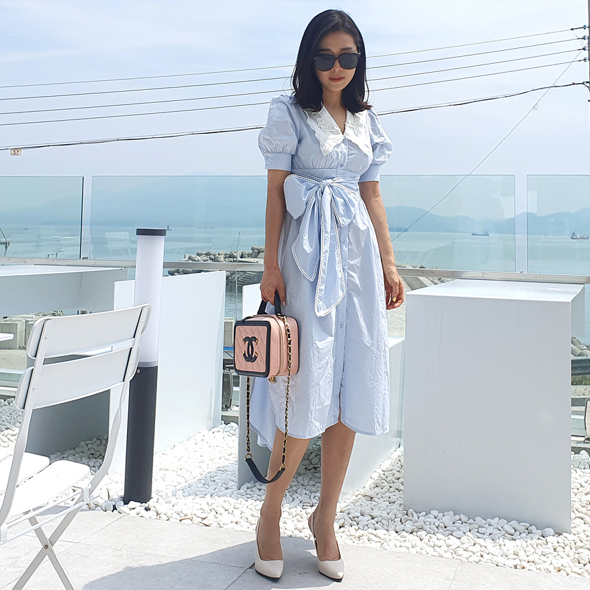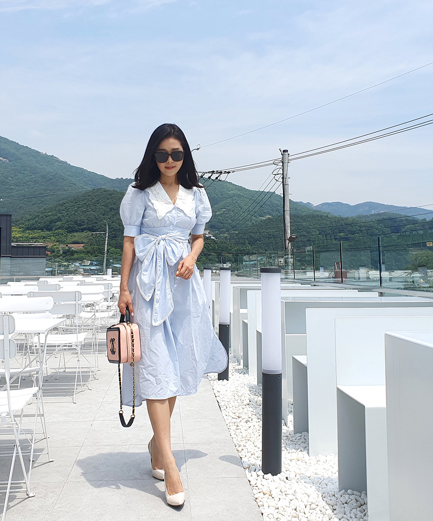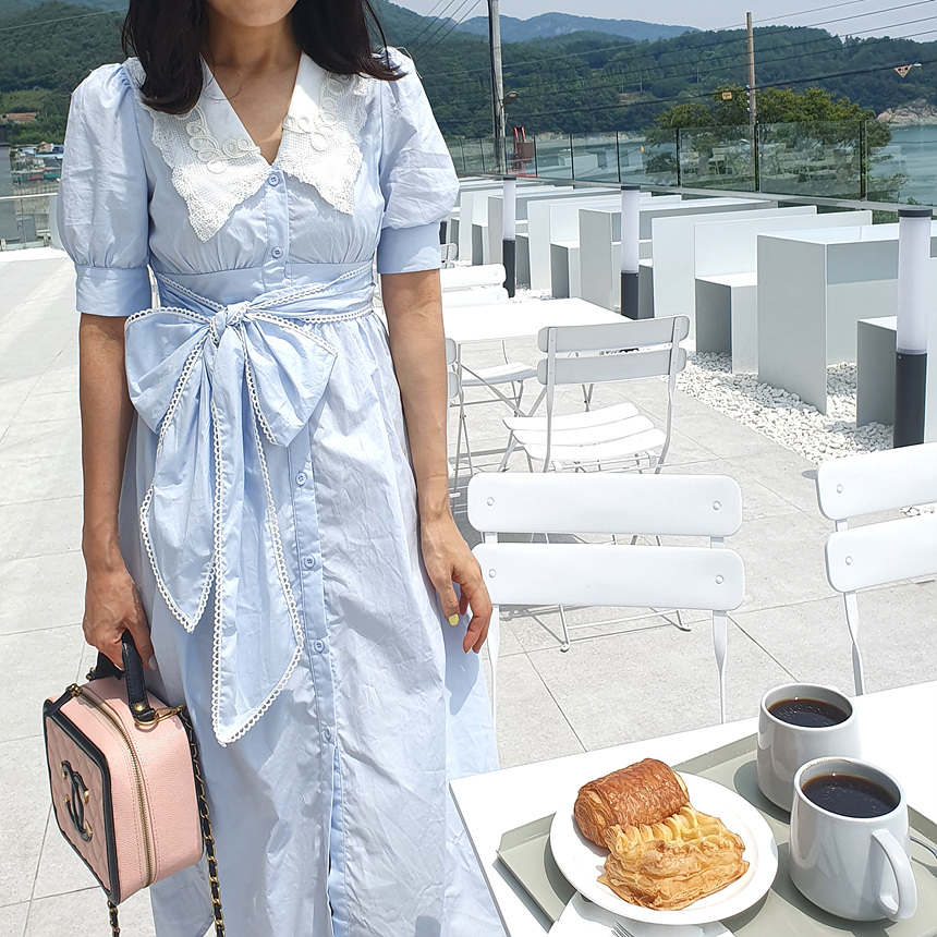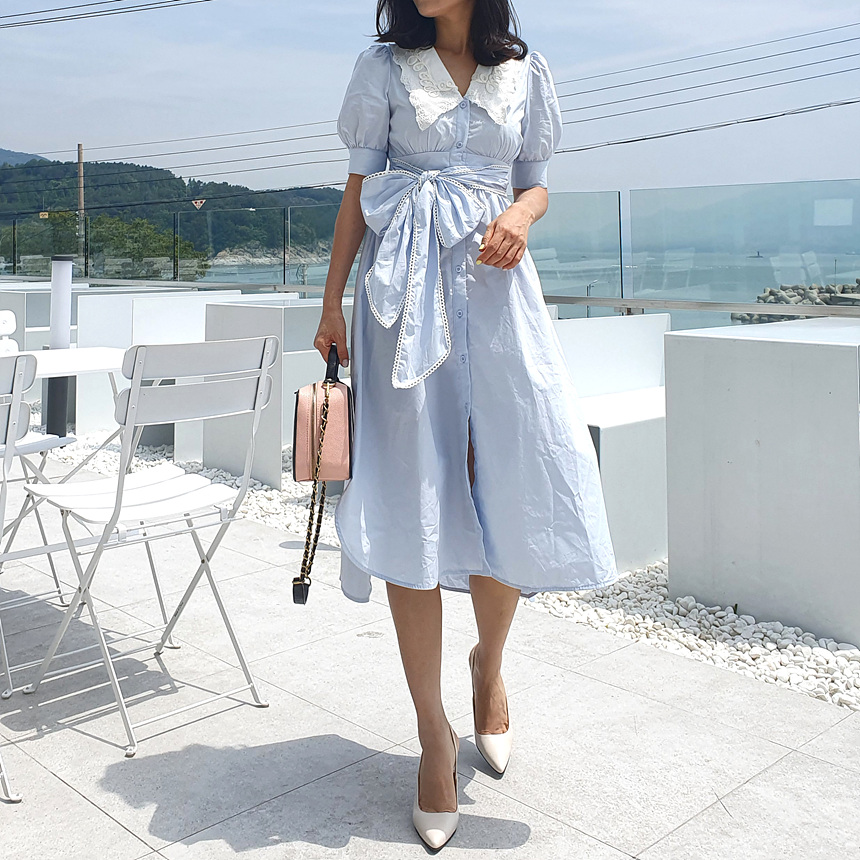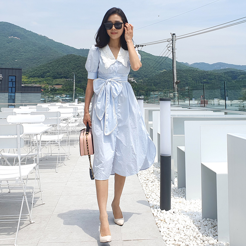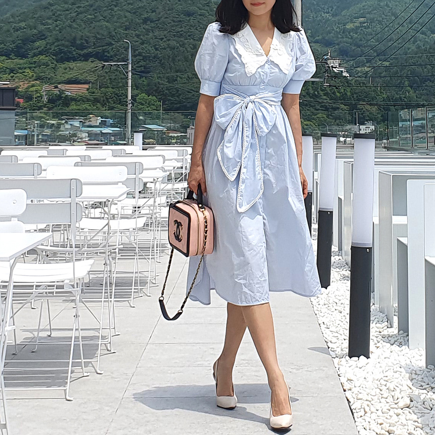 빅 카라 자수 리본 원피스