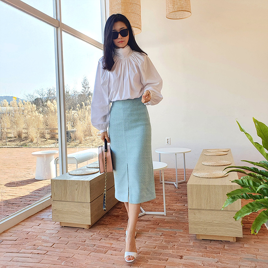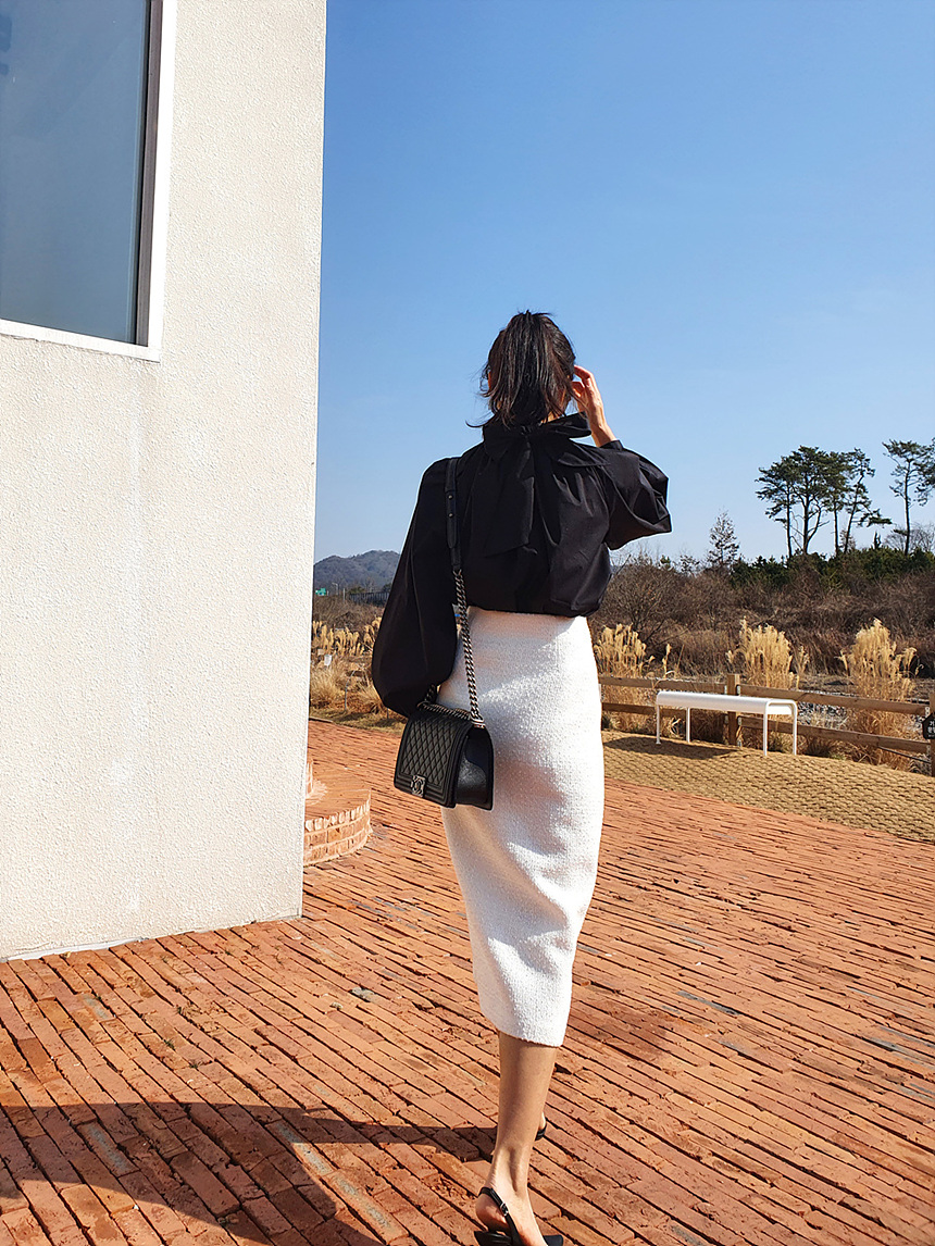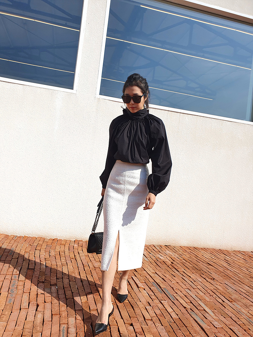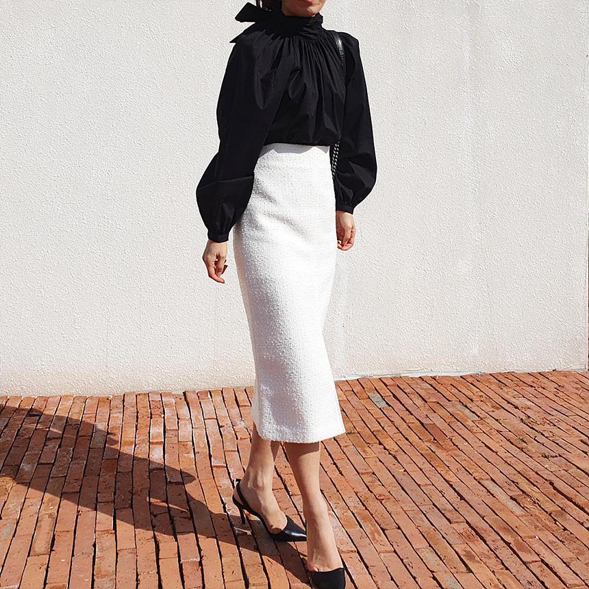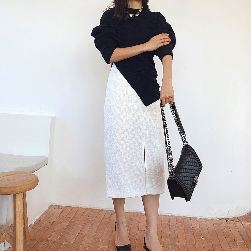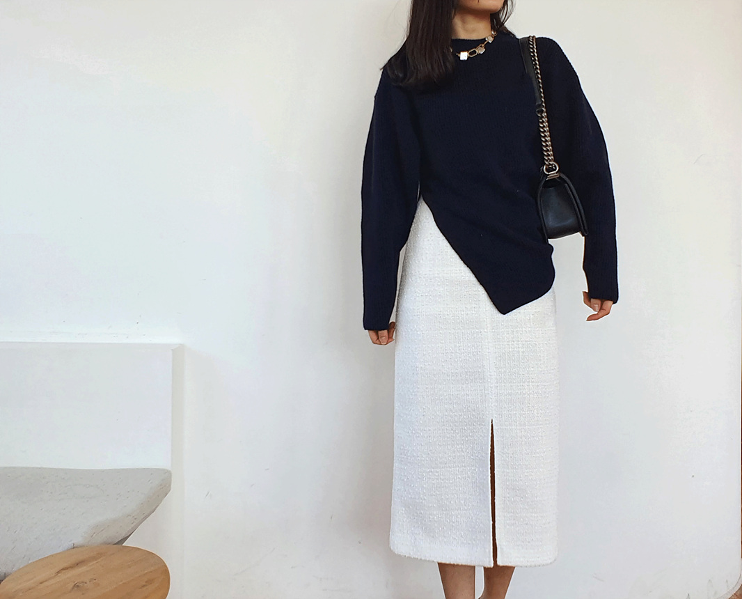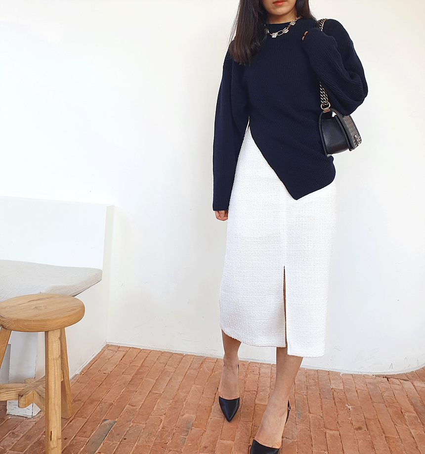에이치 라인에 미디보다는 살짝 긴 미디 롱 스커트로