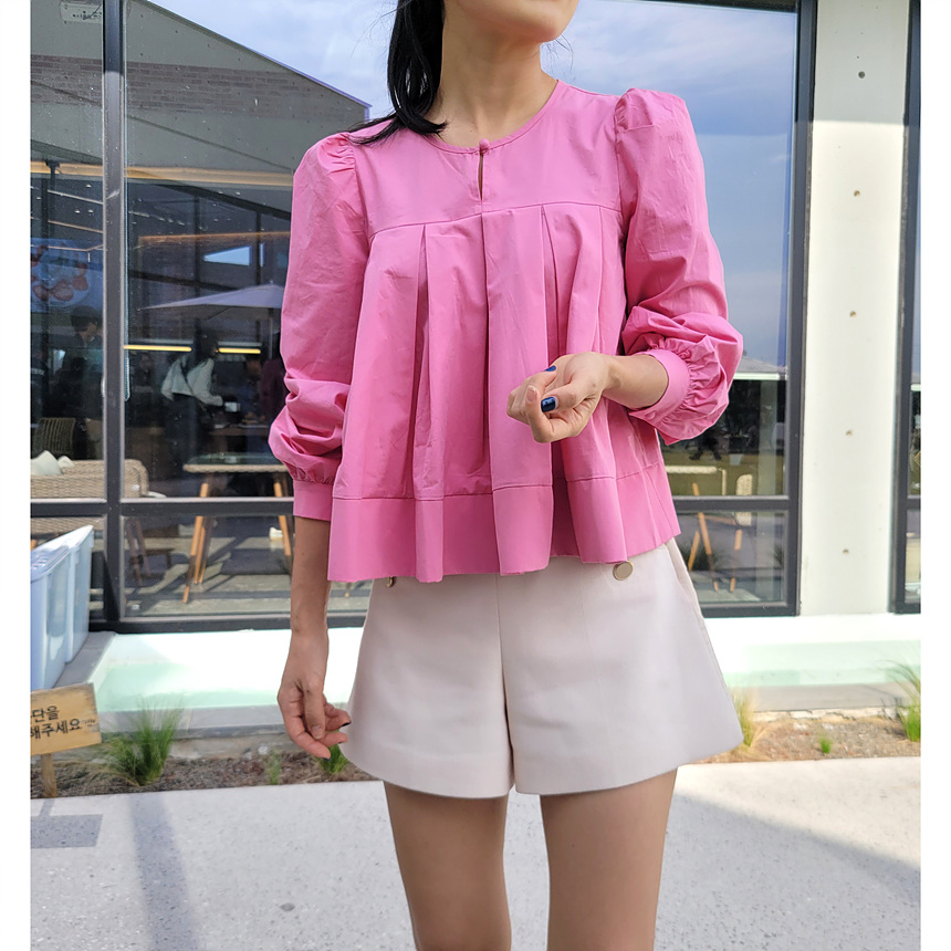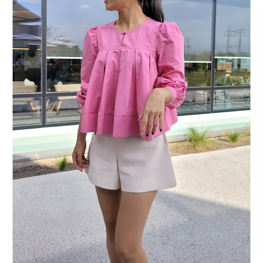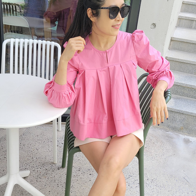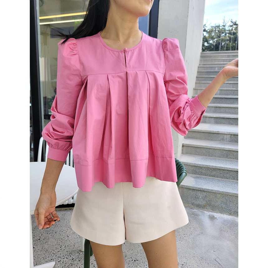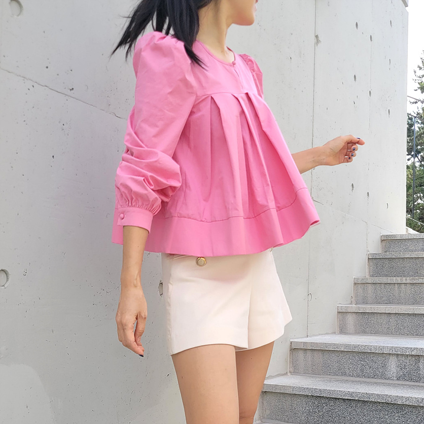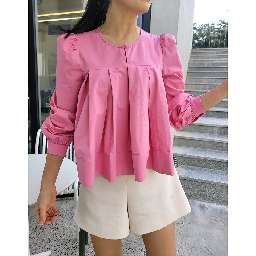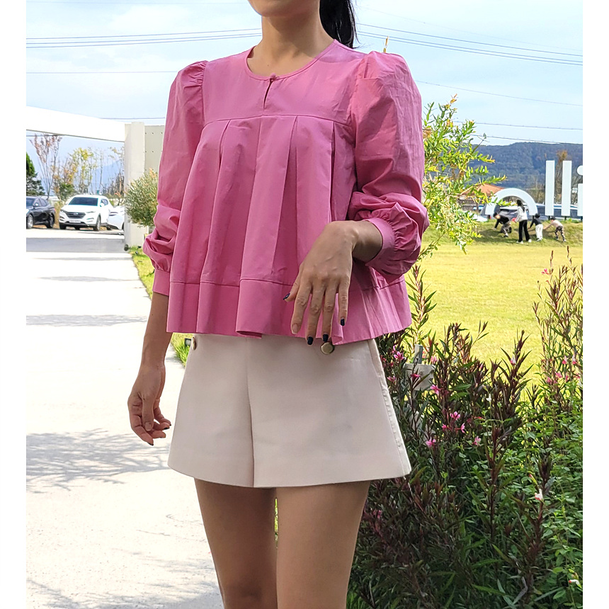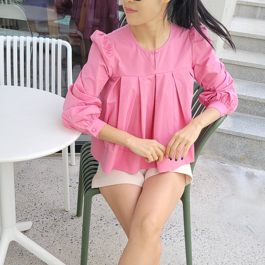 바로발송 핑크 핀턱 훌 라운드 블라우스
