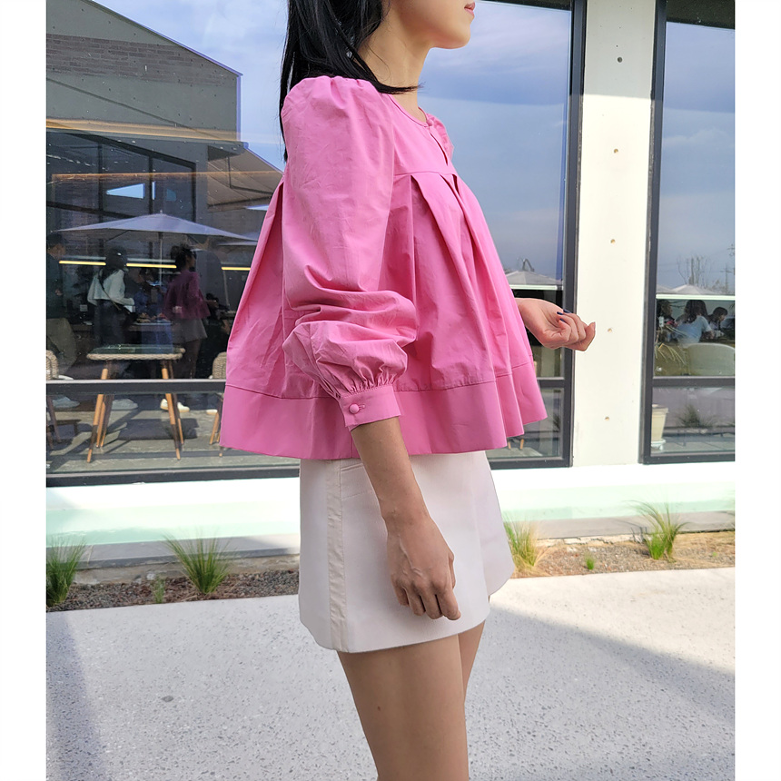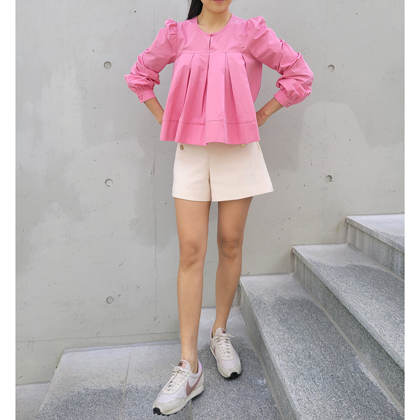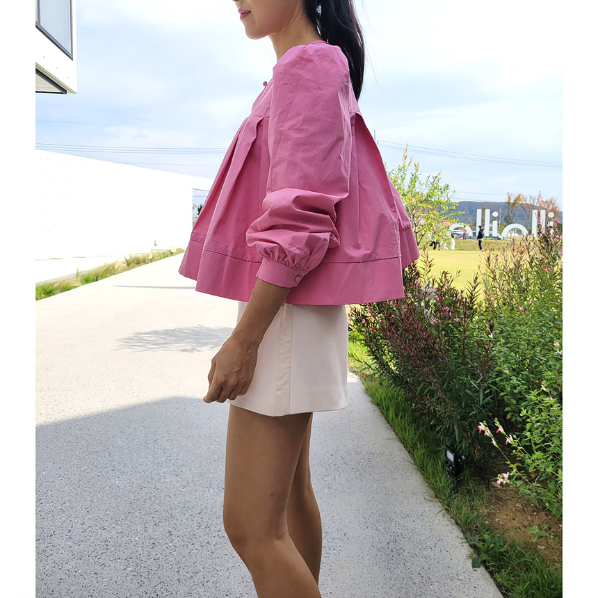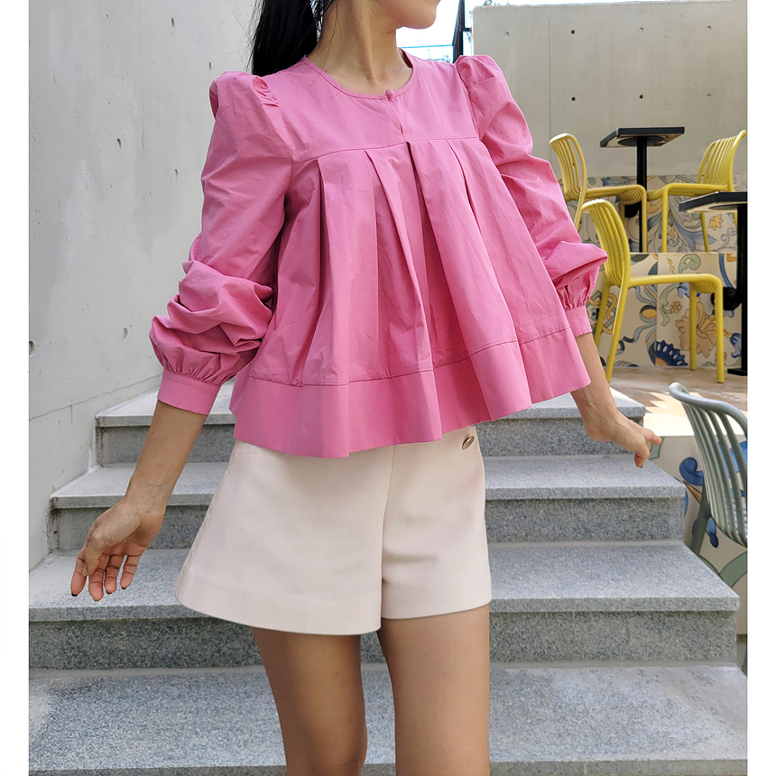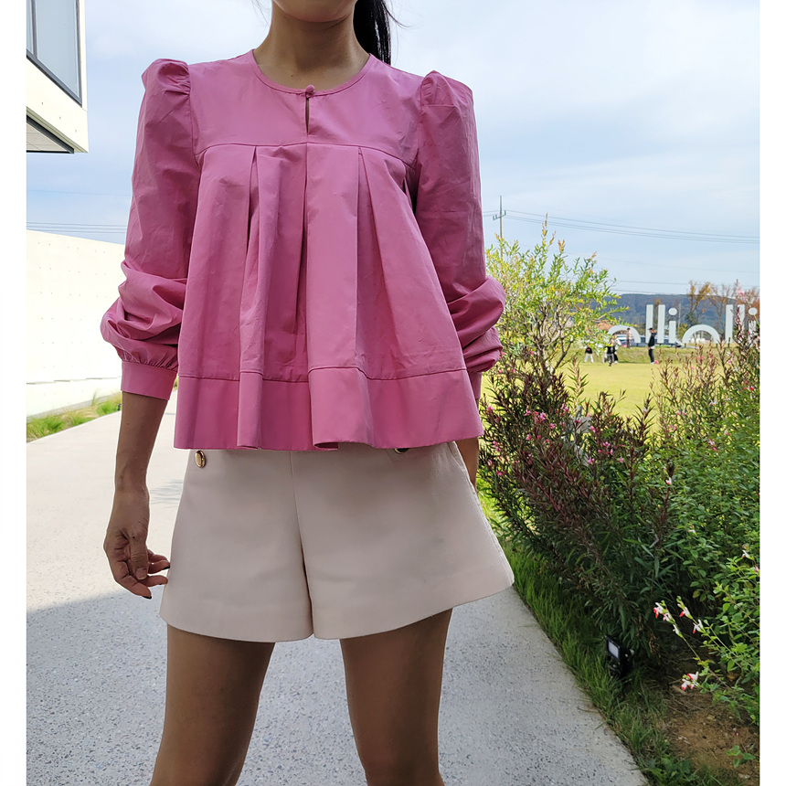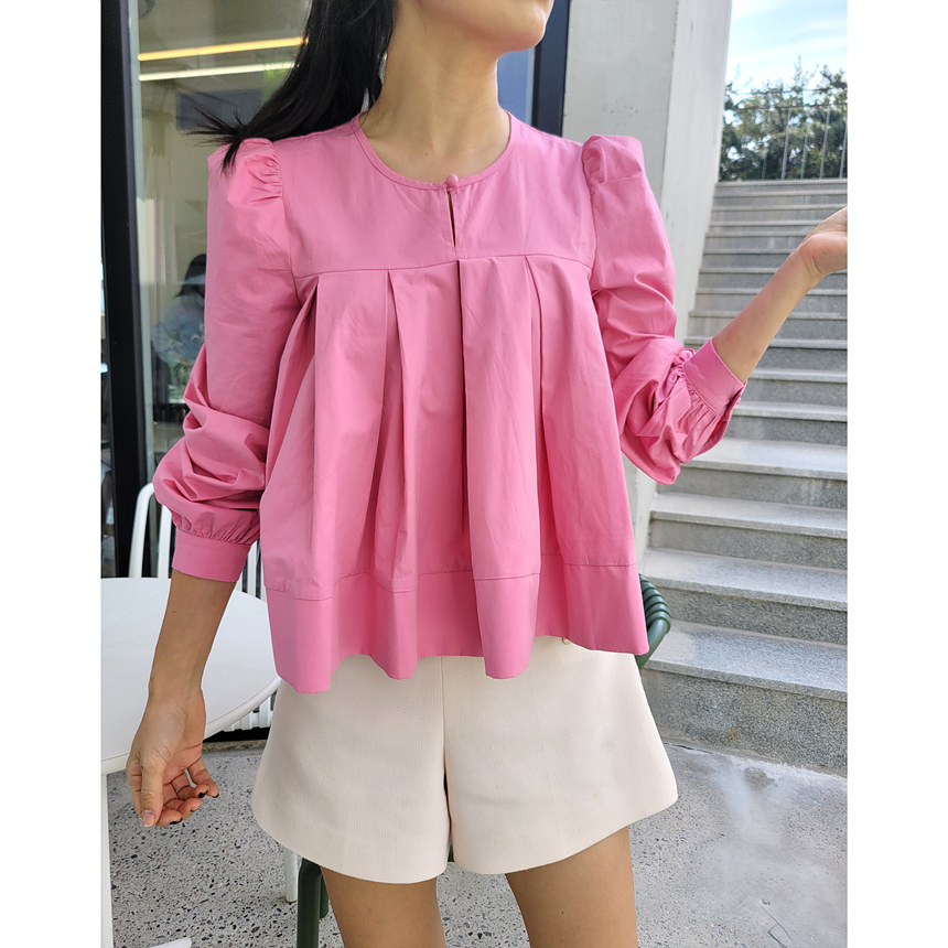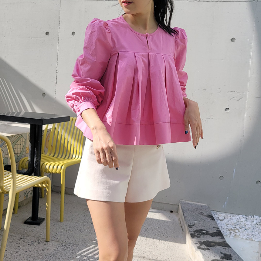 바로발송 핑크 핀턱 훌 라운드 블라우스