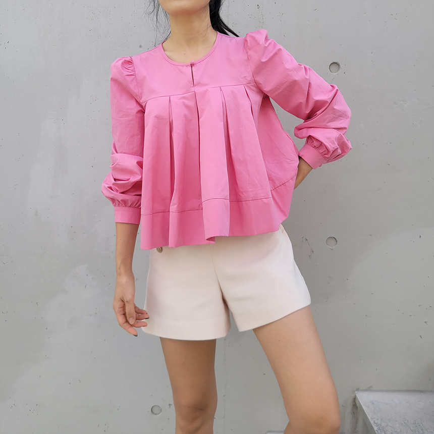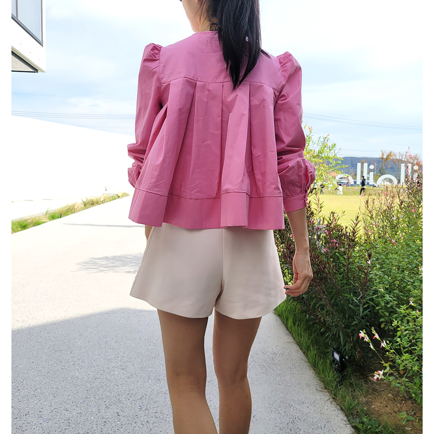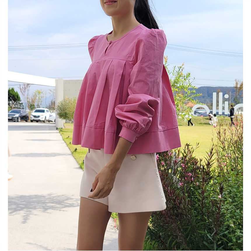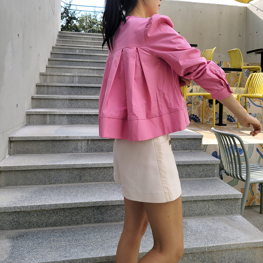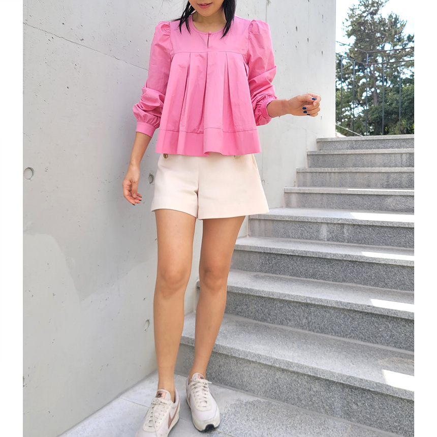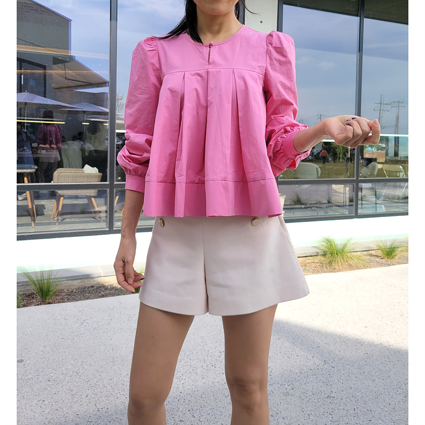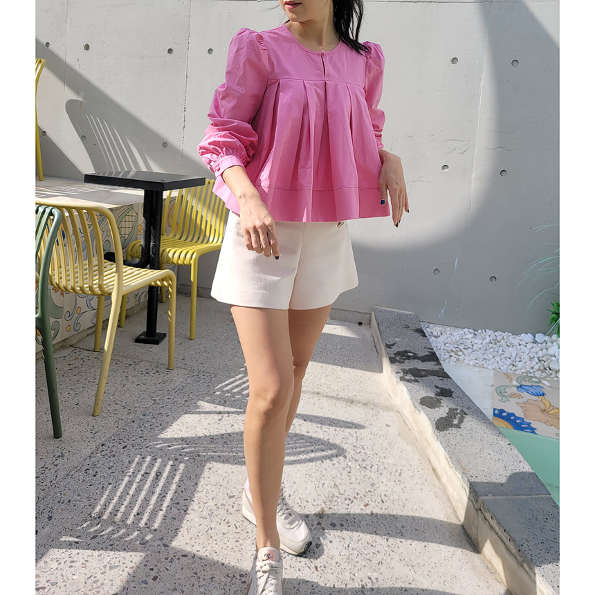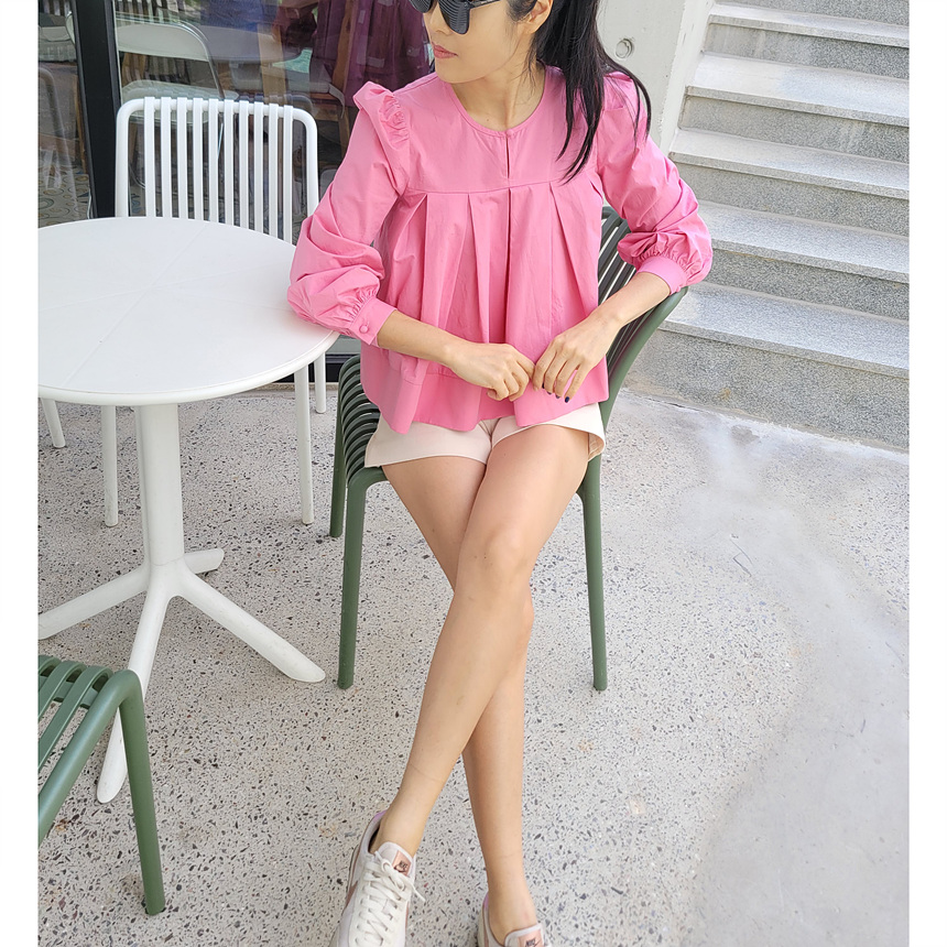 바로발송 핑크 핀턱 훌 라운드 블라우스