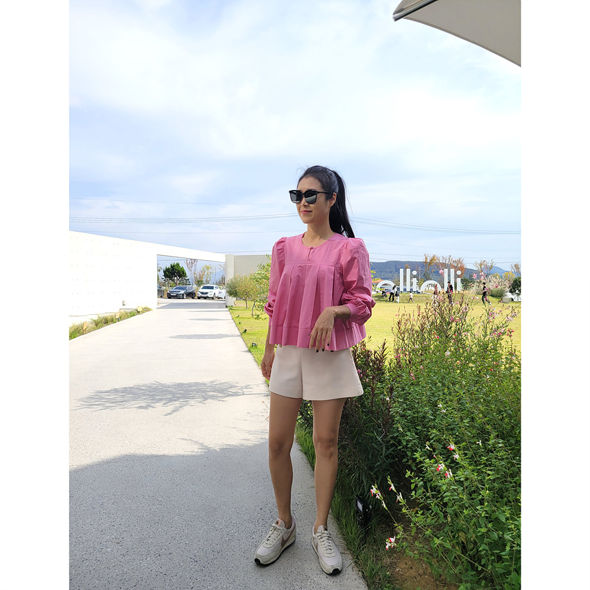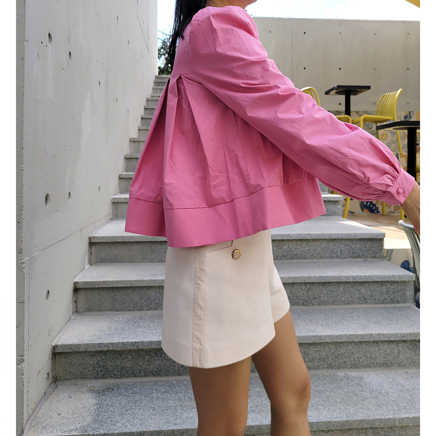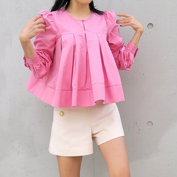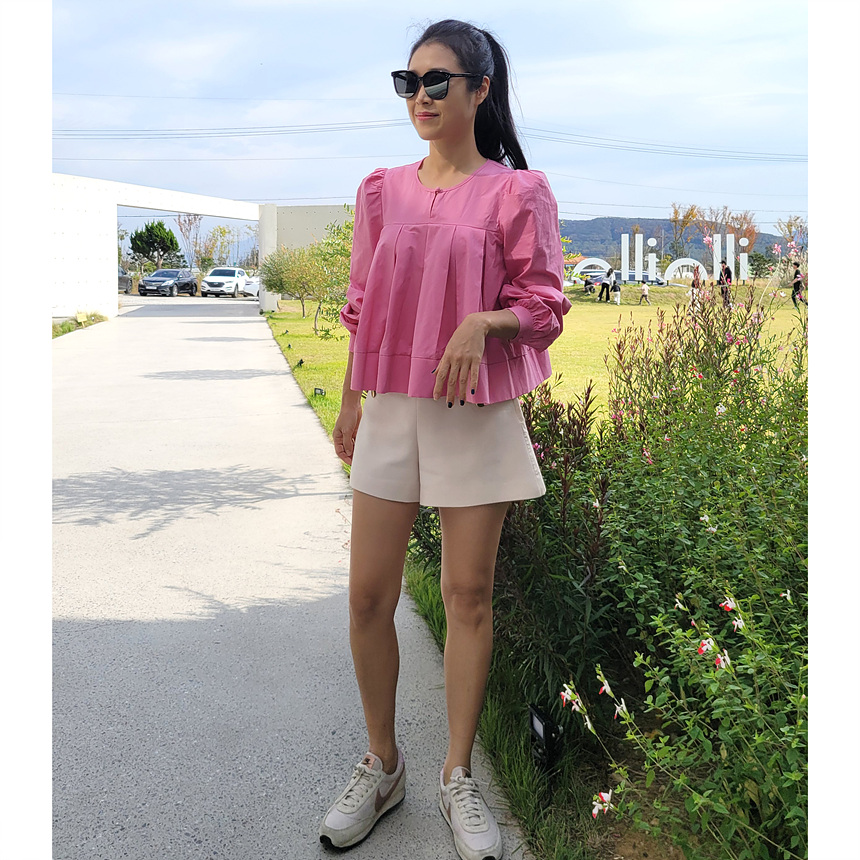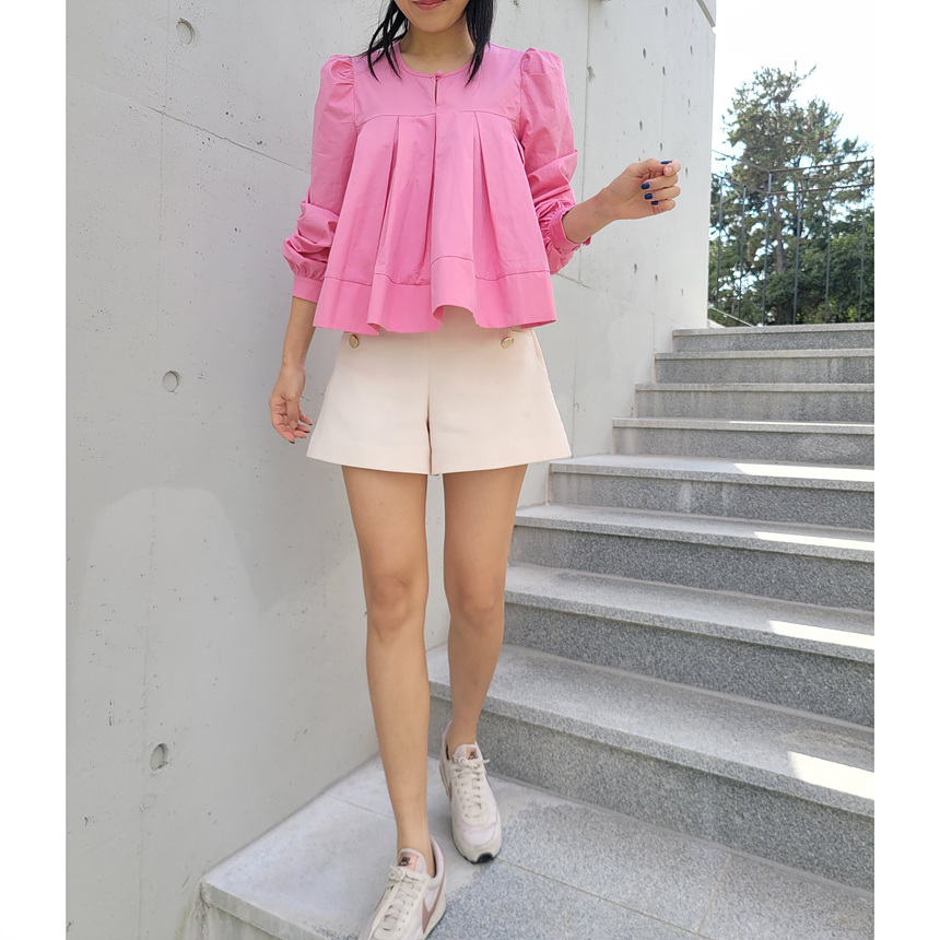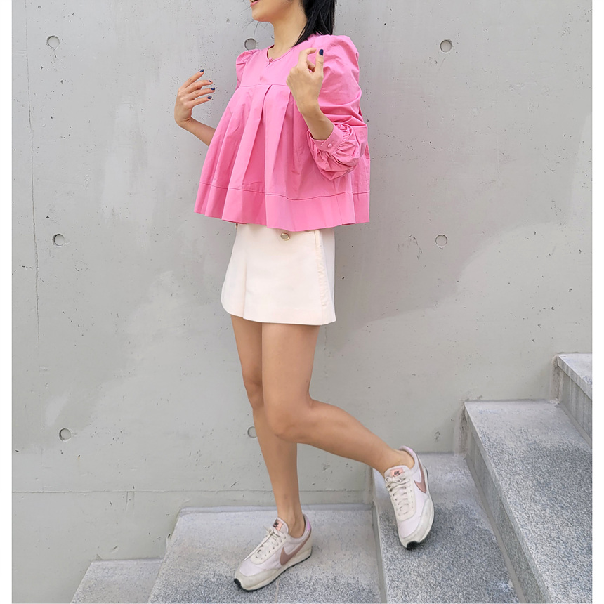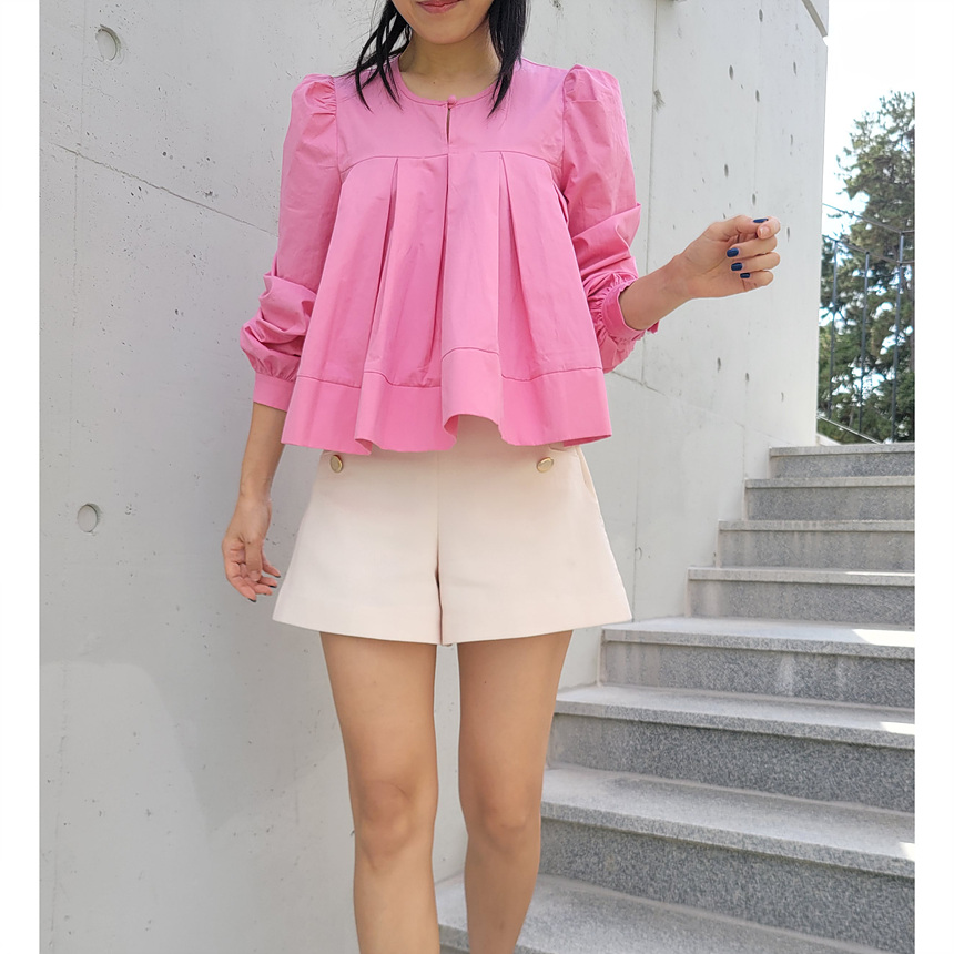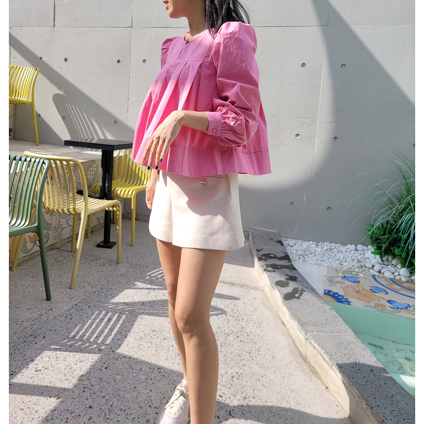 바로발송 핑크 핀턱 훌 라운드 블라우스