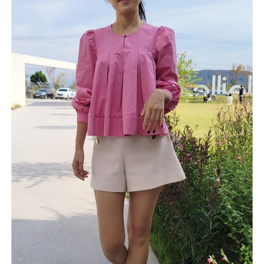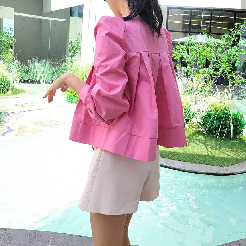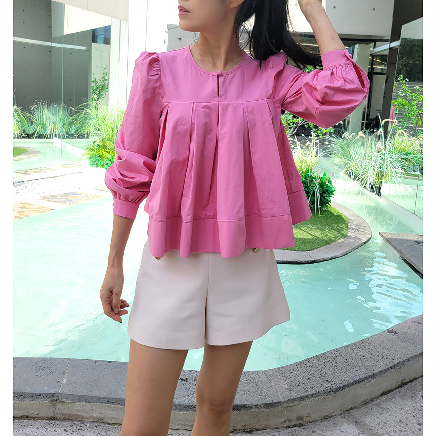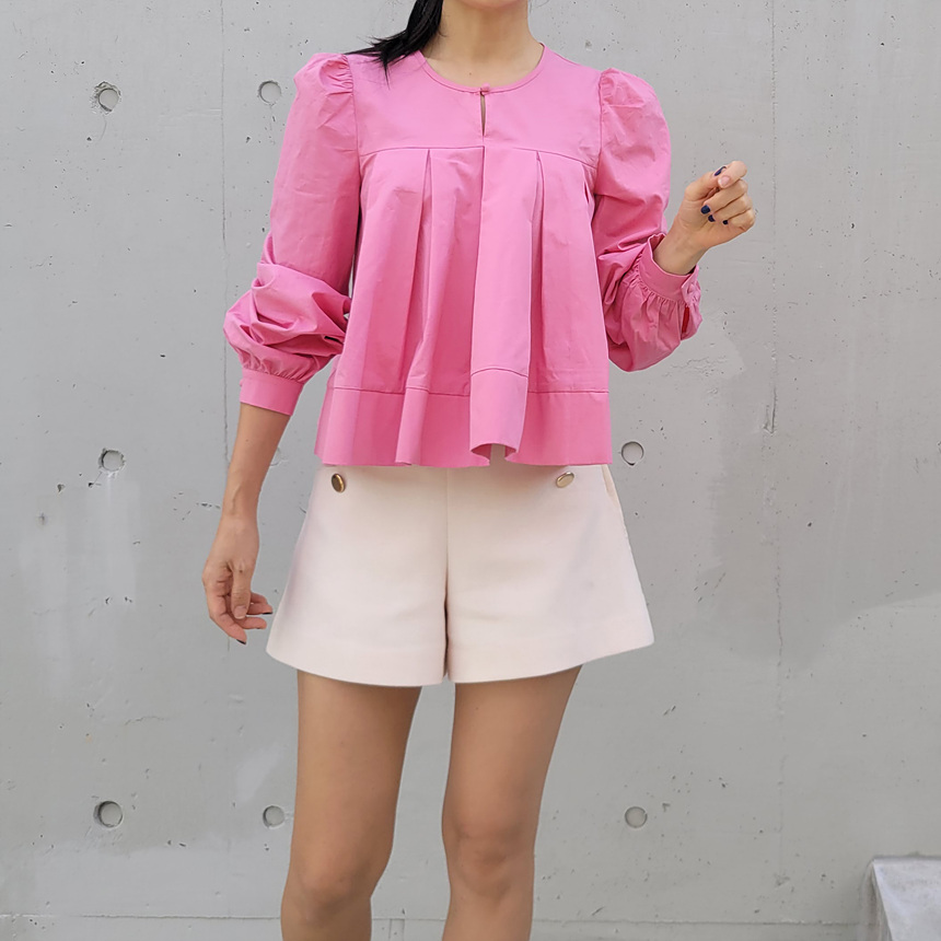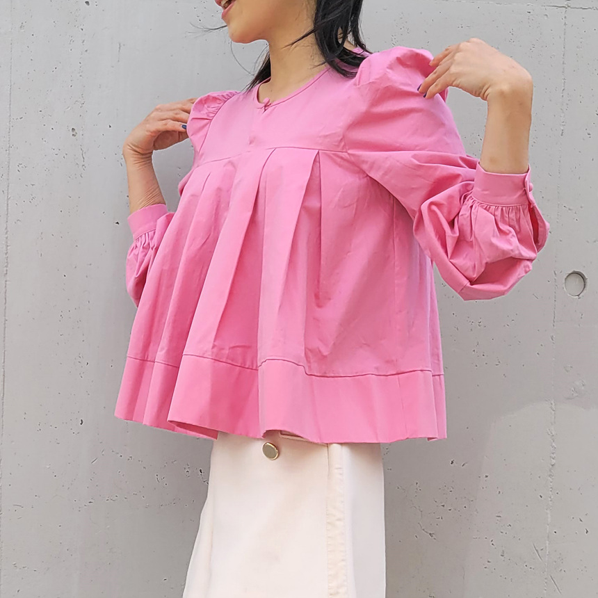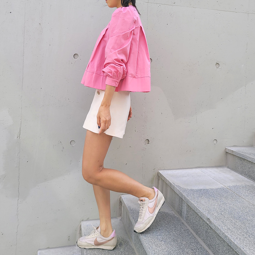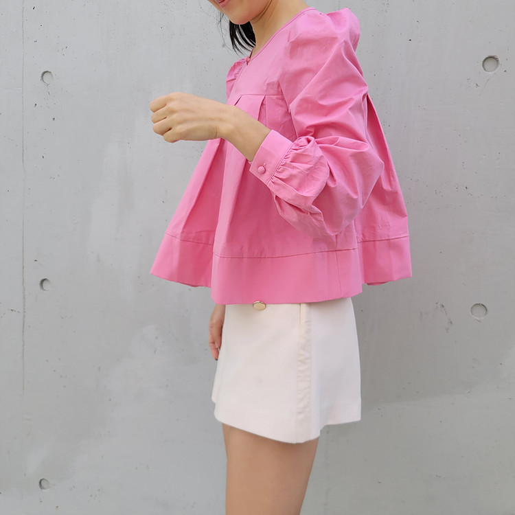 바로발송 핑크 핀턱 훌 라운드 블라우스