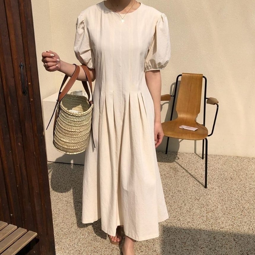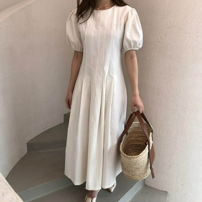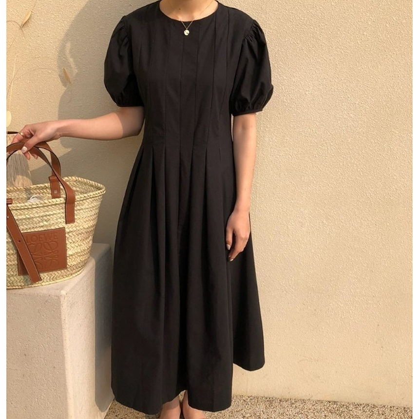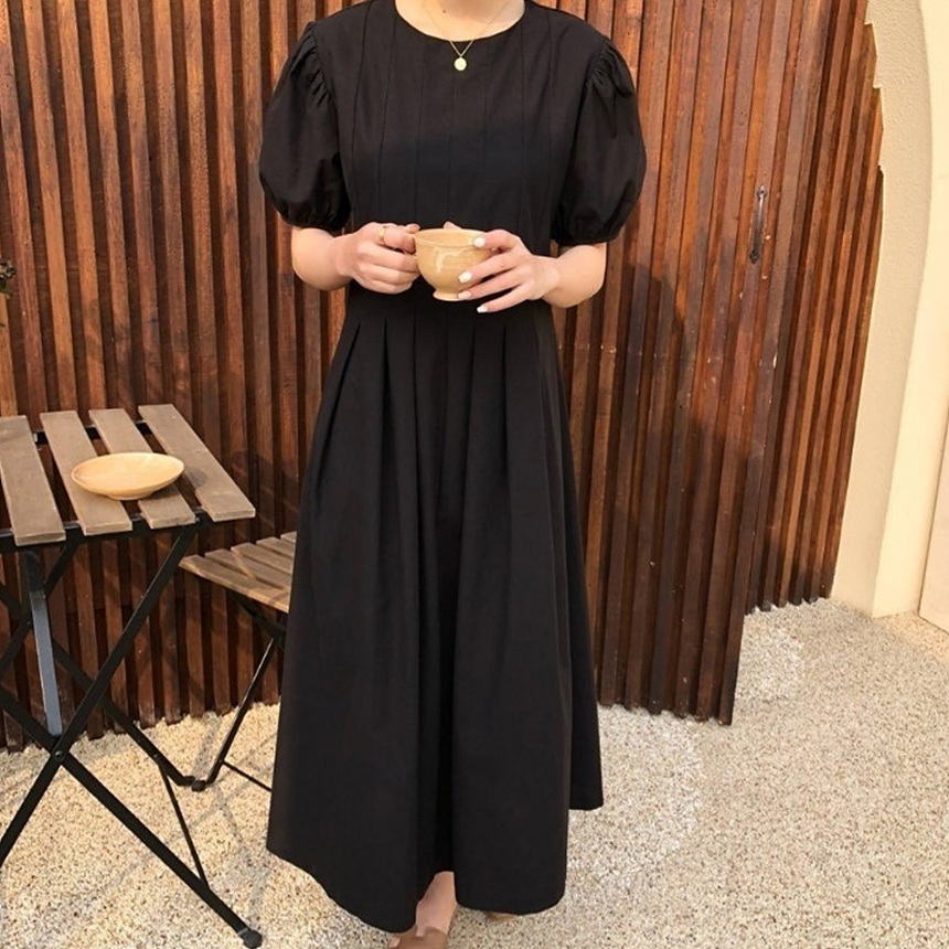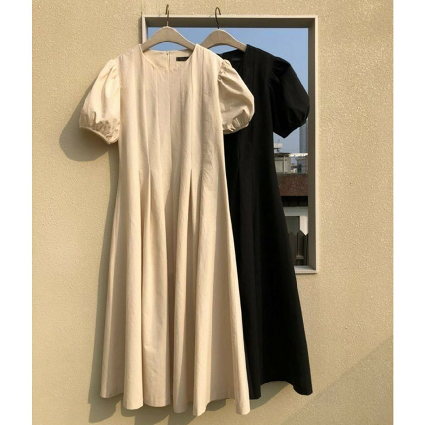 바로발송 반소매 퍼프 핀턱 롱 원피스 에이 라인 플레어원피스