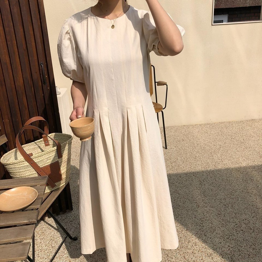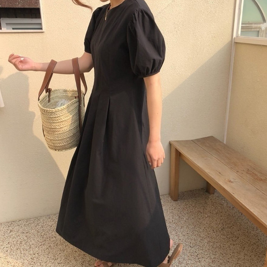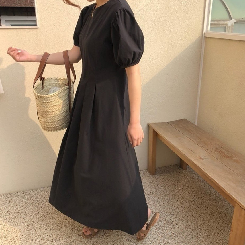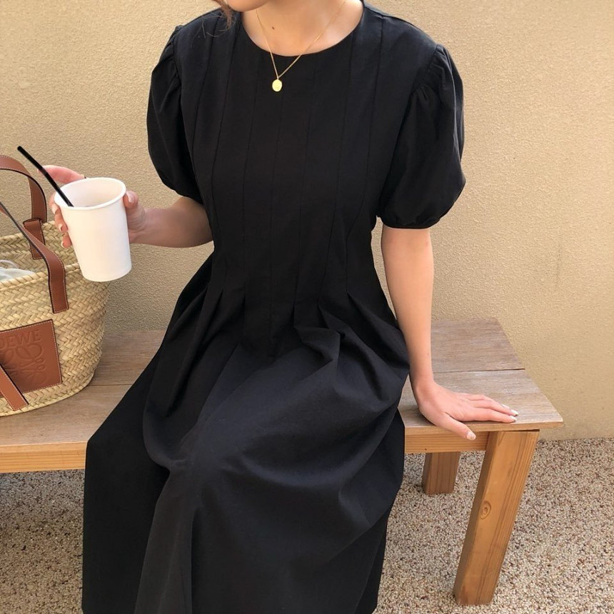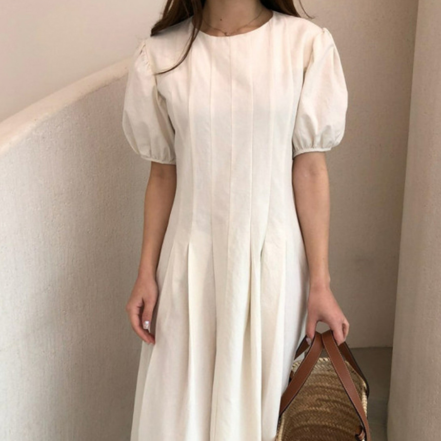 바로발송 반소매 퍼프 핀턱 롱 원피스 에이 라인 플레어원피스
