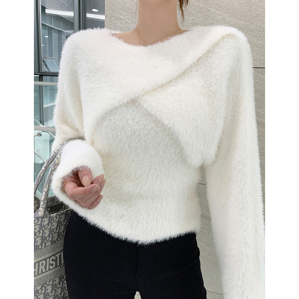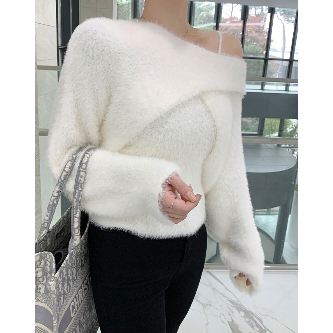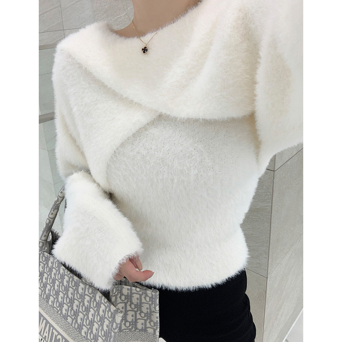 볼레로를 한쪽 숄더에 살짝 걸쳐주면