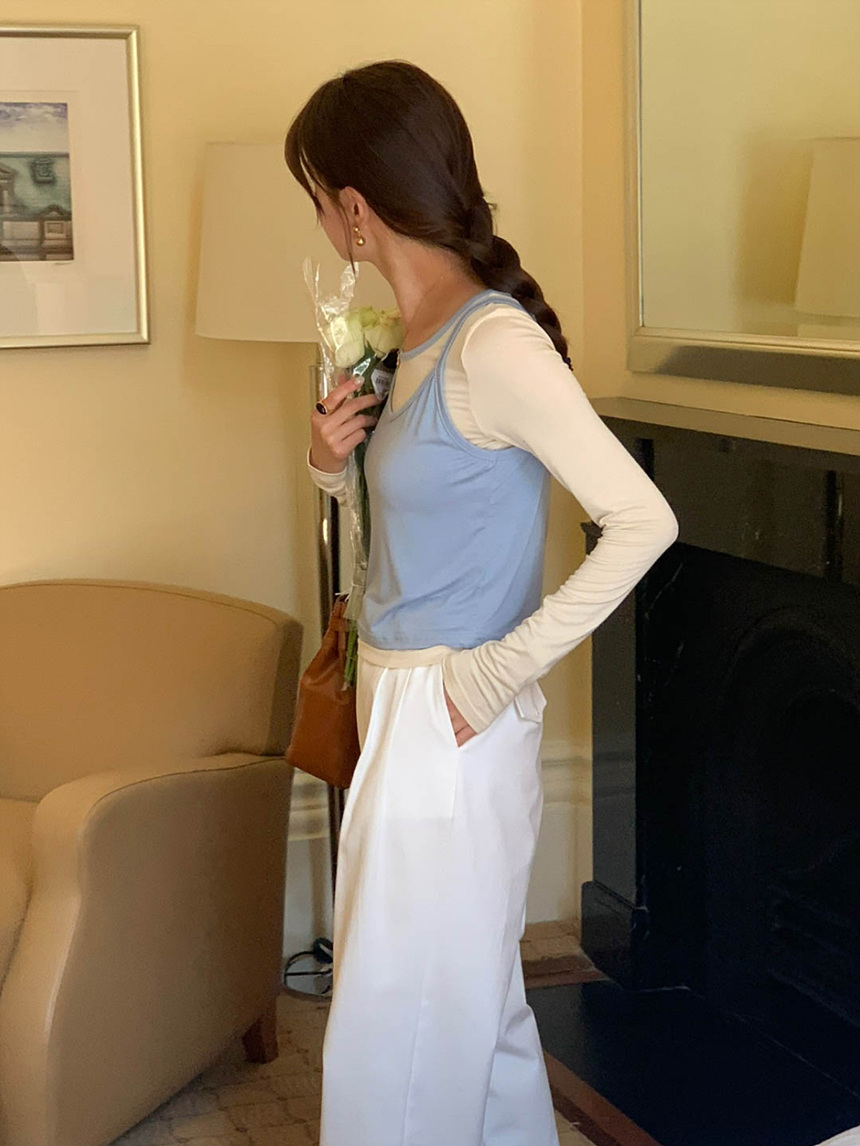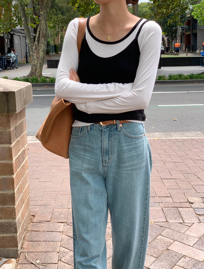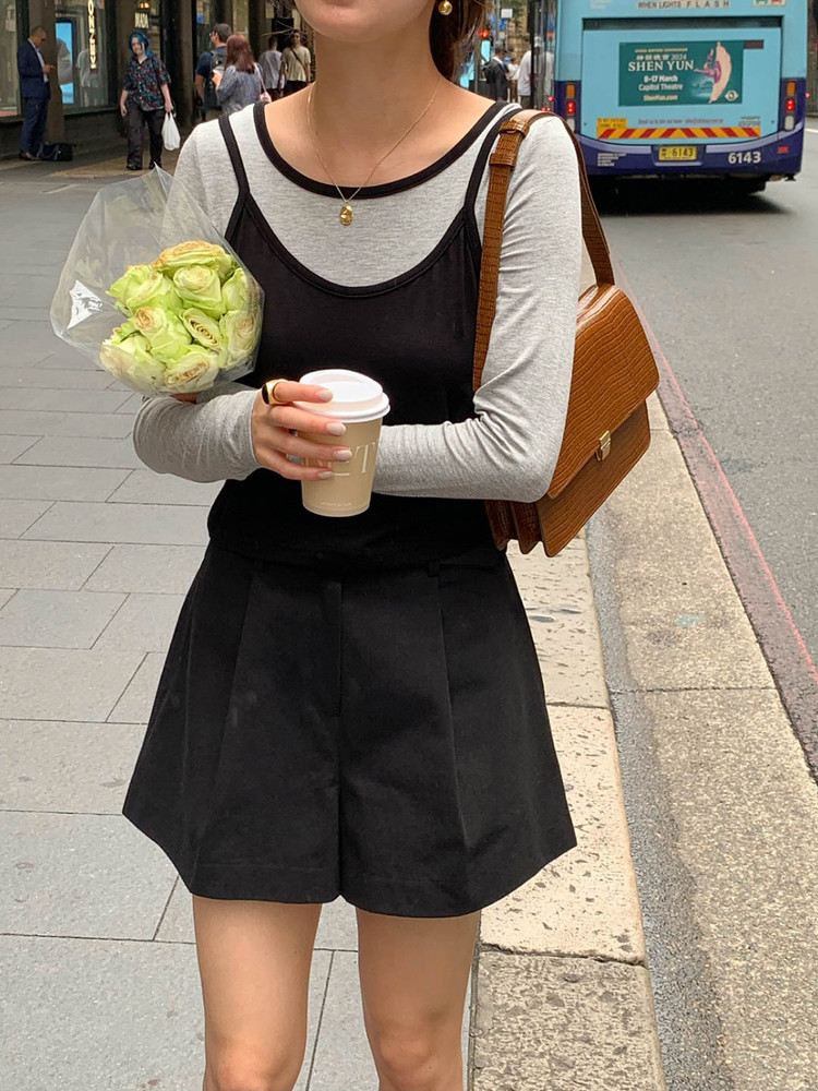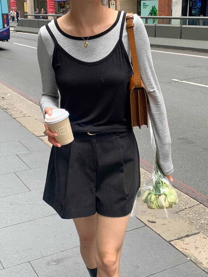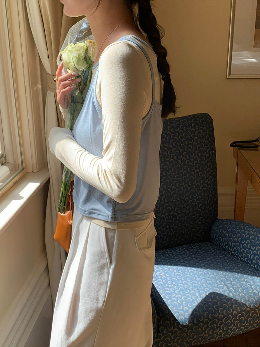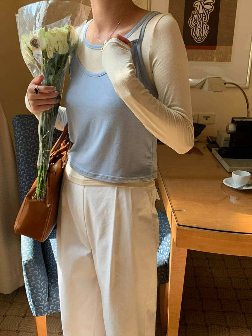 바로발송 푸우 나시와 티 레이어드 배색 코디 세트