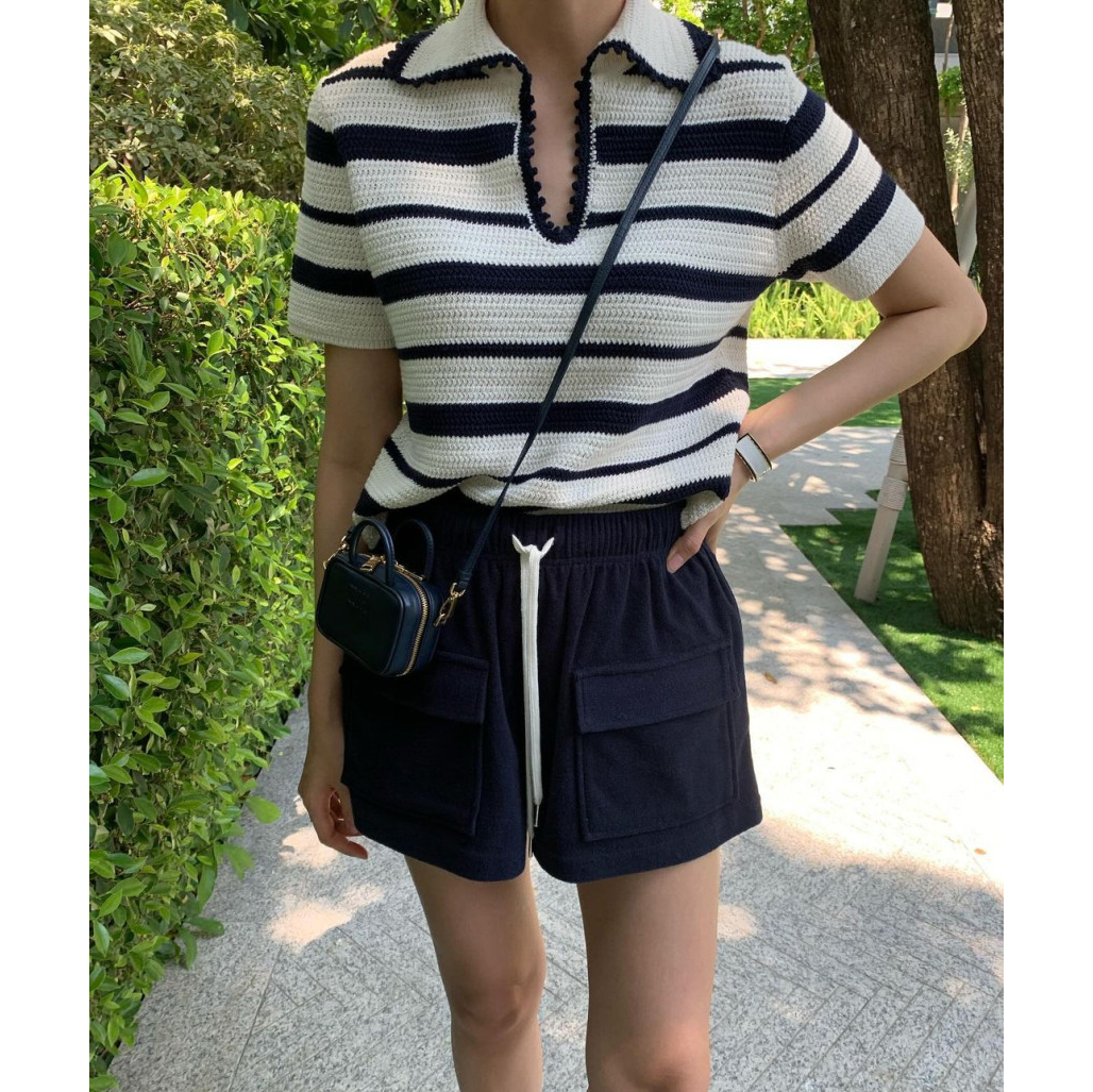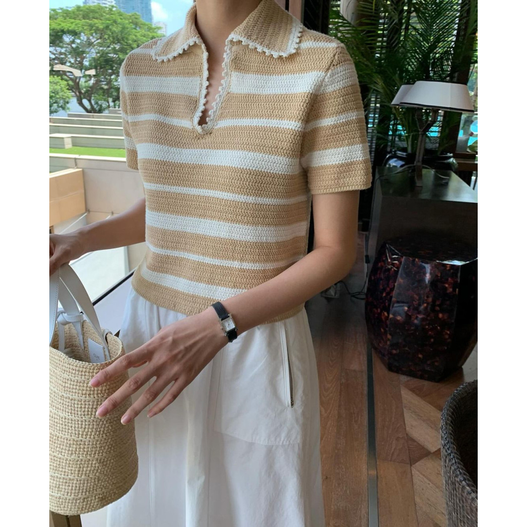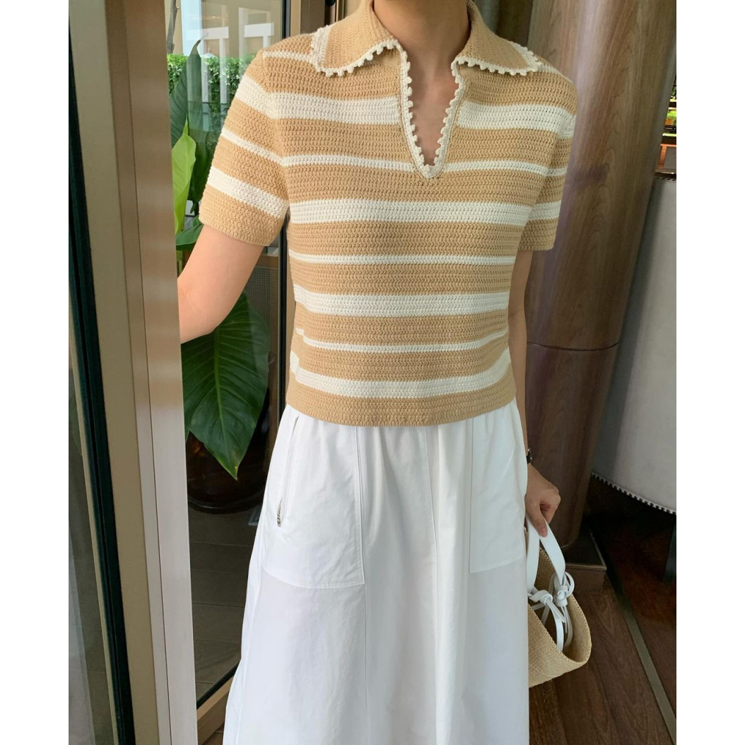 바로발송 메이유 스트라이프 브이 트임 카라 니트