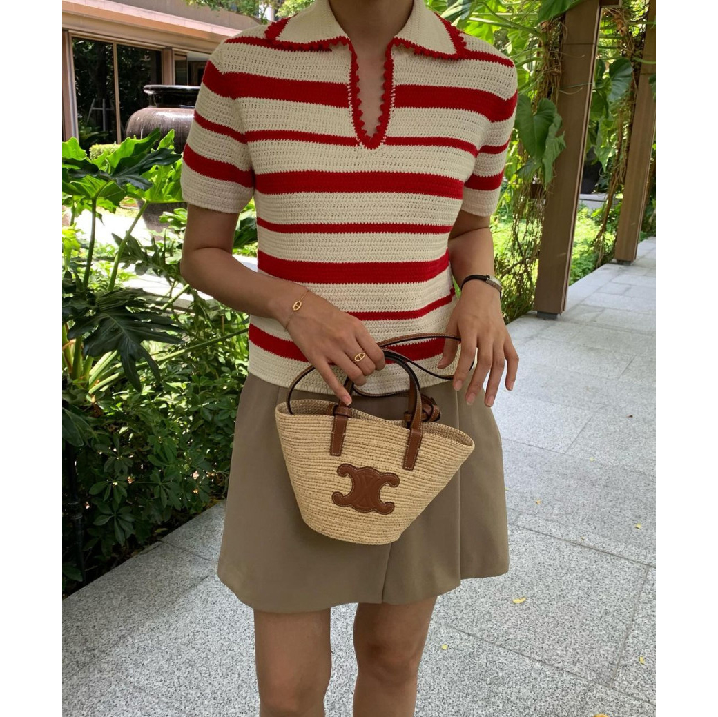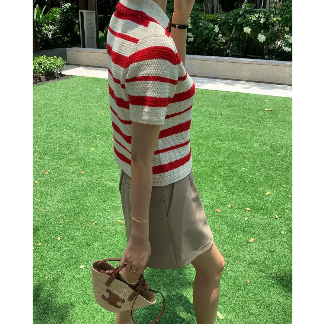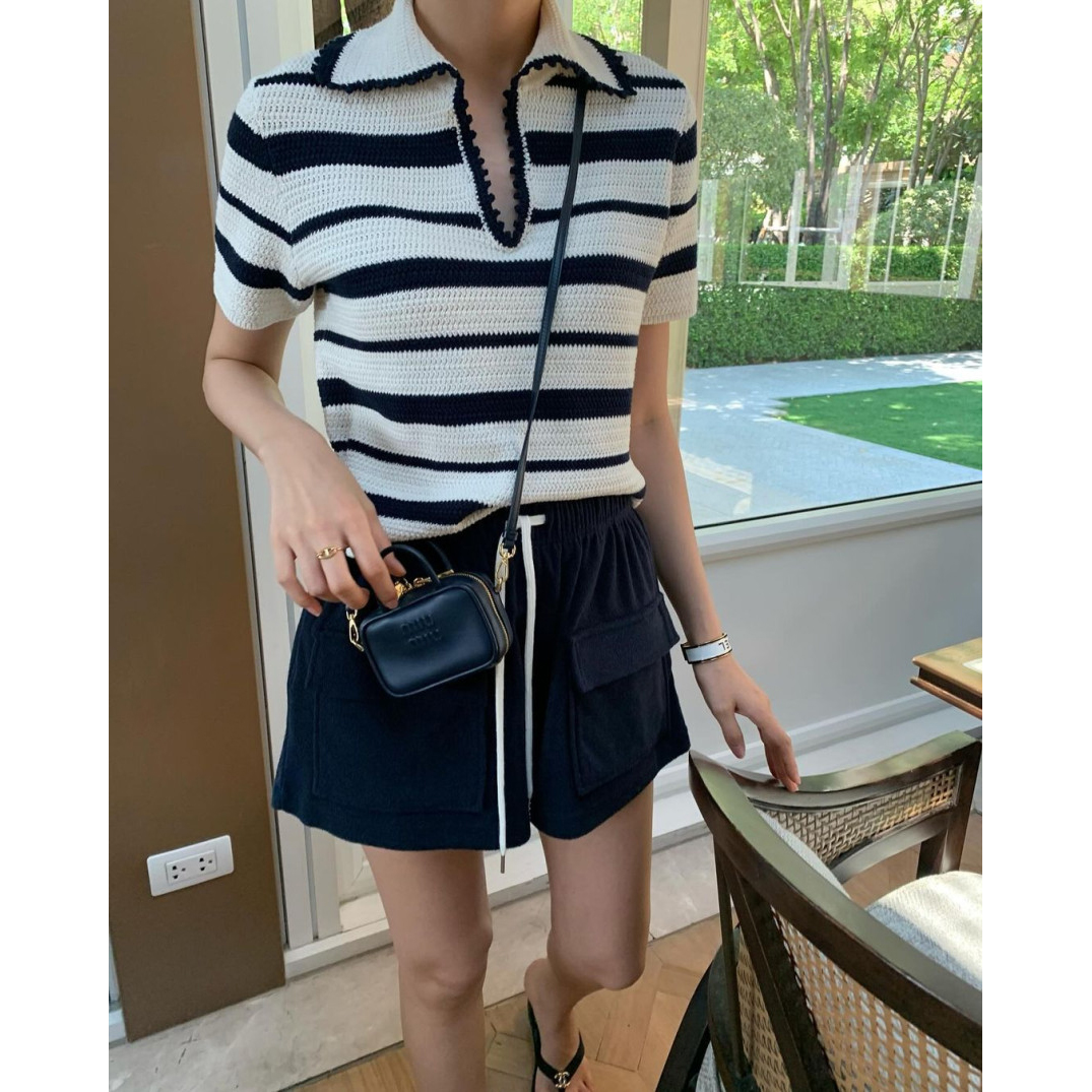 바로발송 메이유 스트라이프 브이 트임 카라 니트
