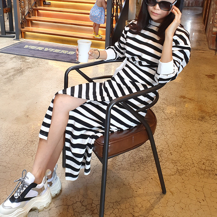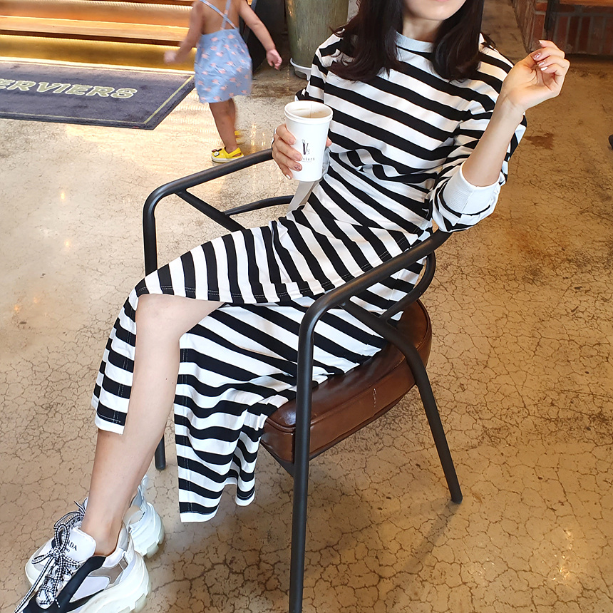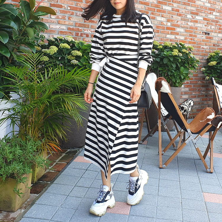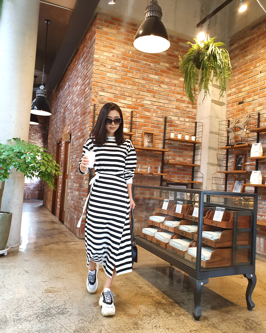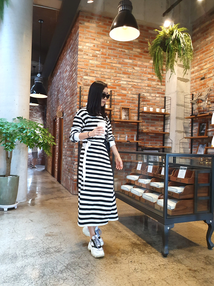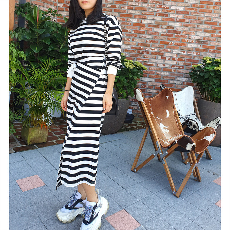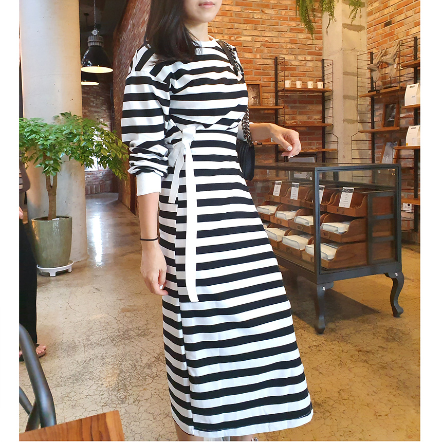 바로발송 단가라 코튼 랩 줄무늬 롱 원피스