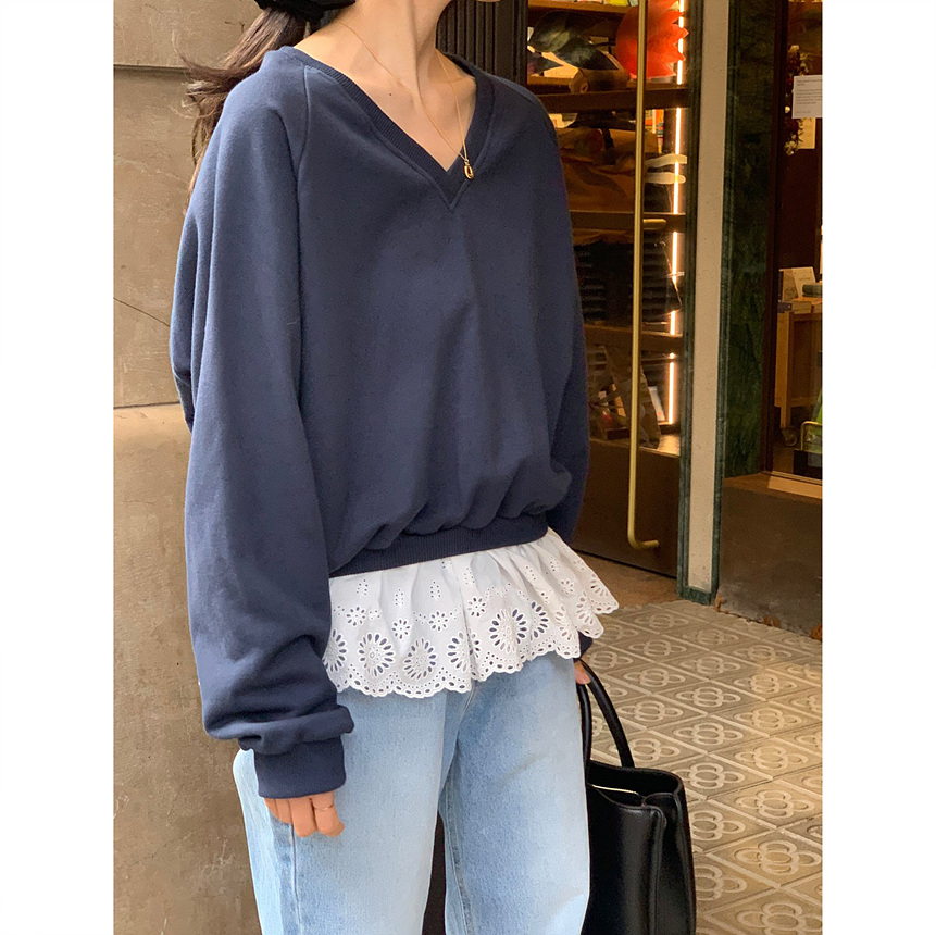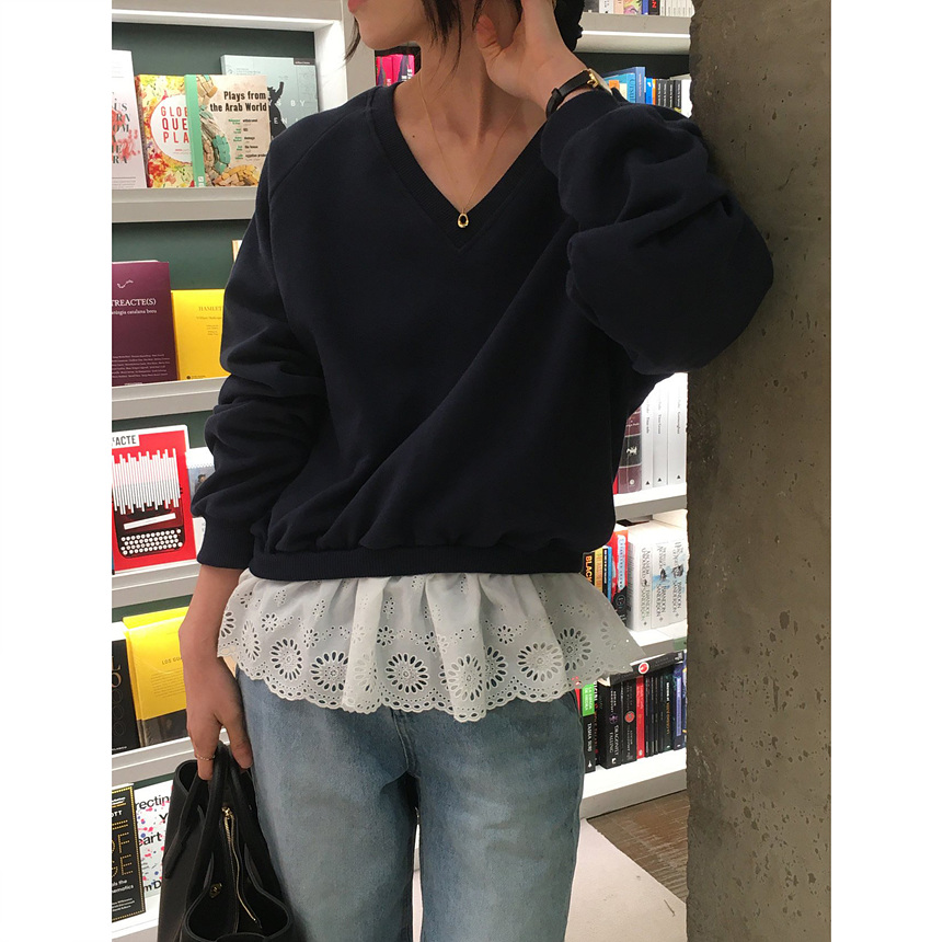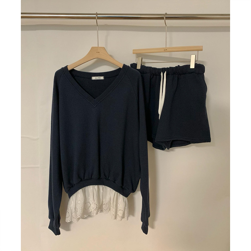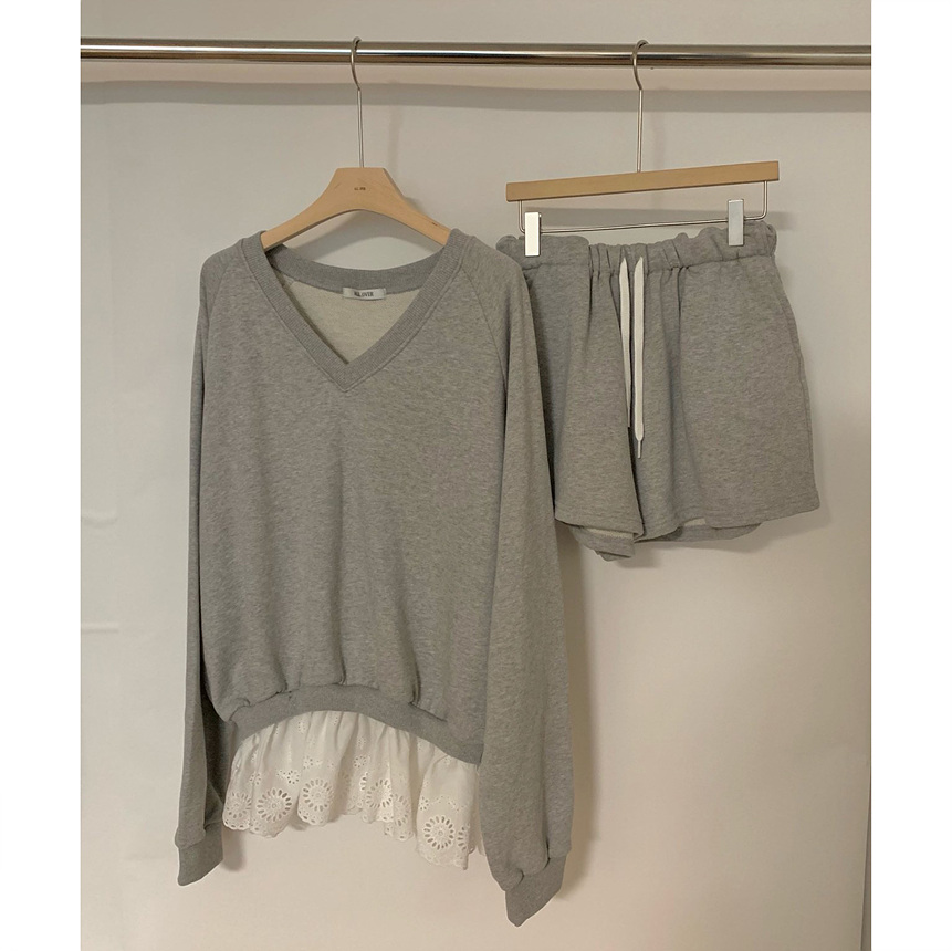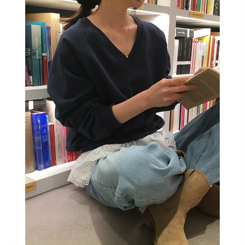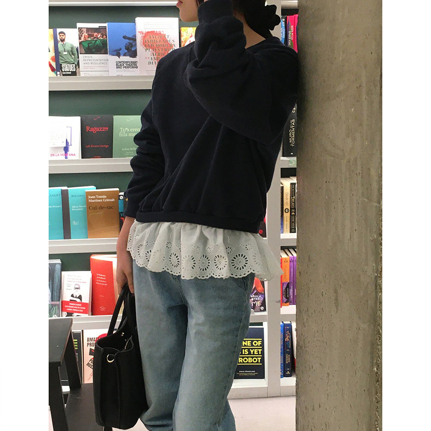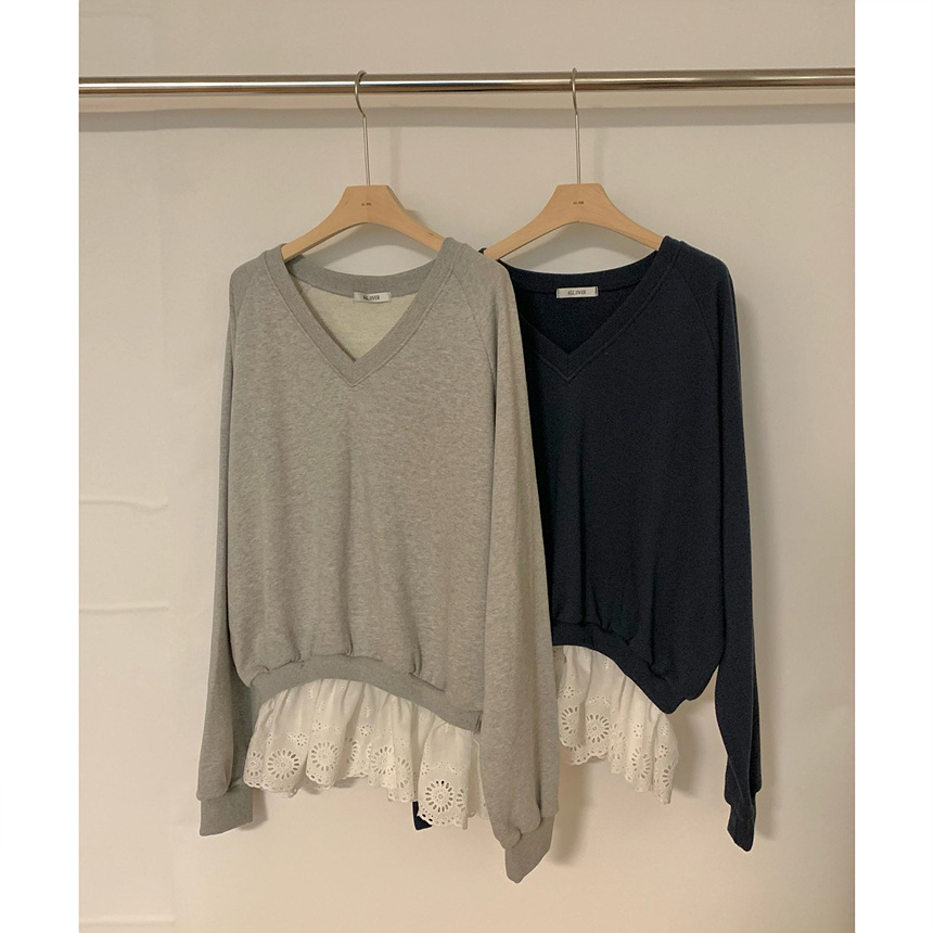 올오버 코어 맨투맨 브이넥 펀칭 프릴 레이스 밑단