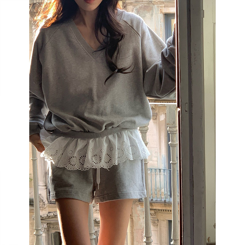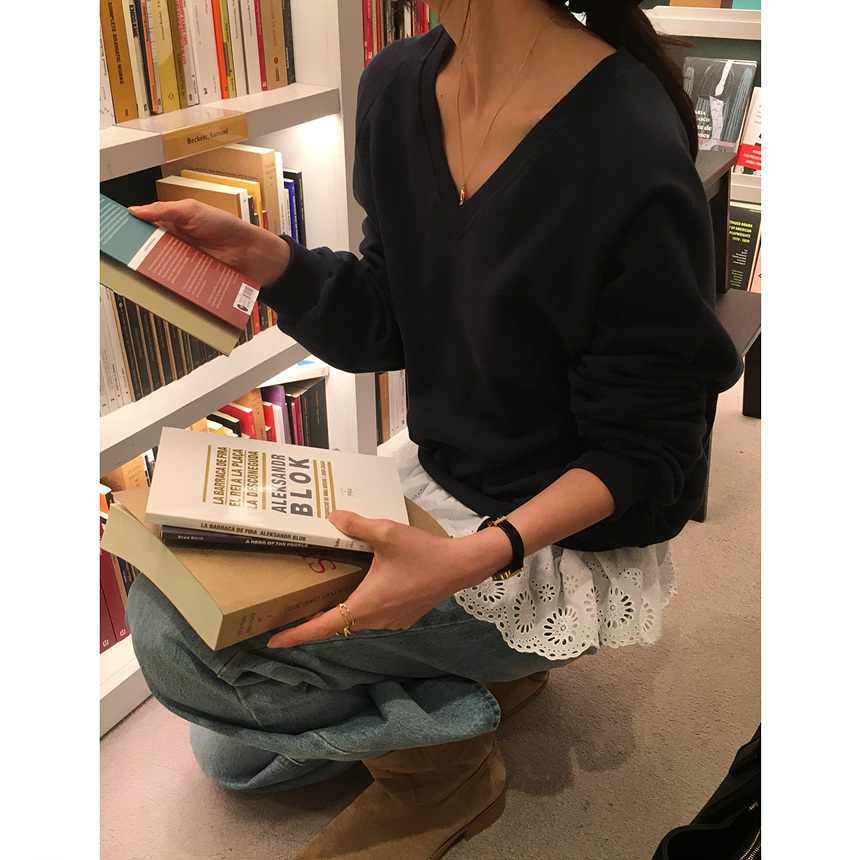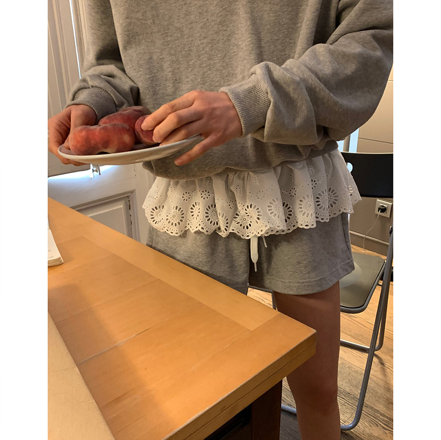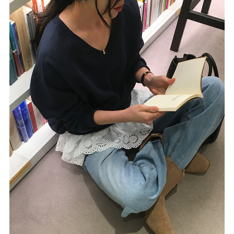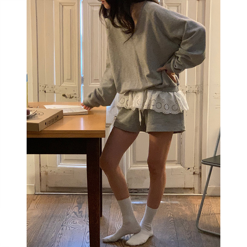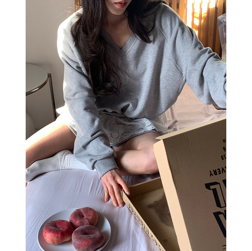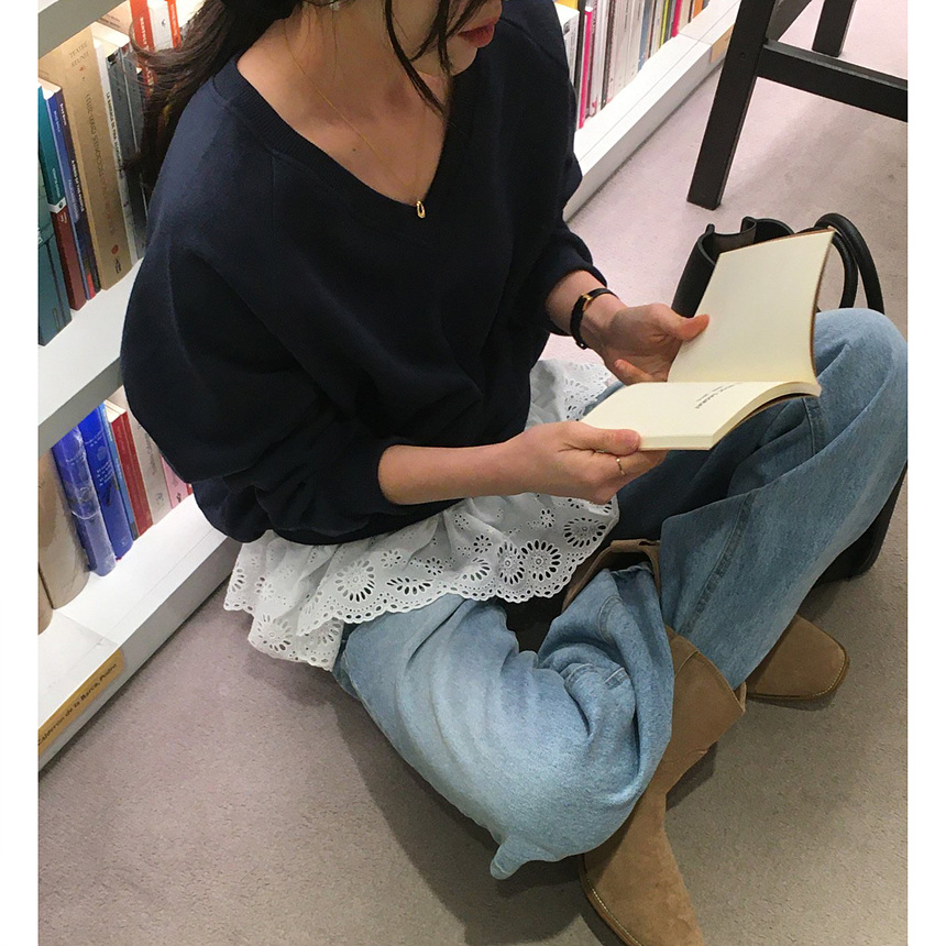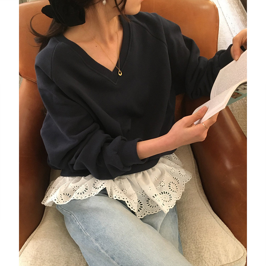 올오버 코어 맨투맨 브이넥 펀칭 프릴 레이스 밑단