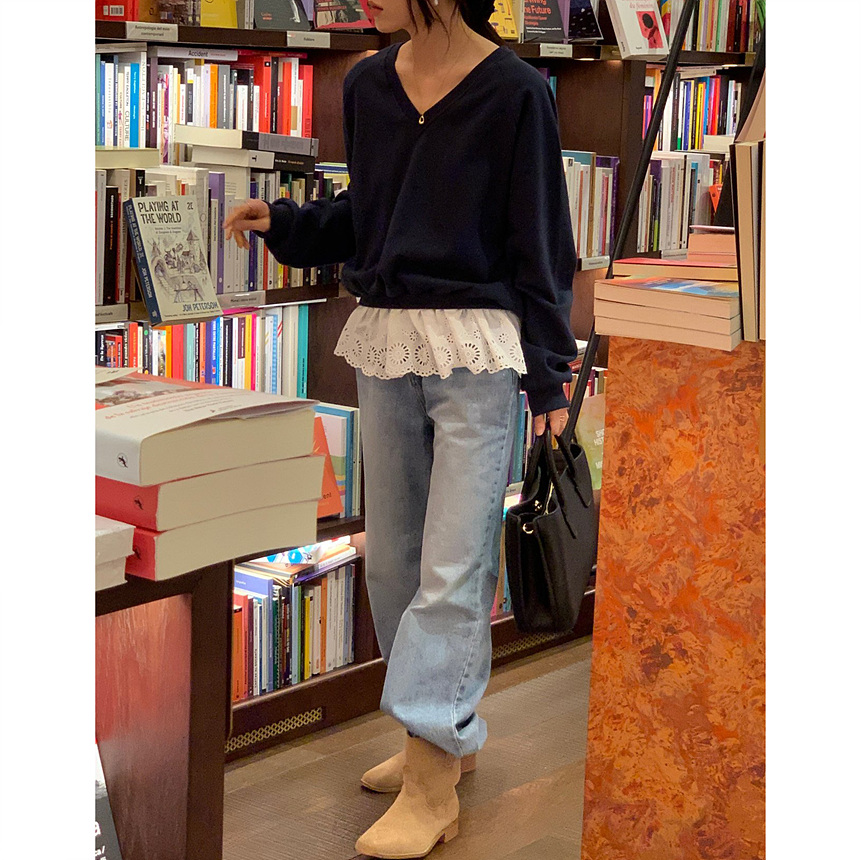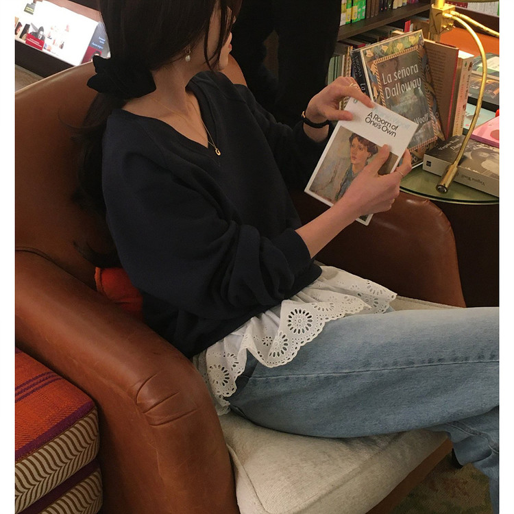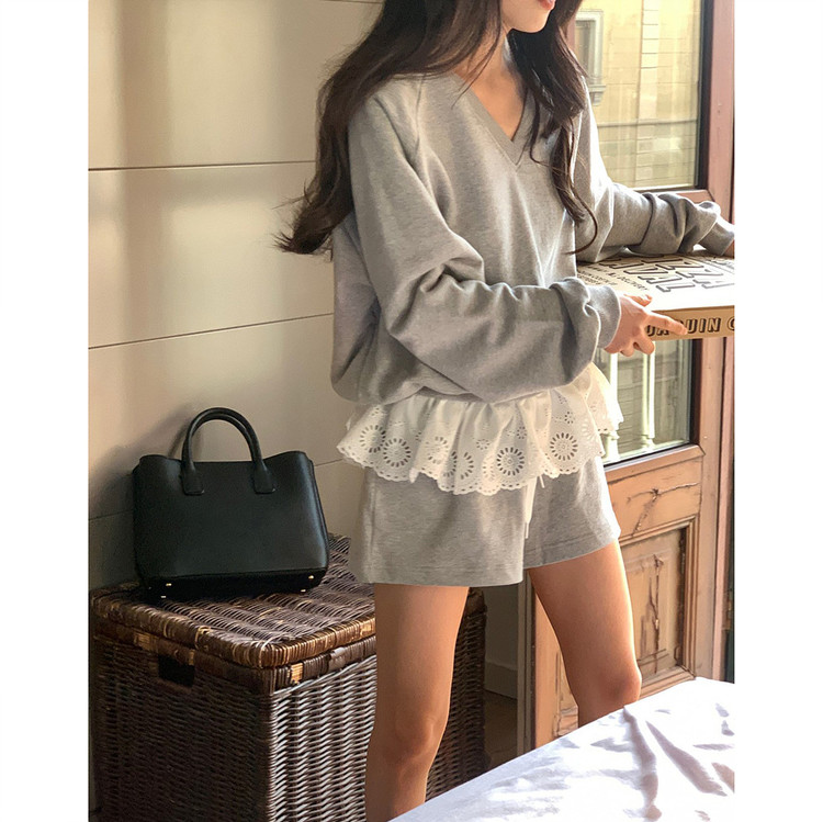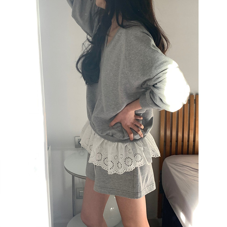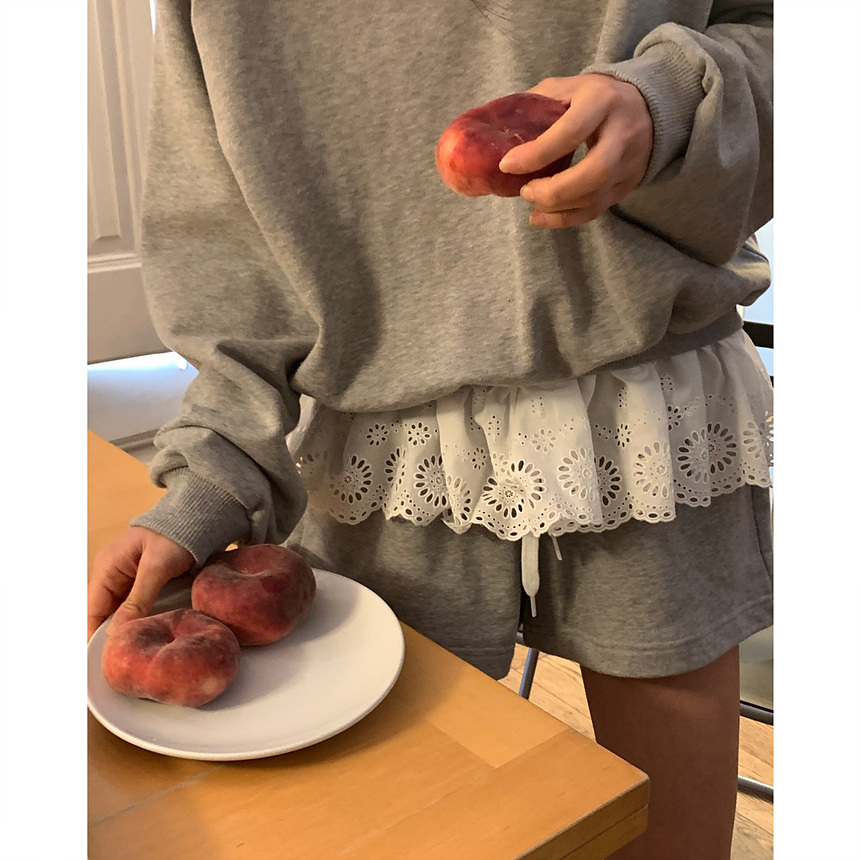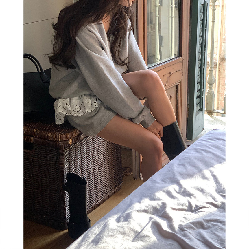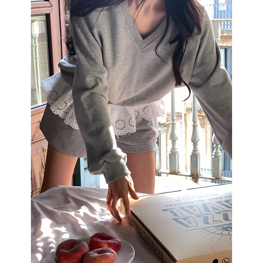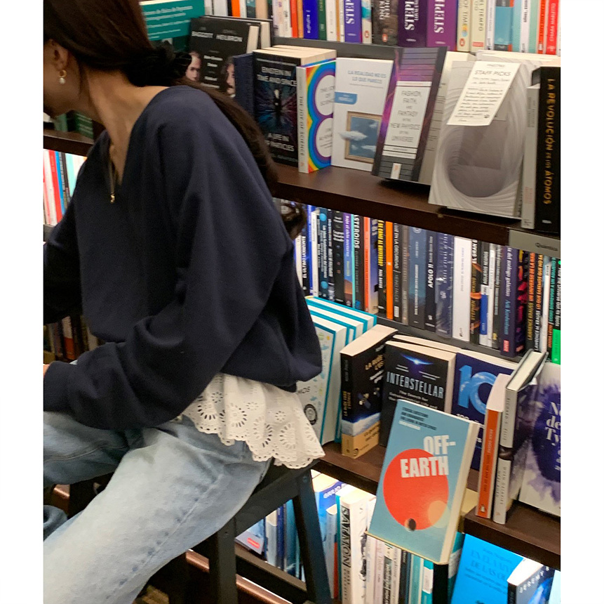 올오버 코어 맨투맨 브이넥 펀칭 프릴 레이스 밑단