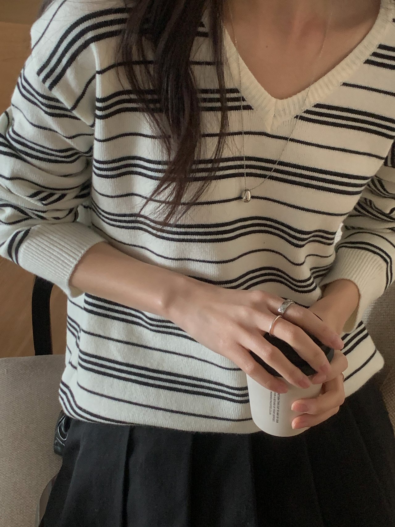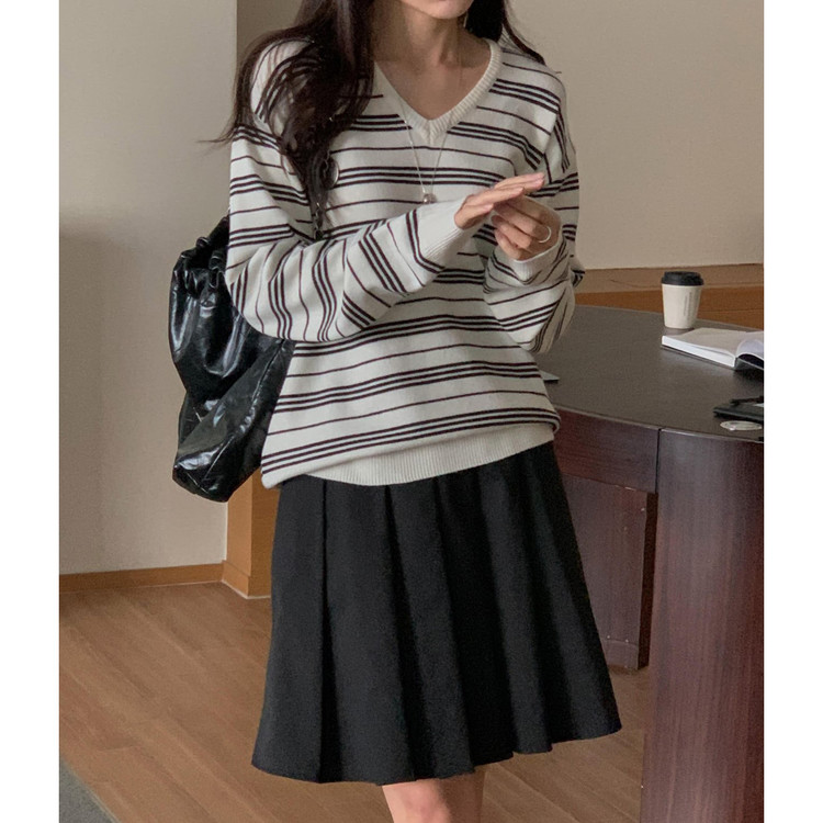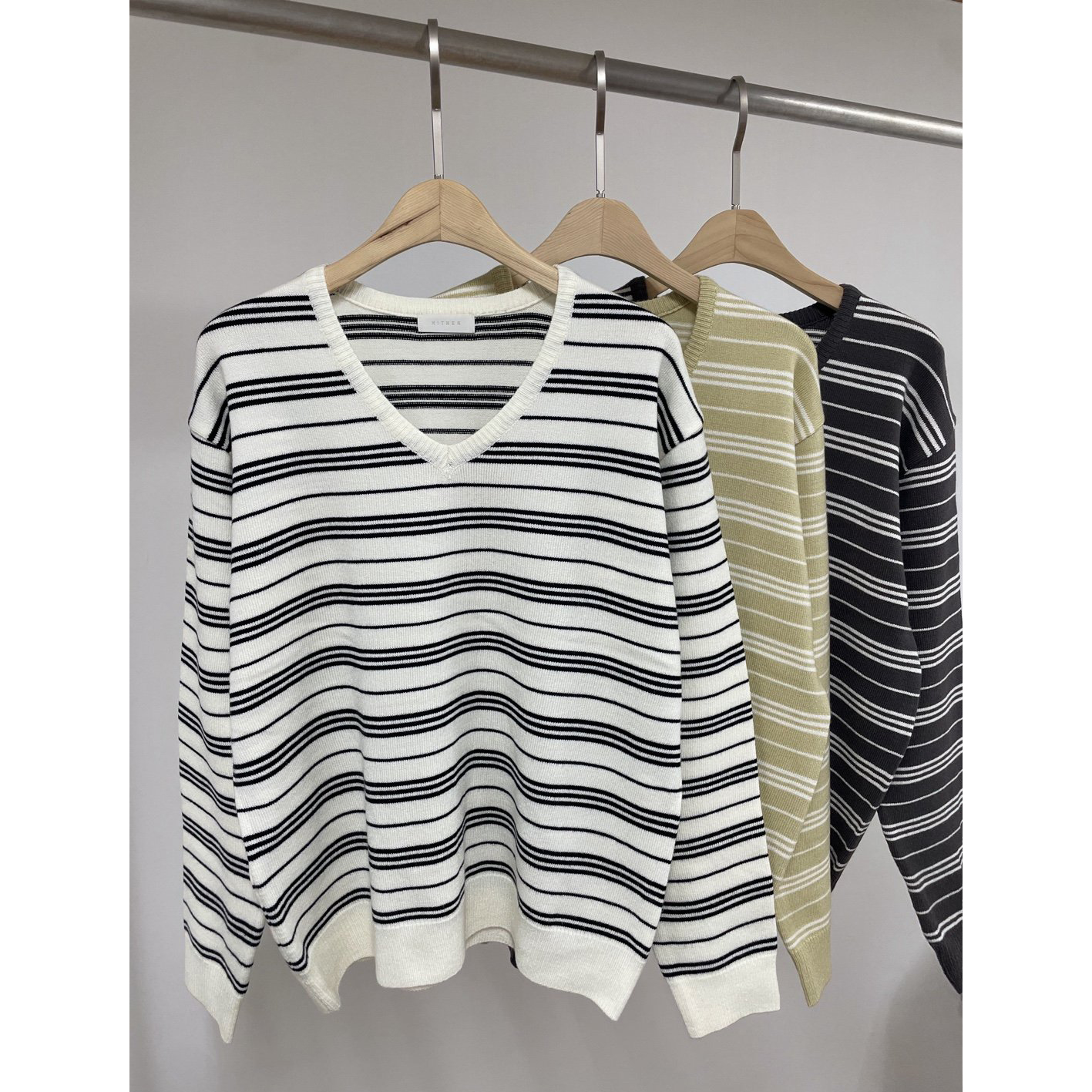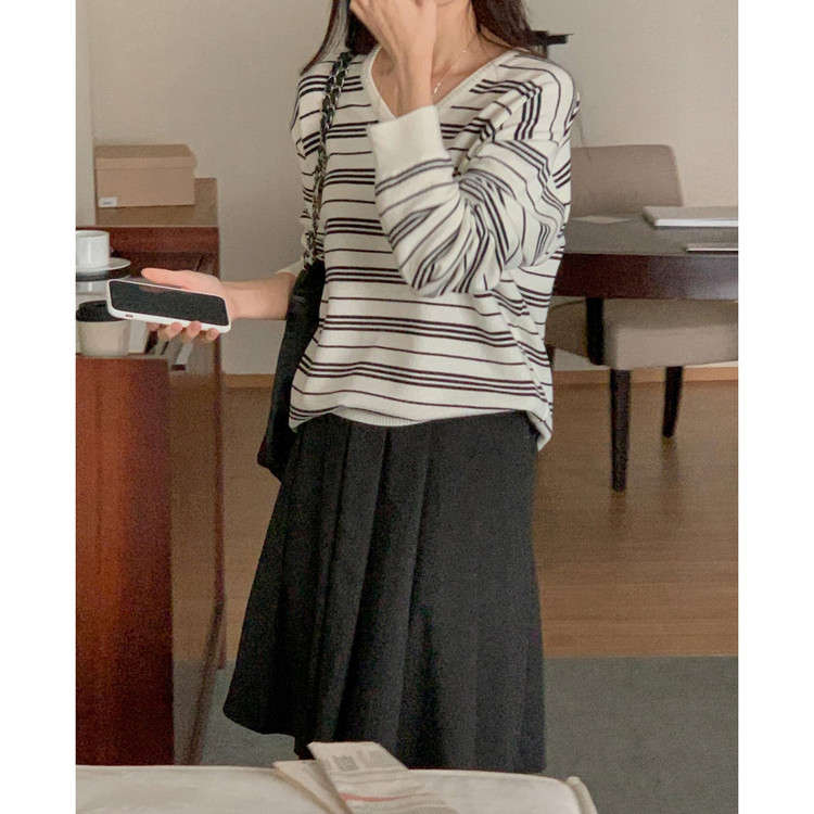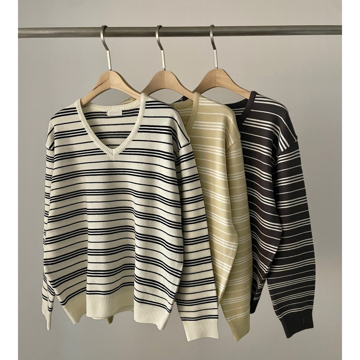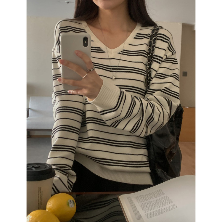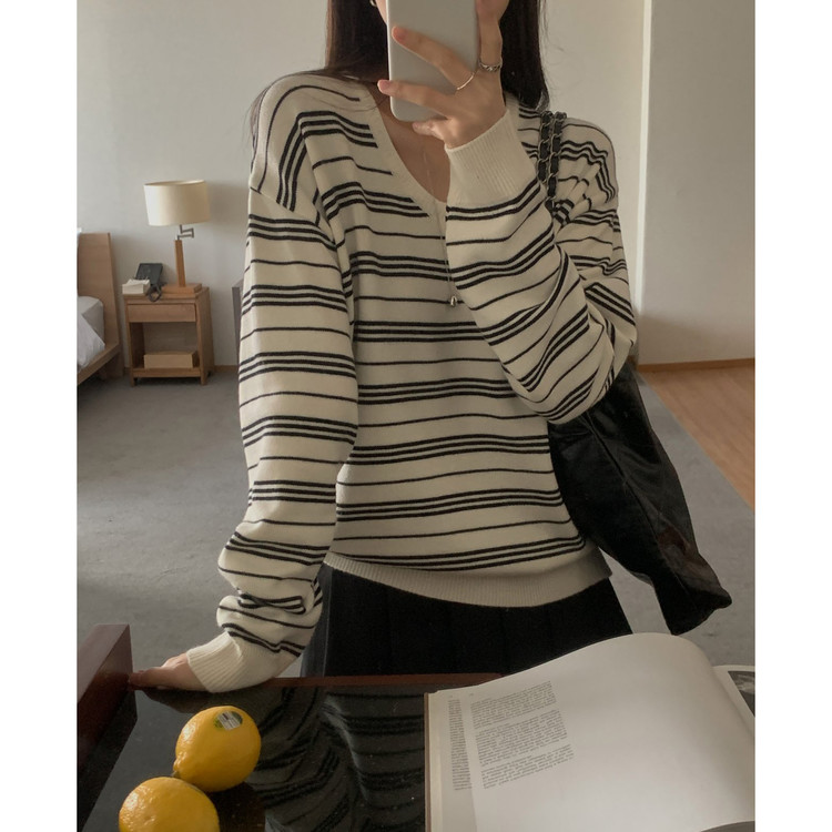 버론 스트라이프 브이넥 단가라 니트