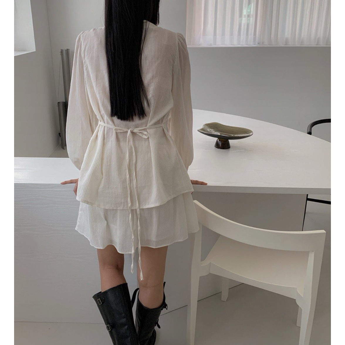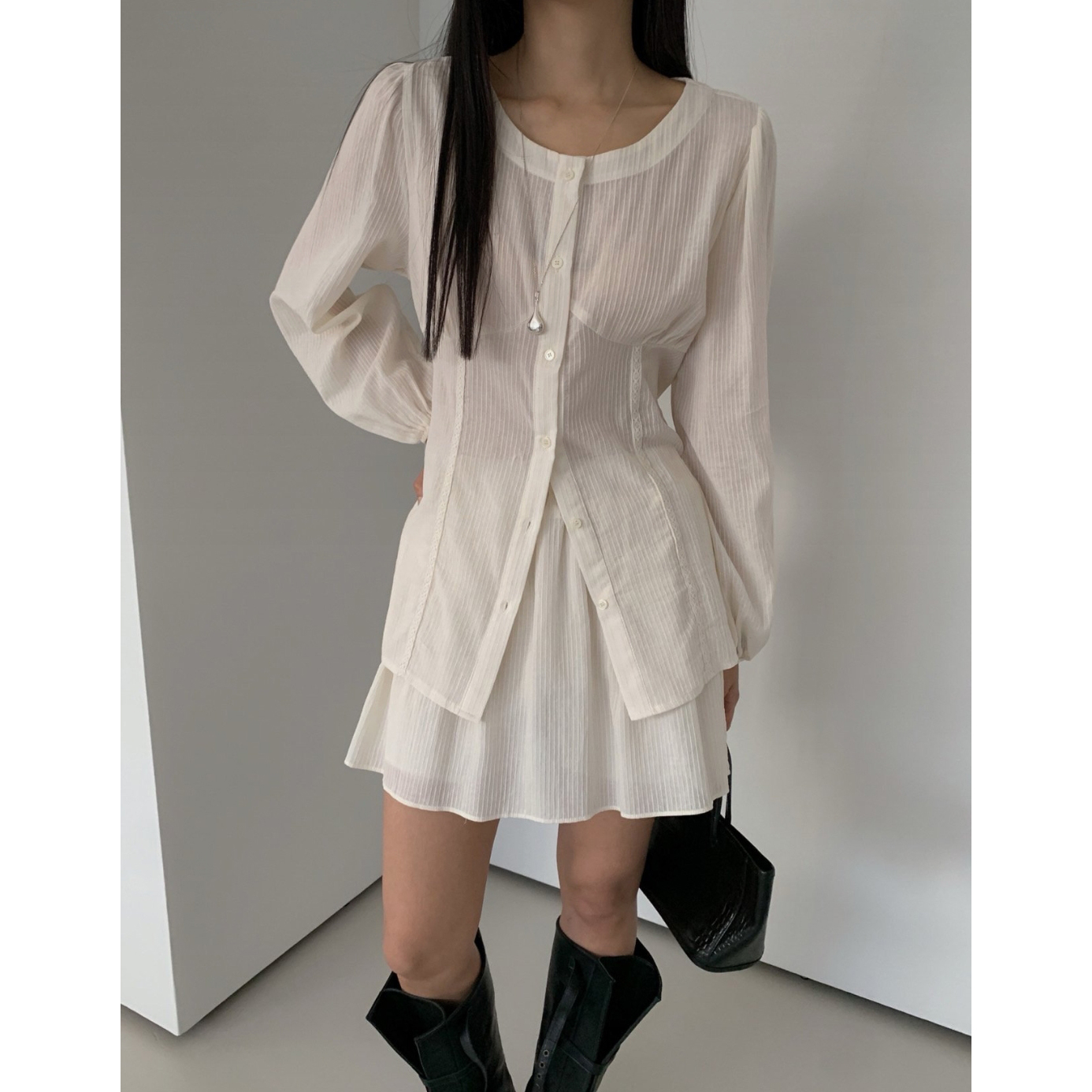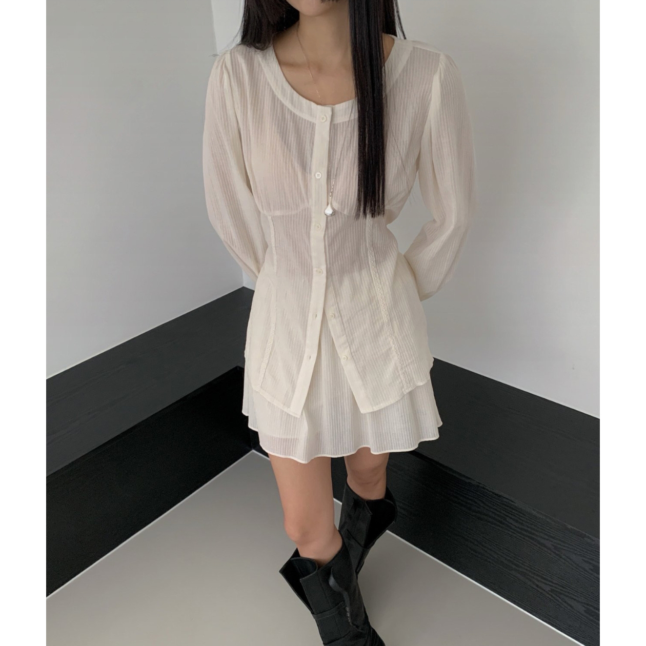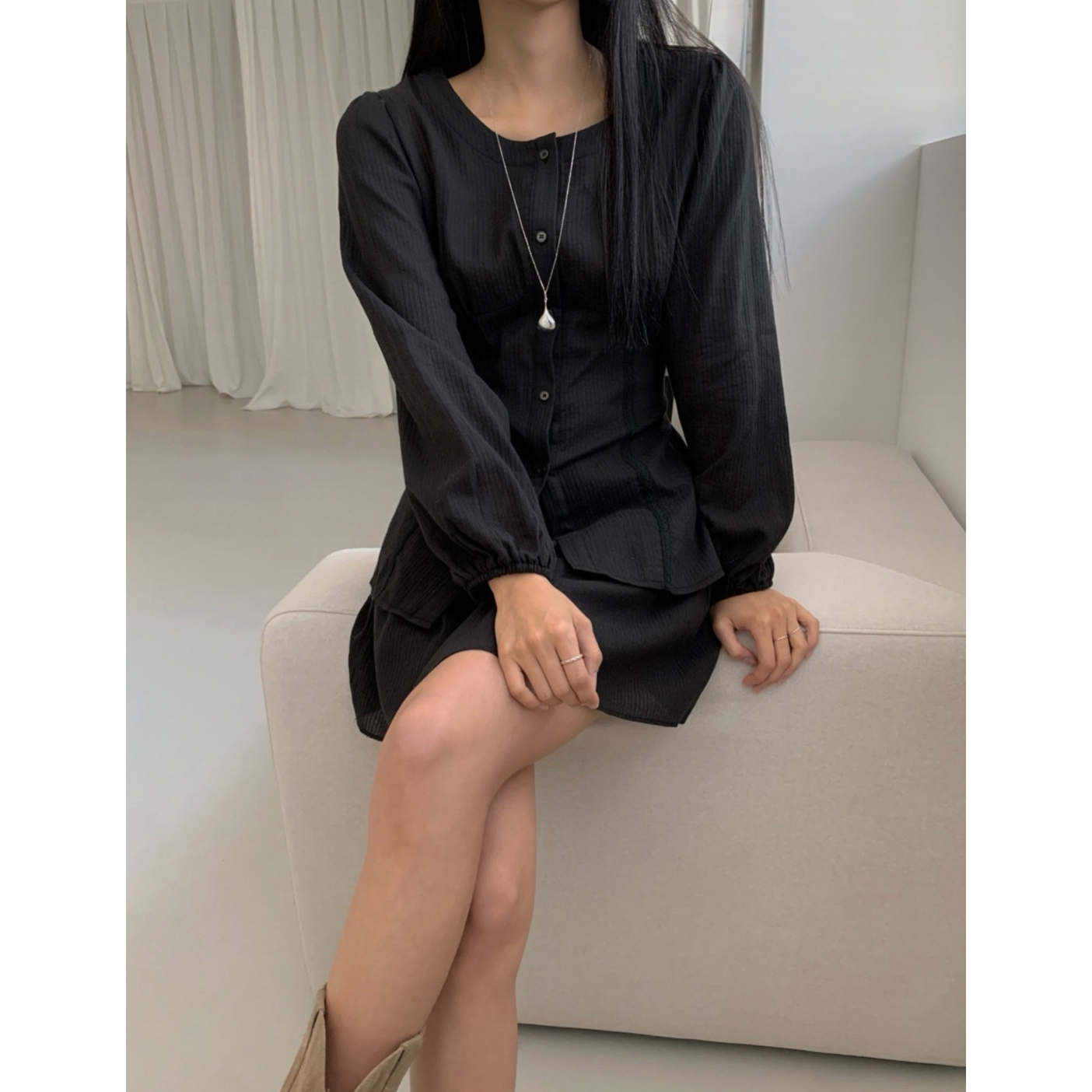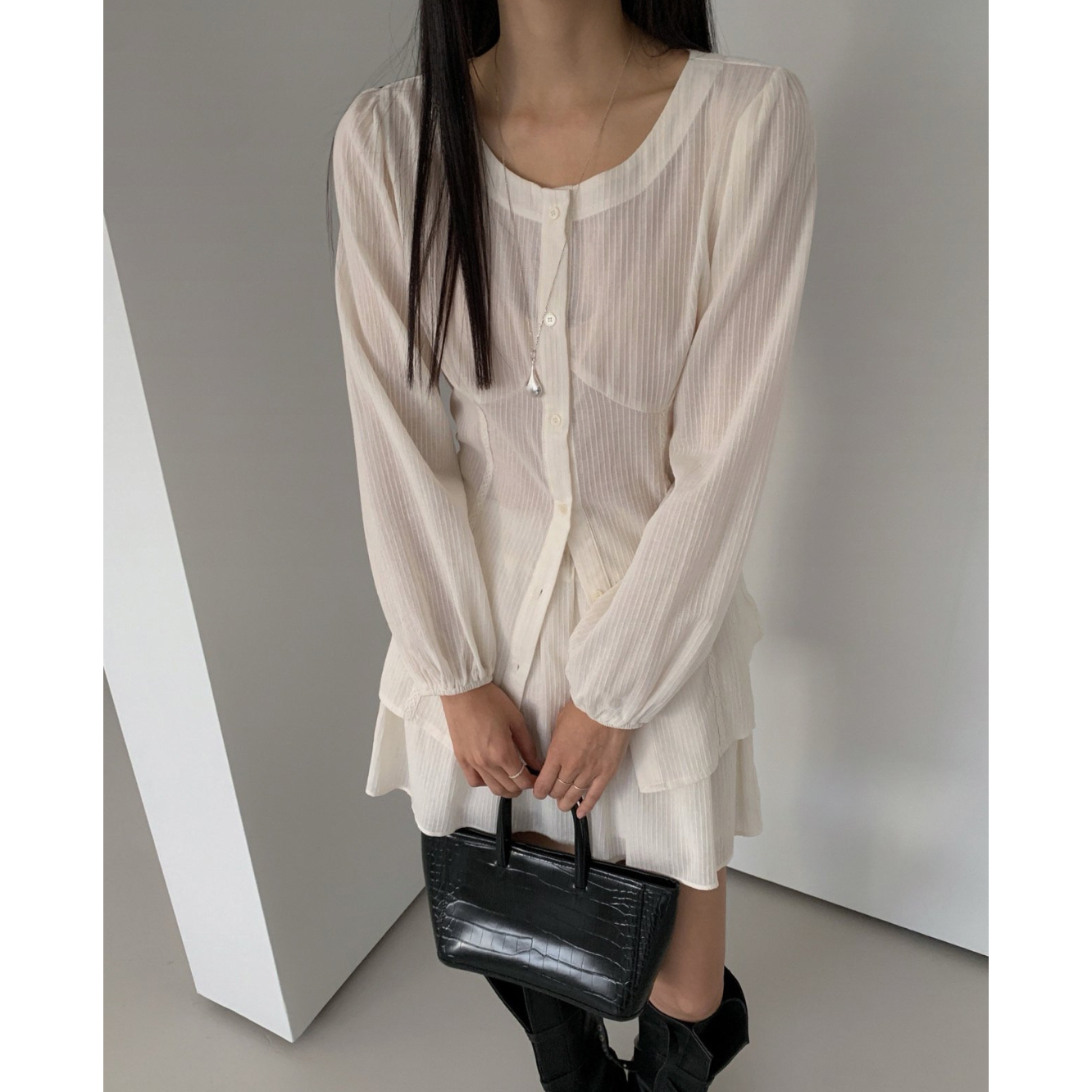 머랭 쉬폰 셔링 트임 롱 블라우스