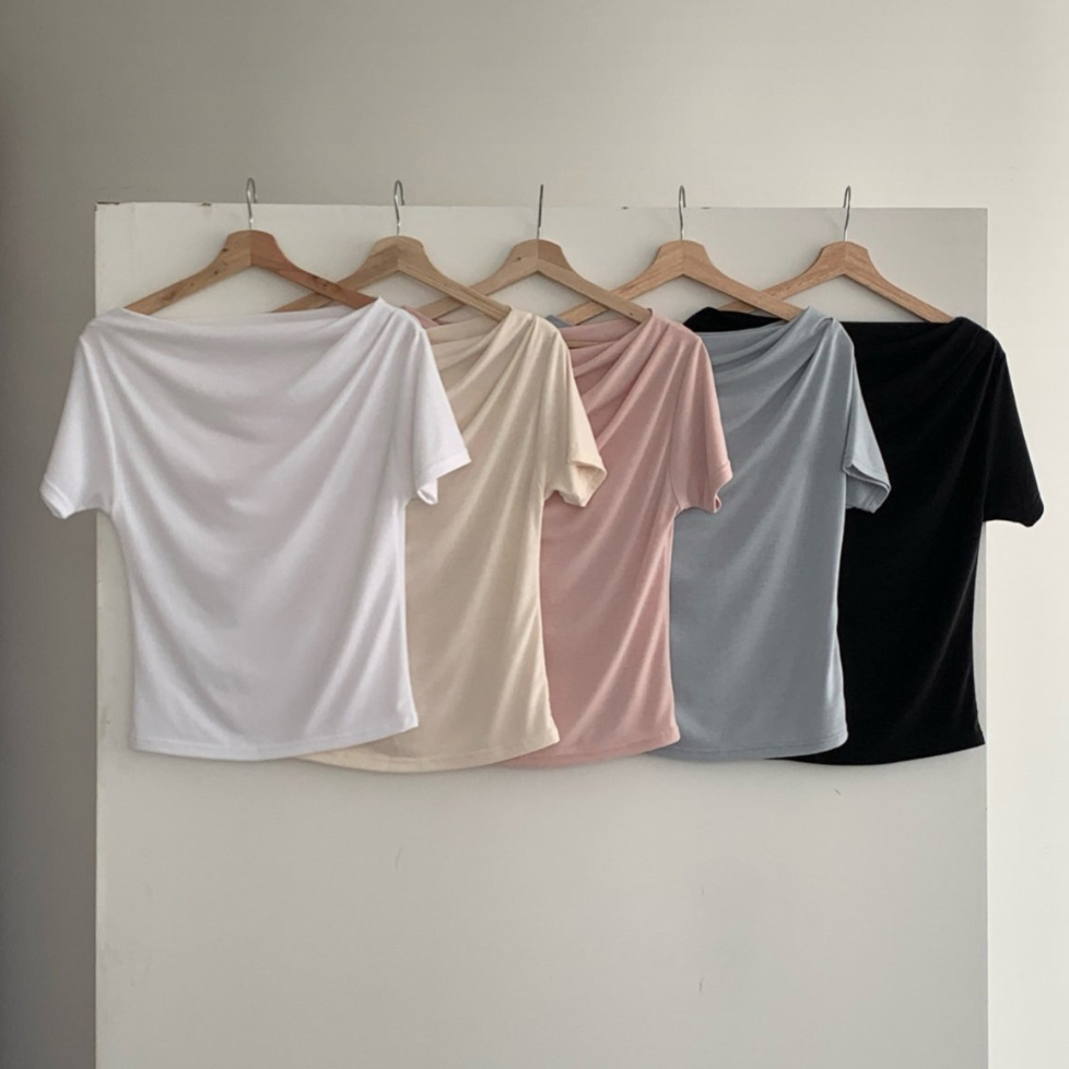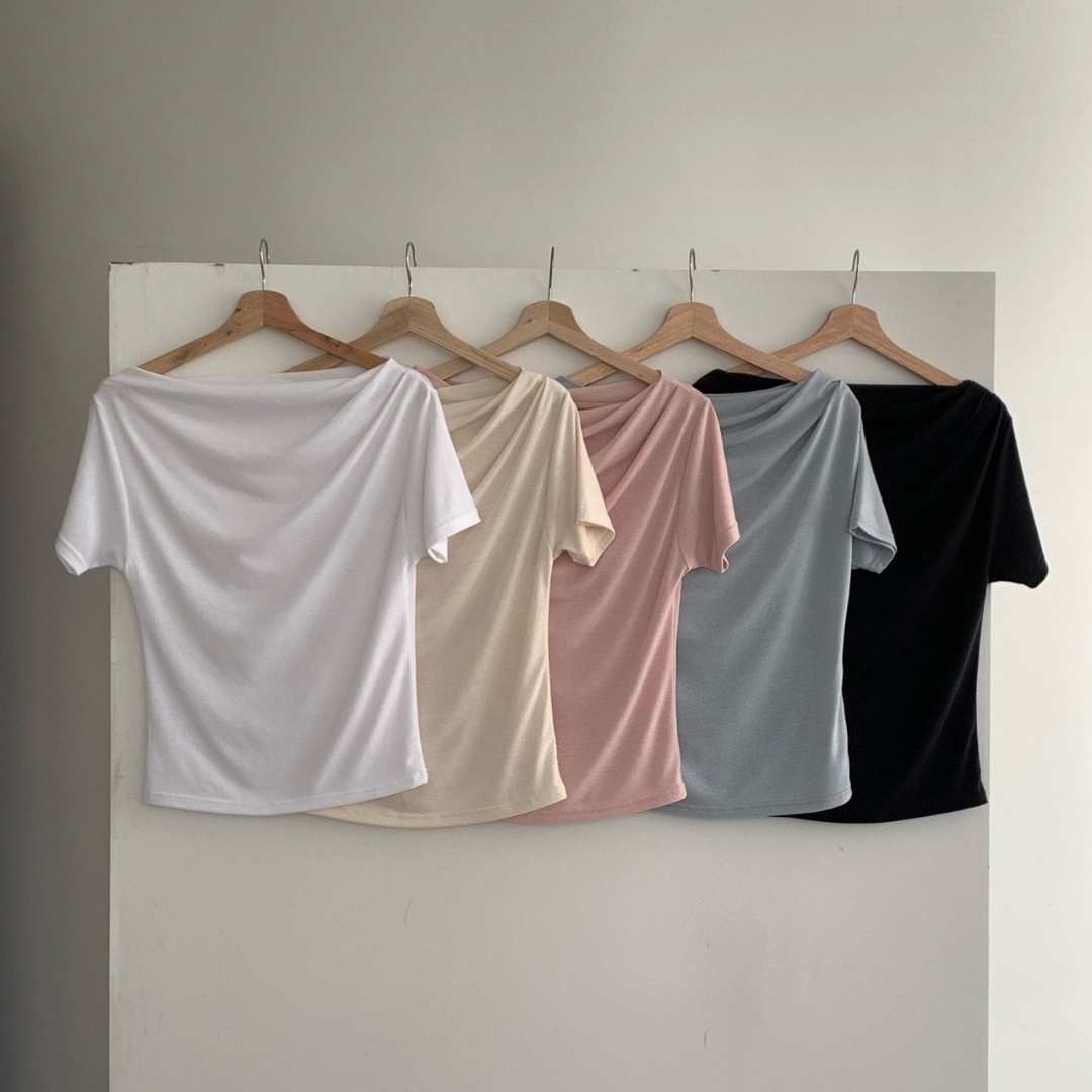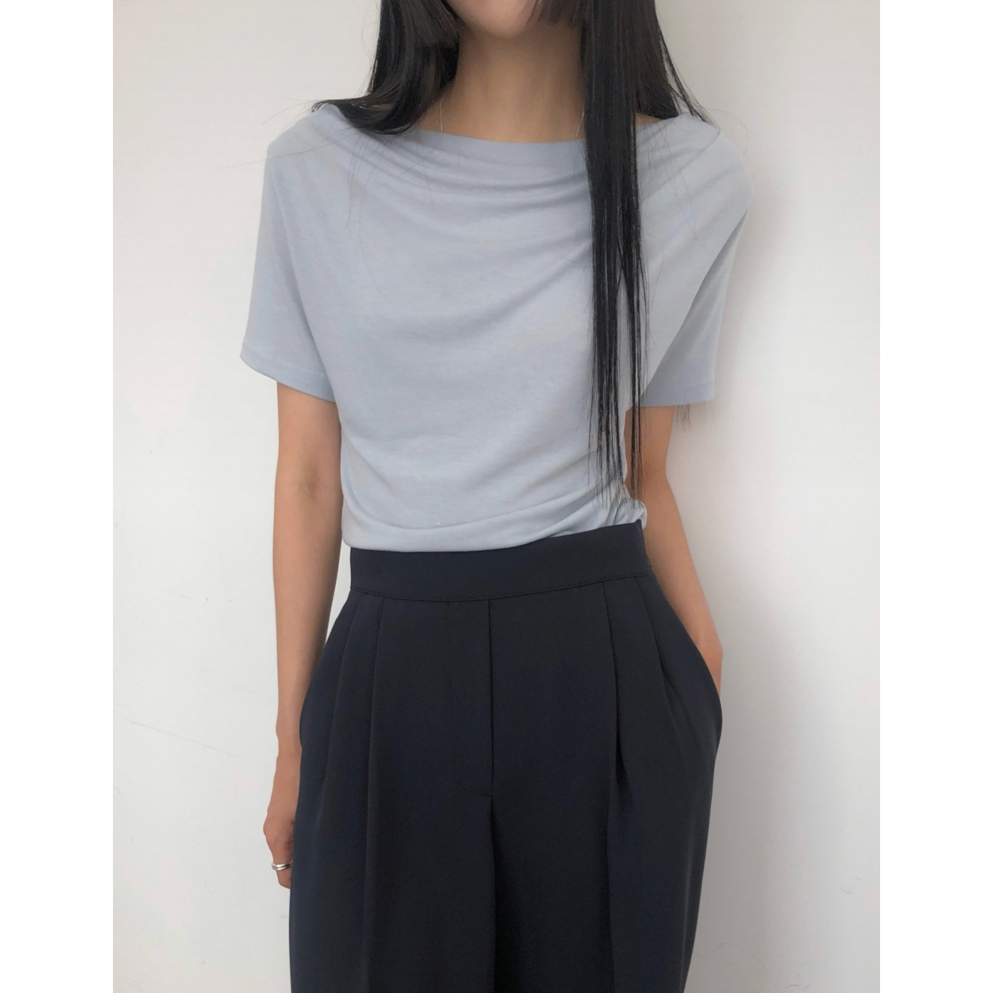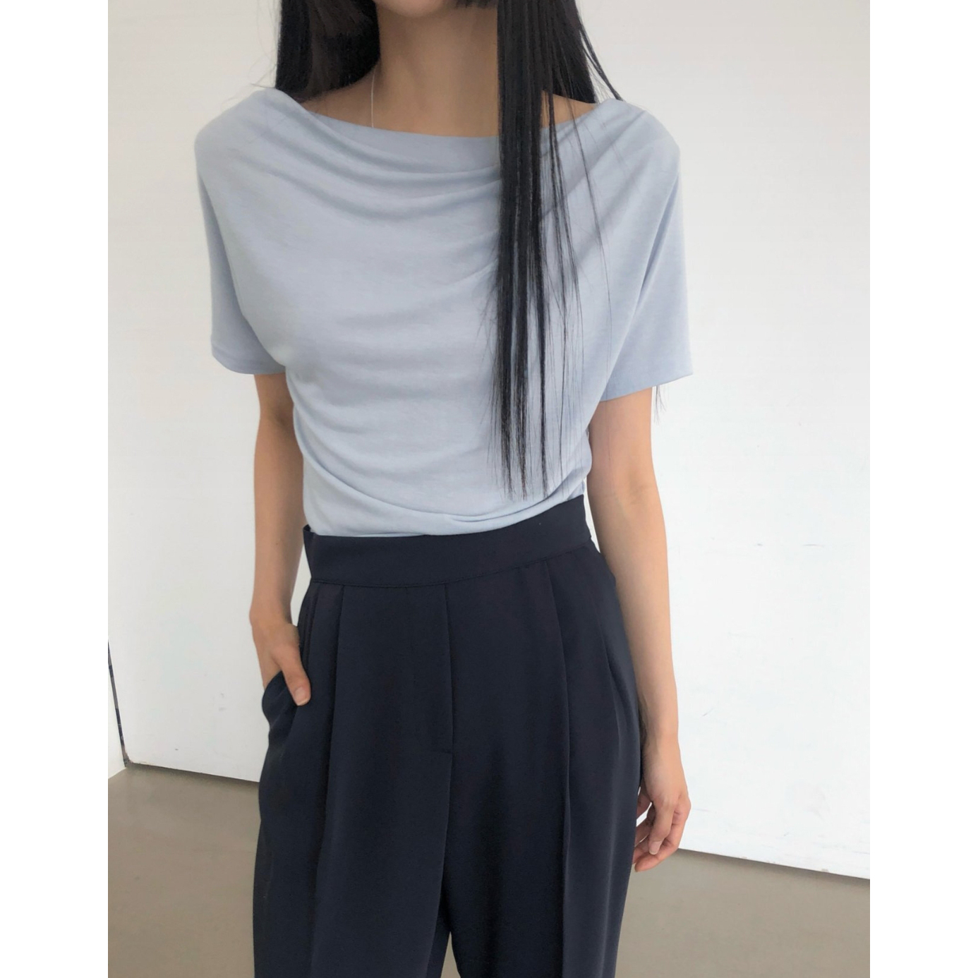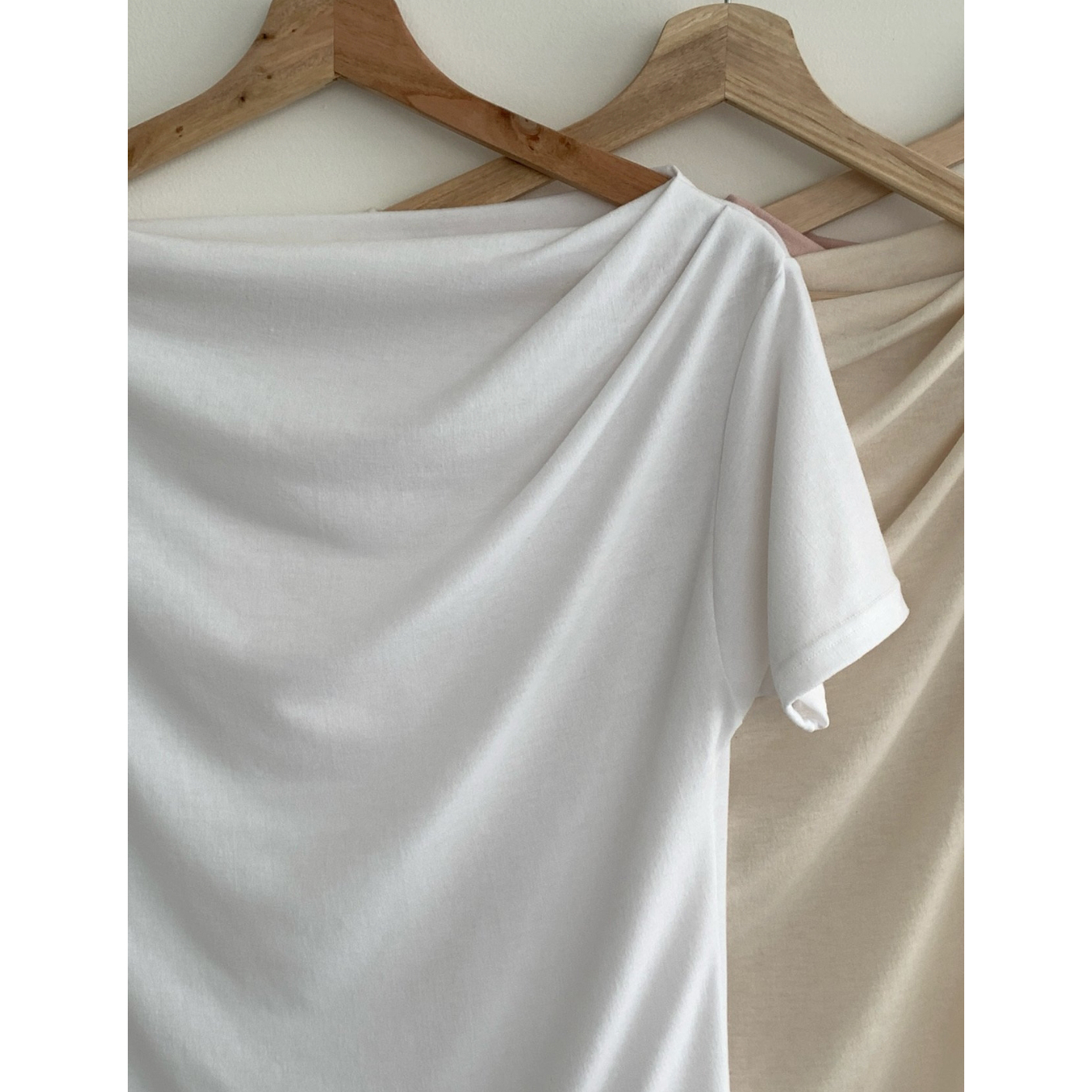 드레이프 셔링 보트넥 오프숄더 반팔티