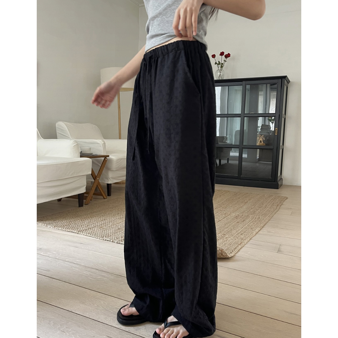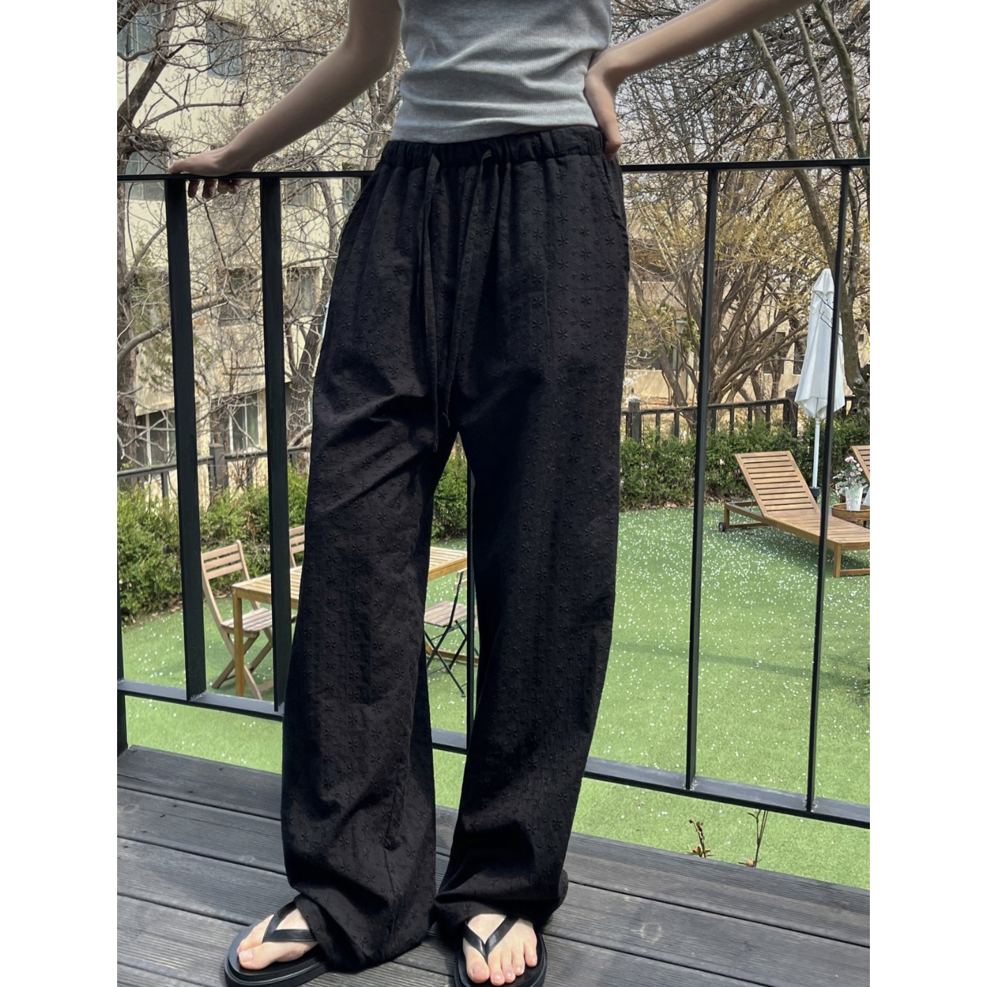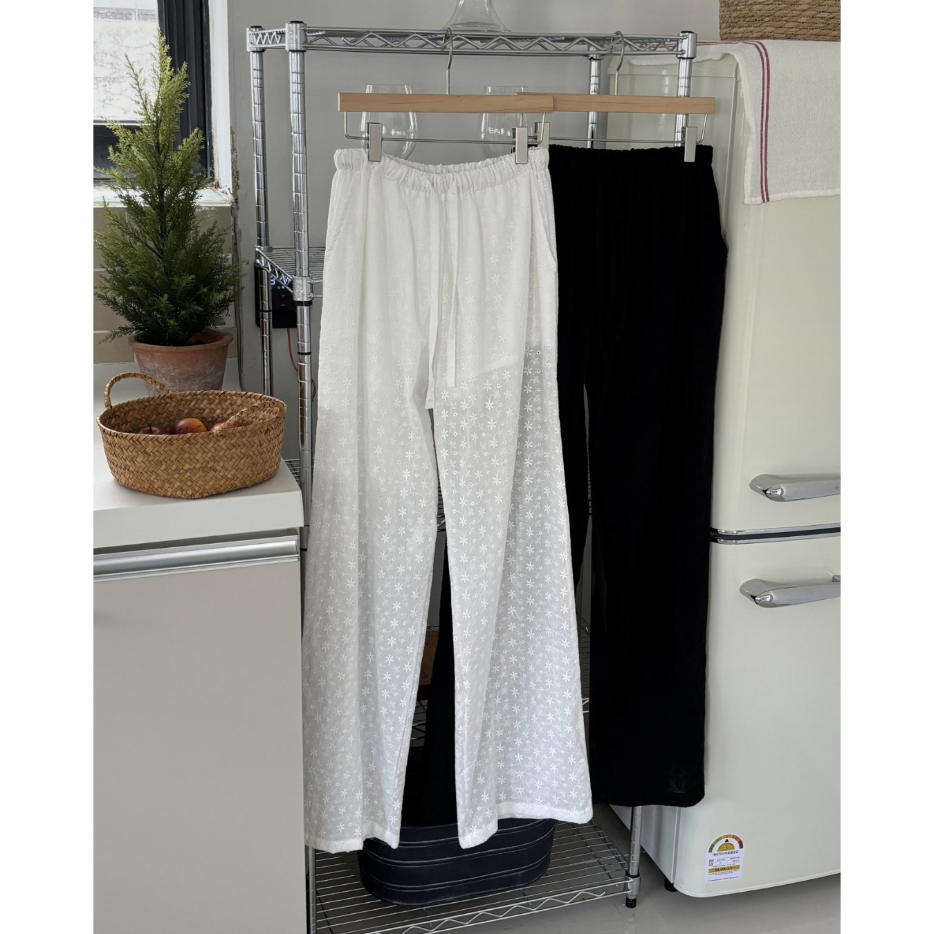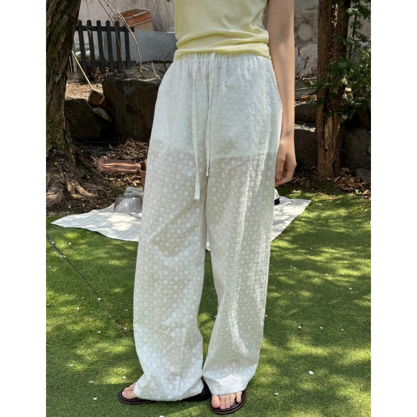 플라워 자수 펀칭 레이스 밴딩 와이드 팬츠
