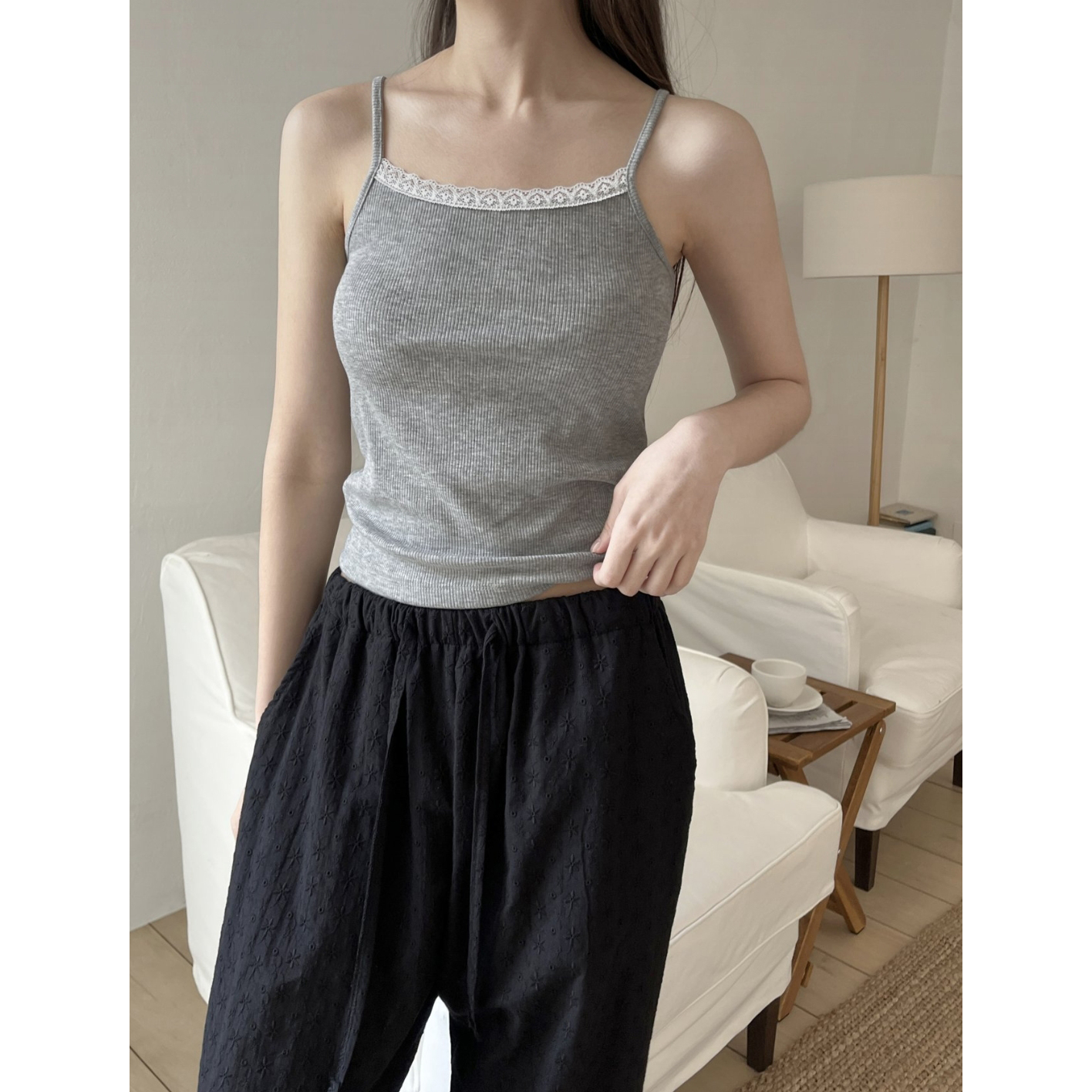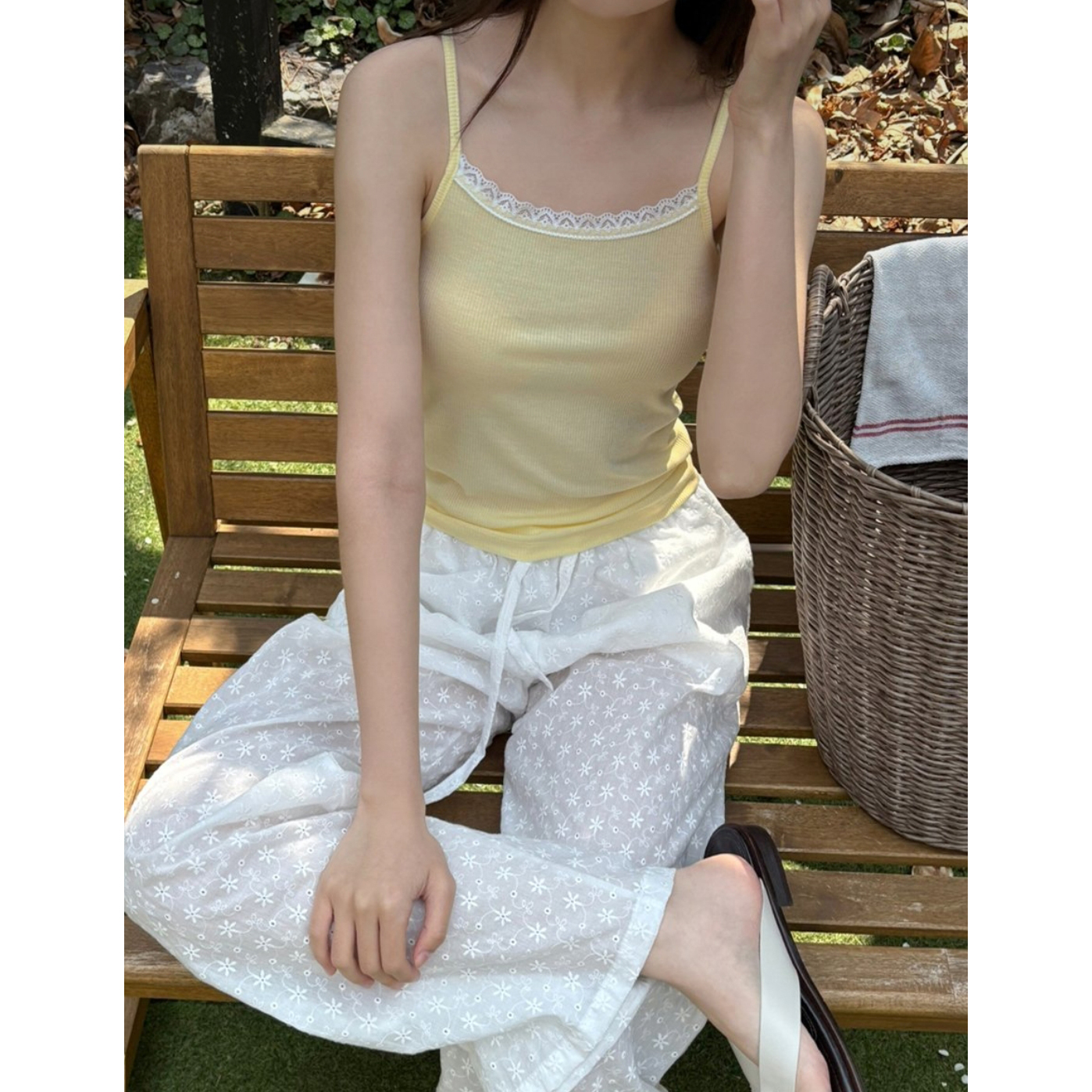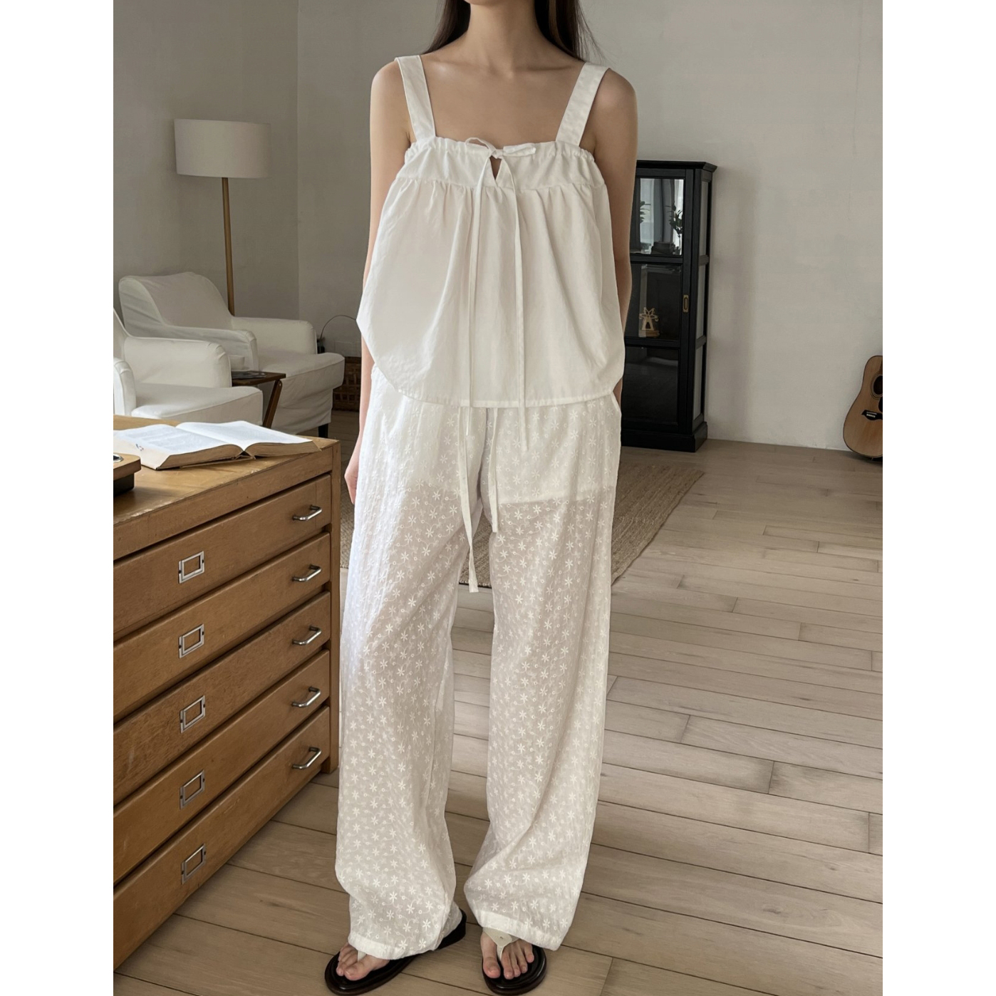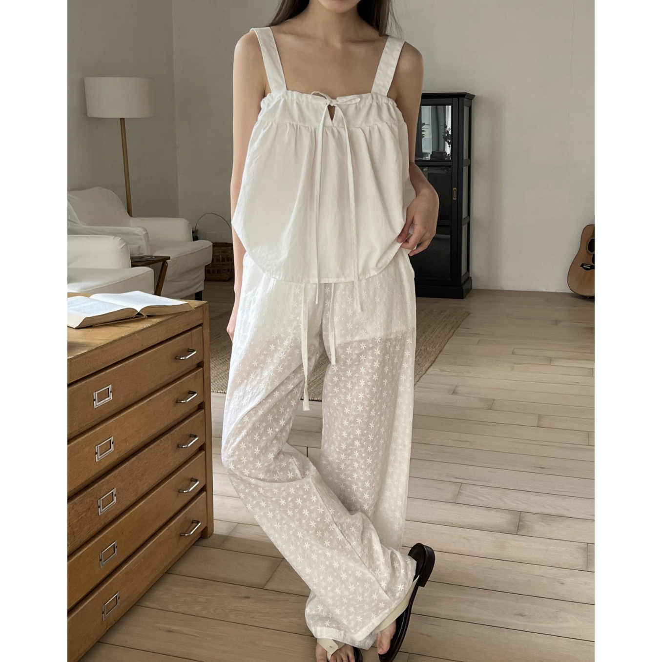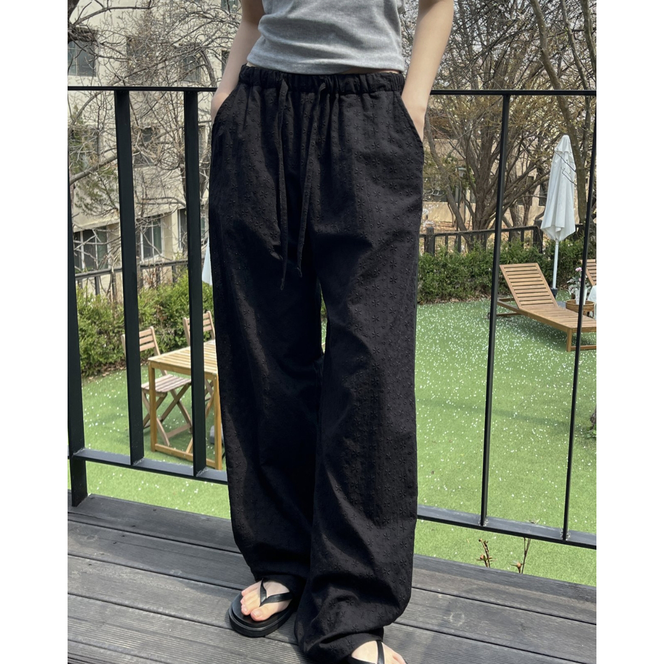 플라워 자수 펀칭 레이스 밴딩 와이드 팬츠