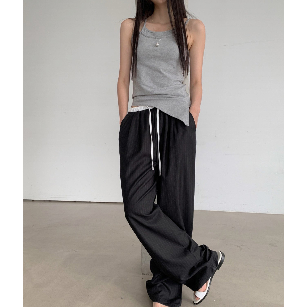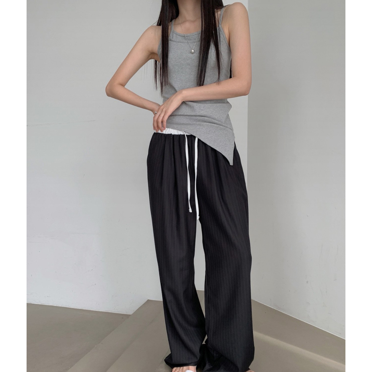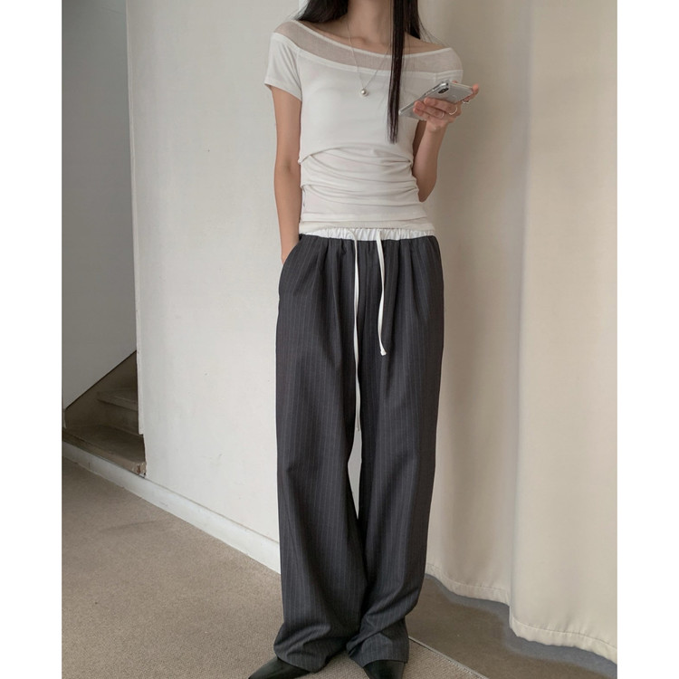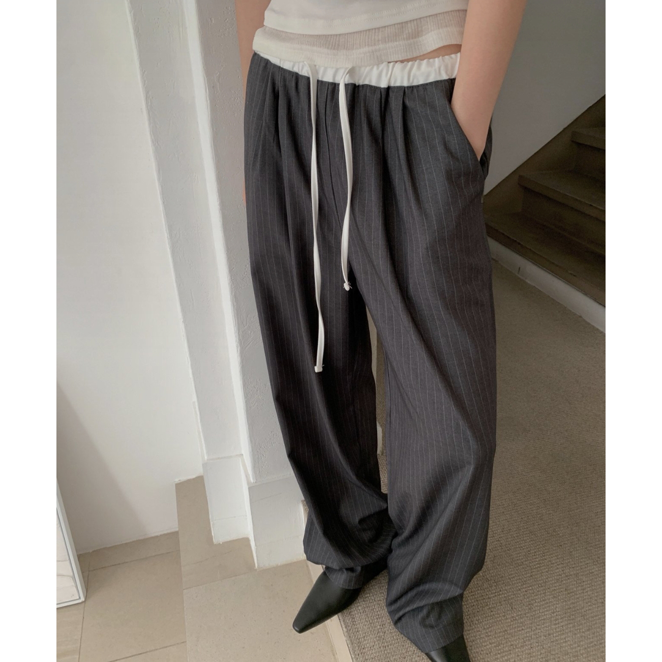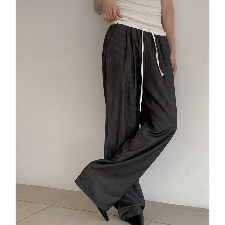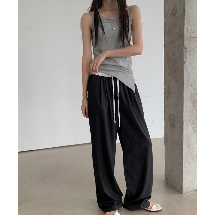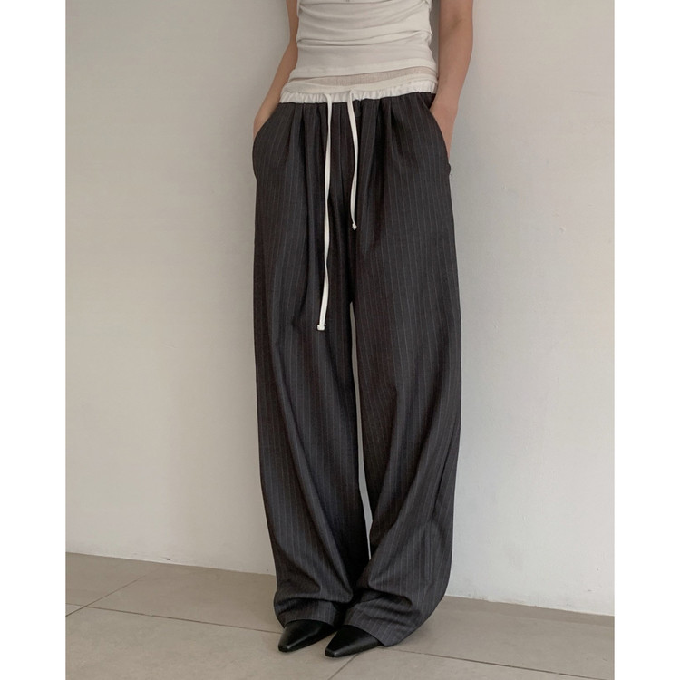 포토 스트라이프 배색 슬랙스 밴딩 팬츠