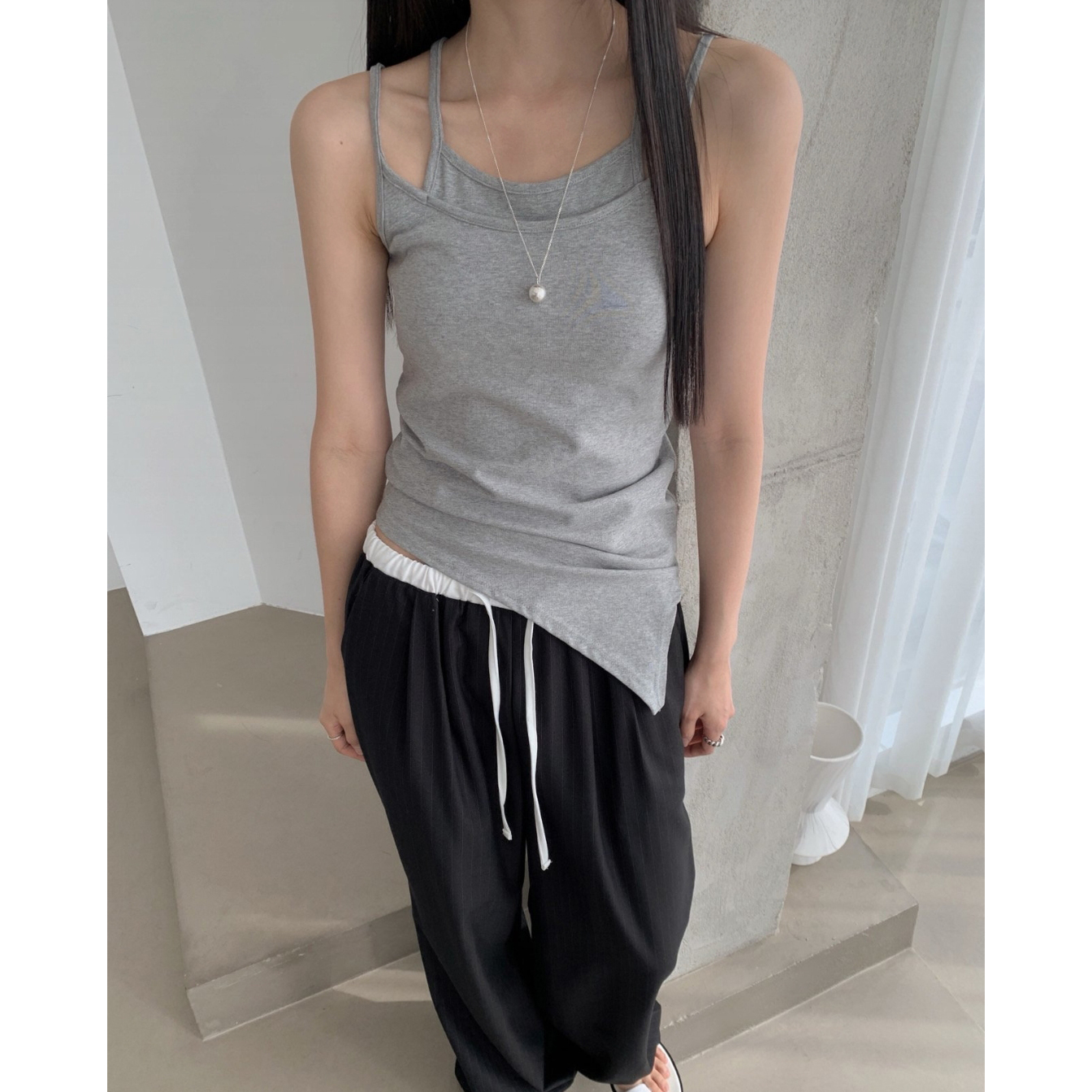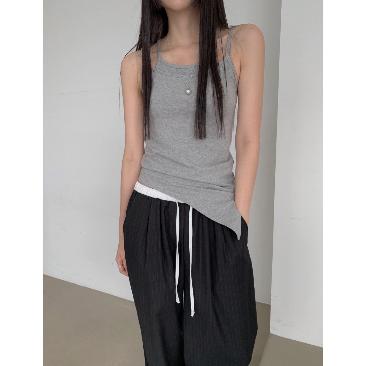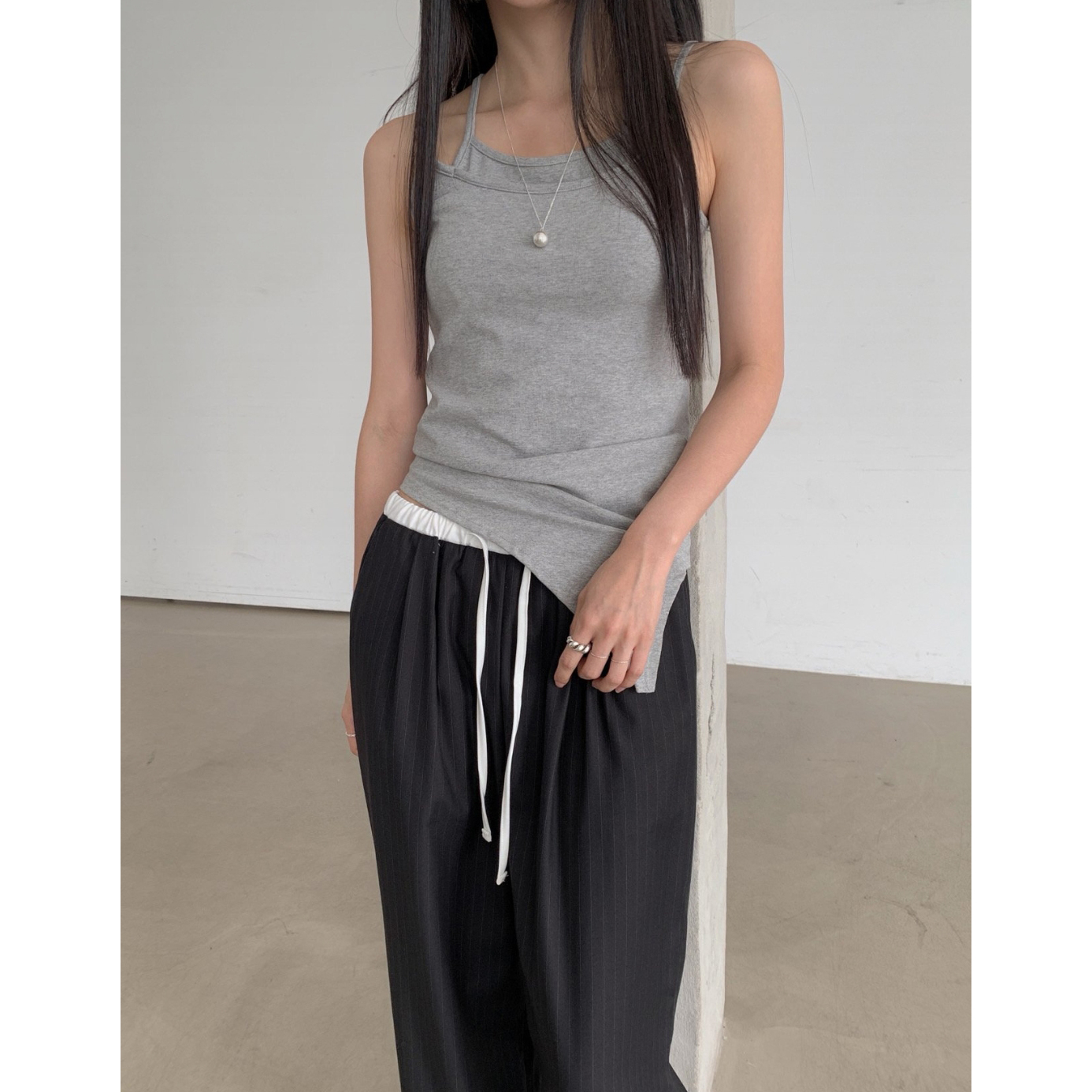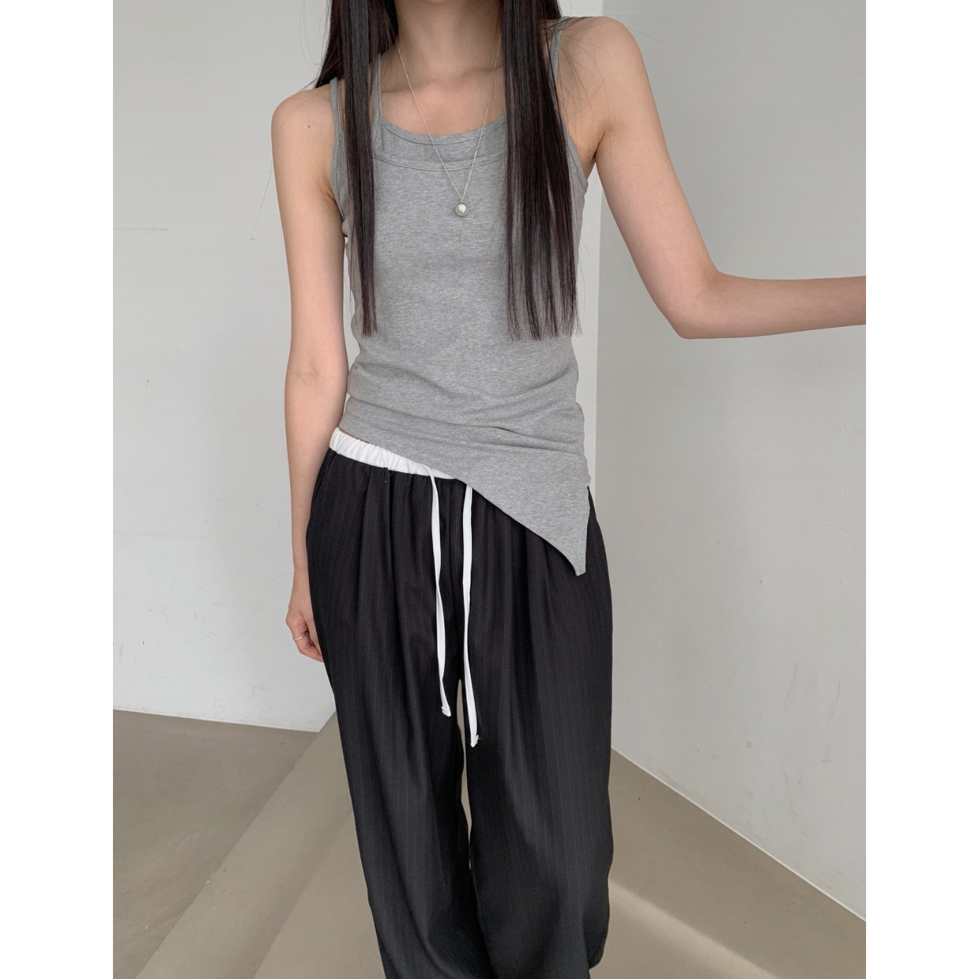 포토 스트라이프 배색 슬랙스 밴딩 팬츠