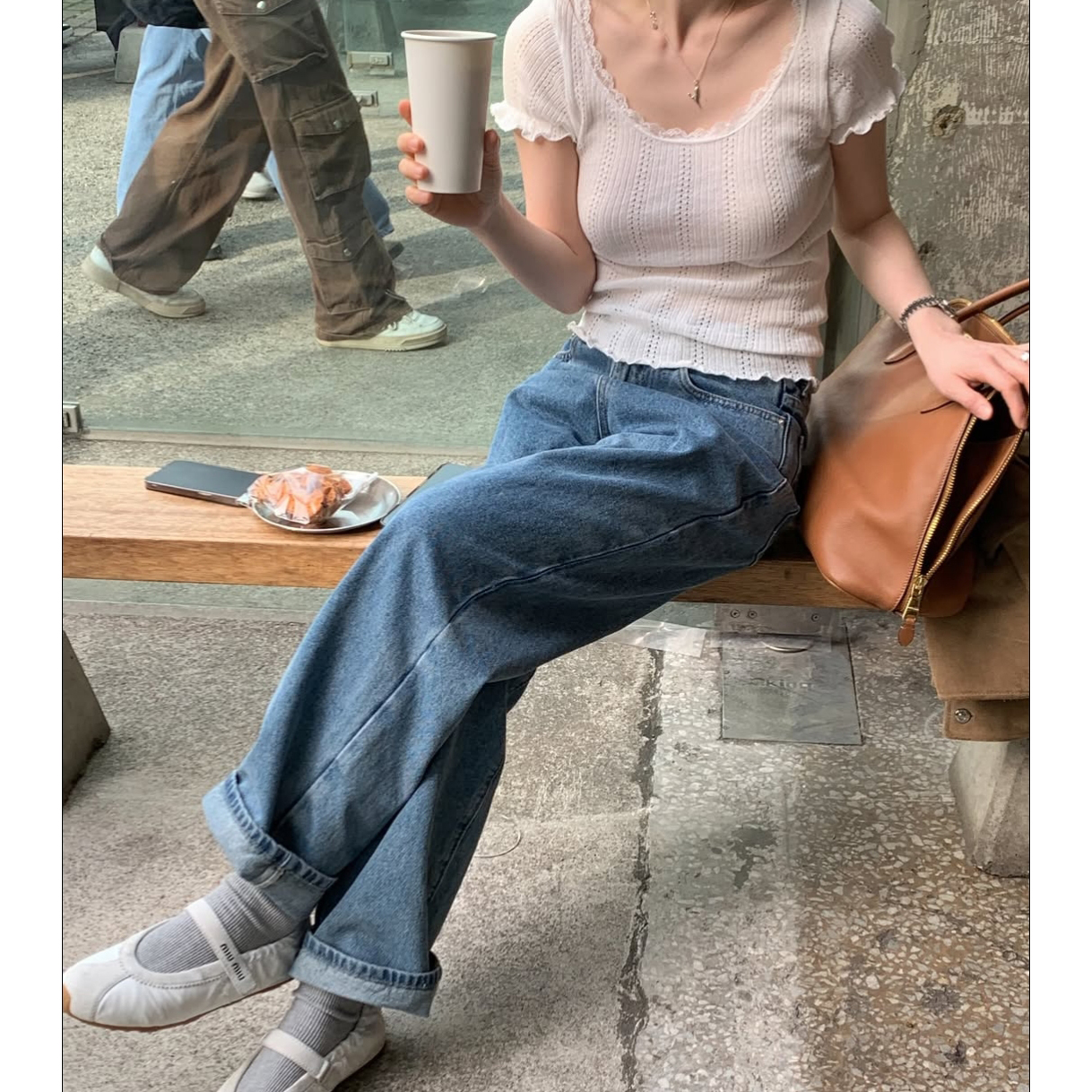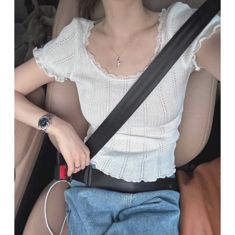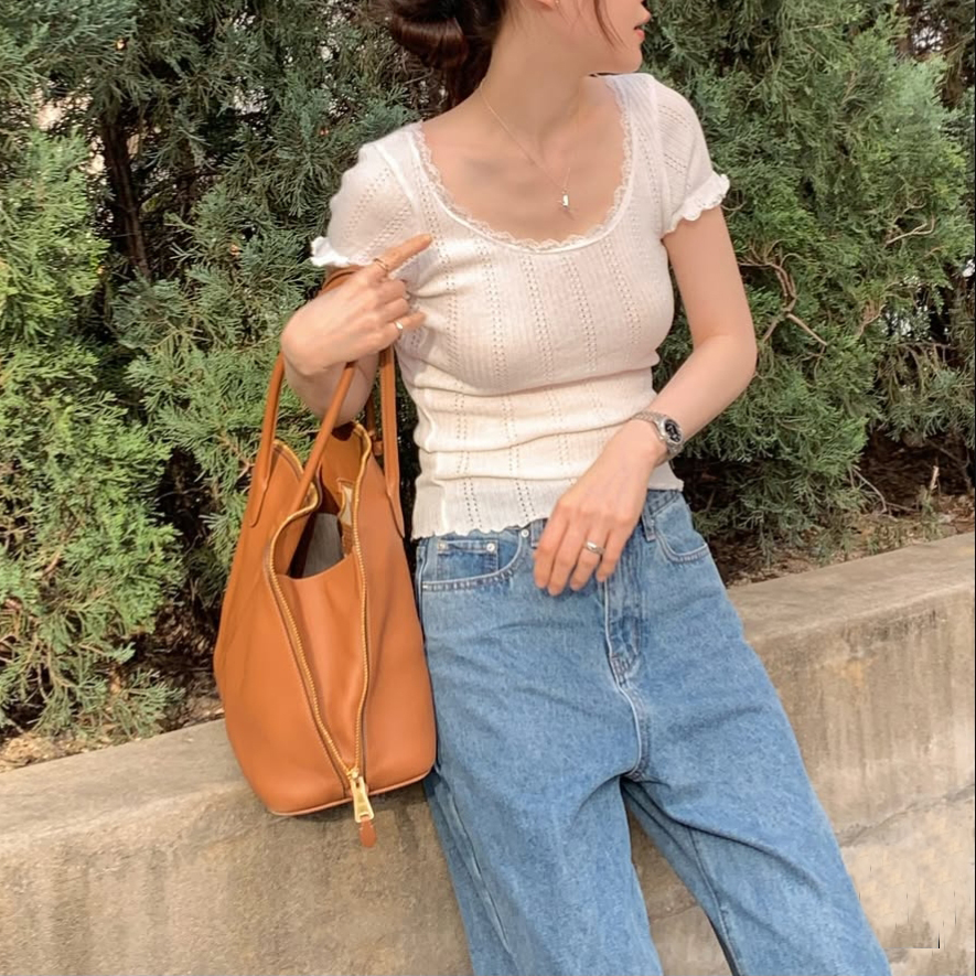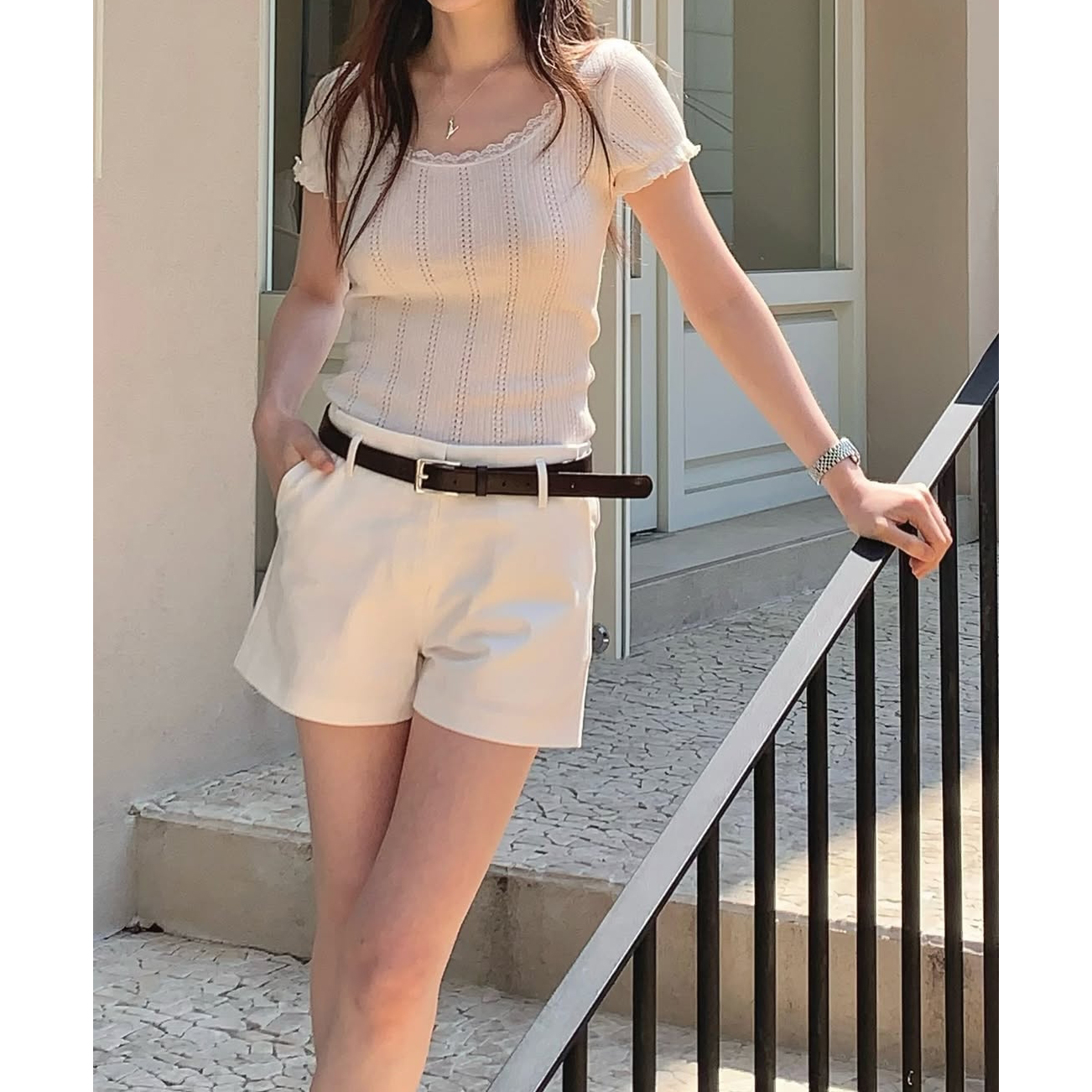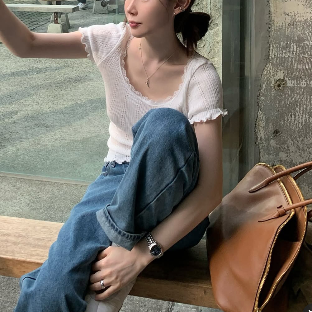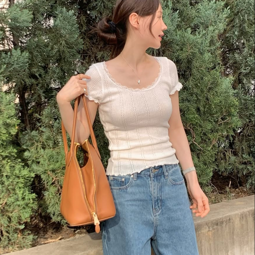 레이스 펀칭 반팔 퍼프니트 슬림티