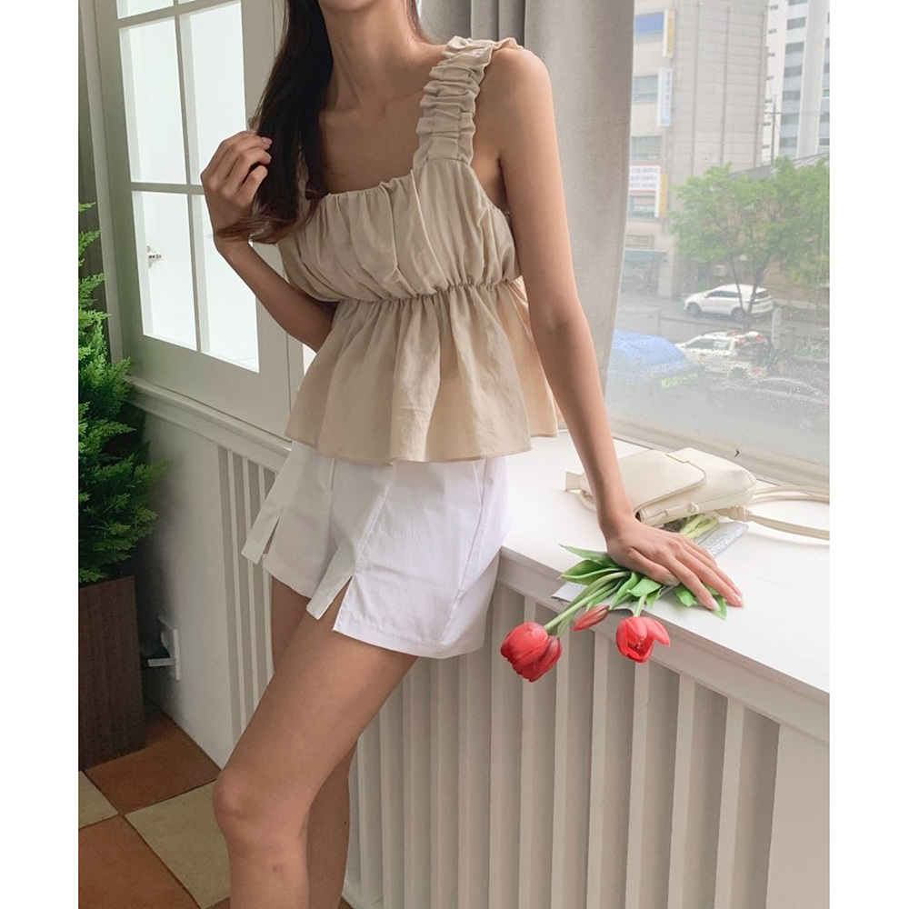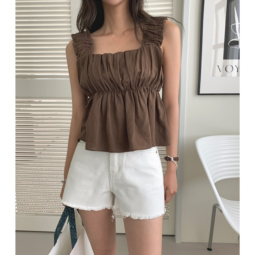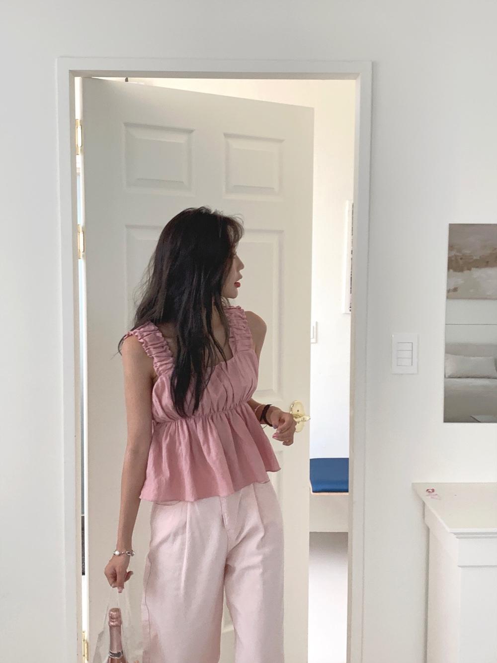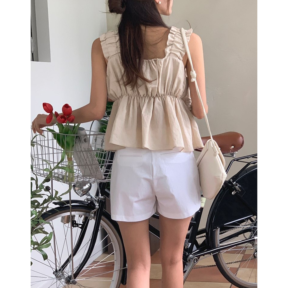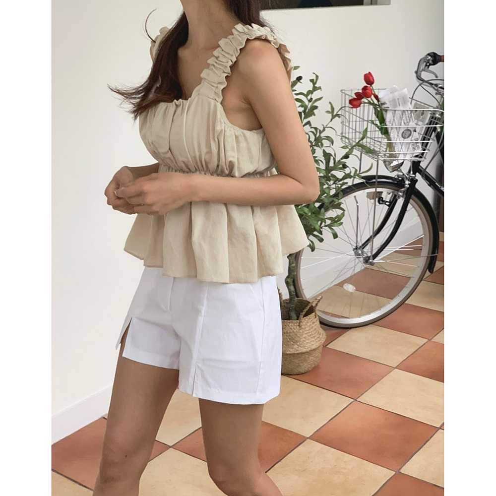 나비 린넨 스퀘어 나시 에이라인 셔링 크롭 블라우스