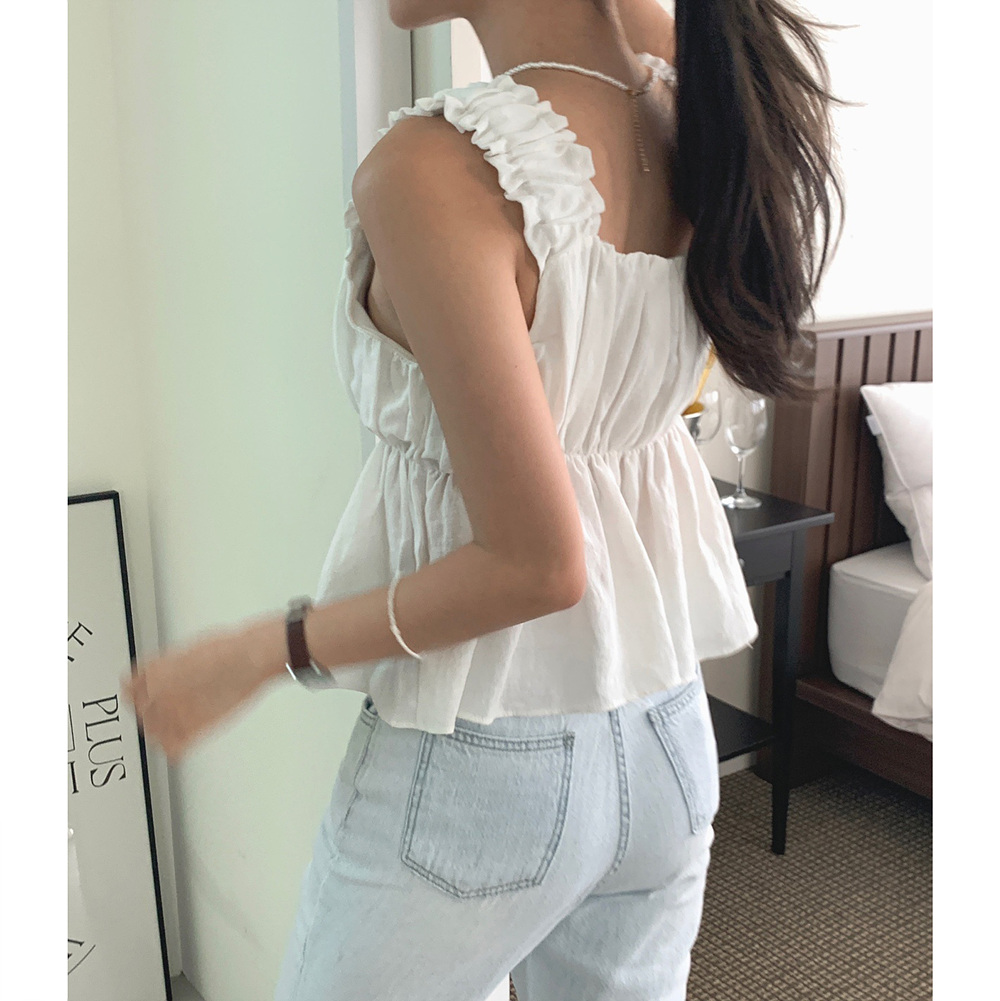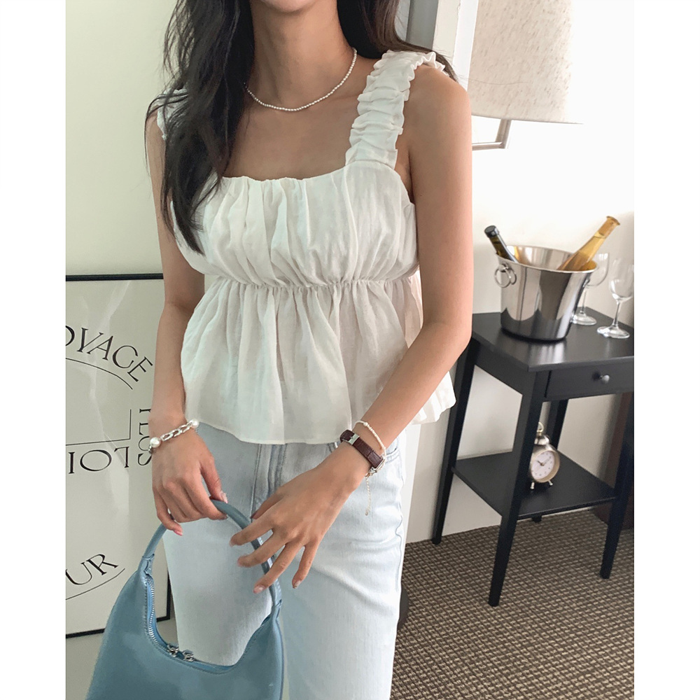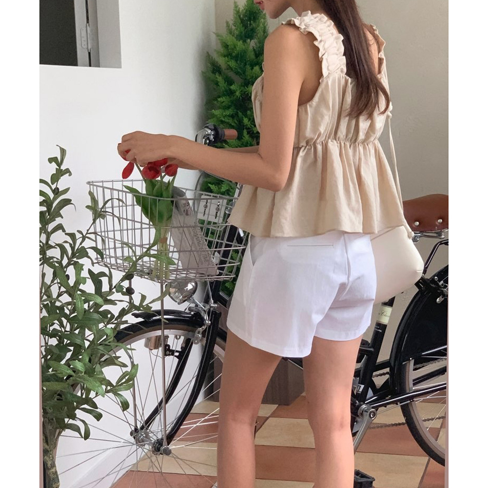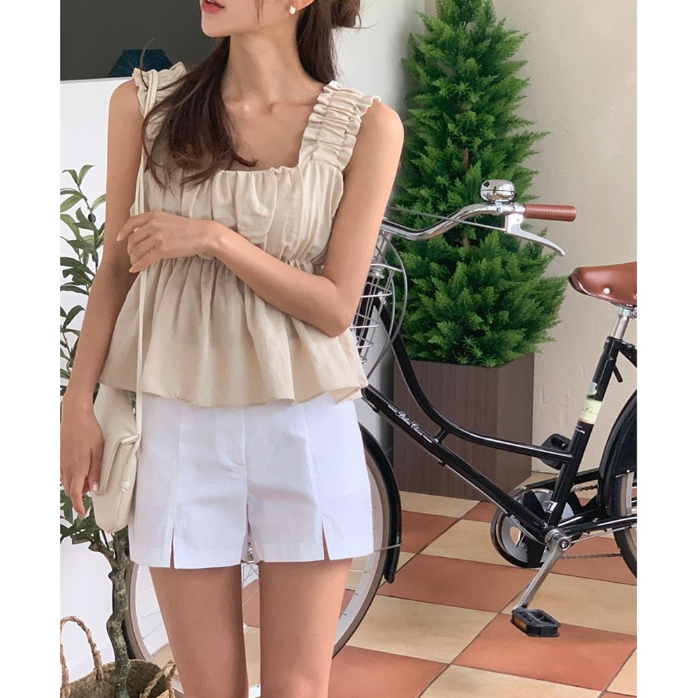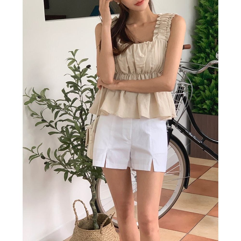 나비 린넨 스퀘어 나시 에이라인 셔링 크롭 블라우스