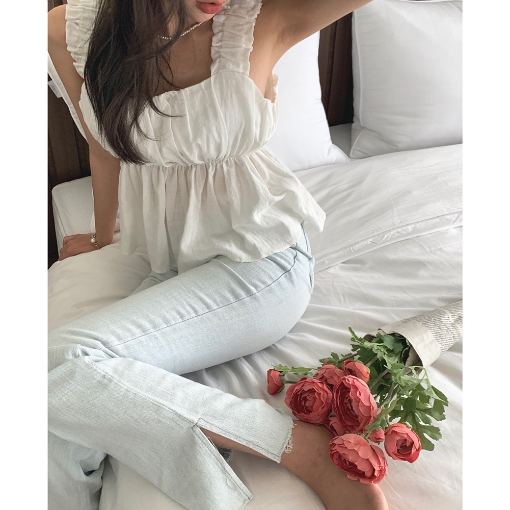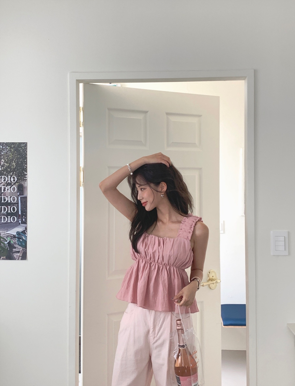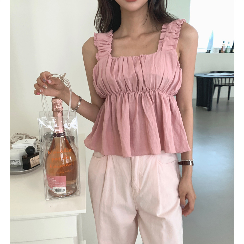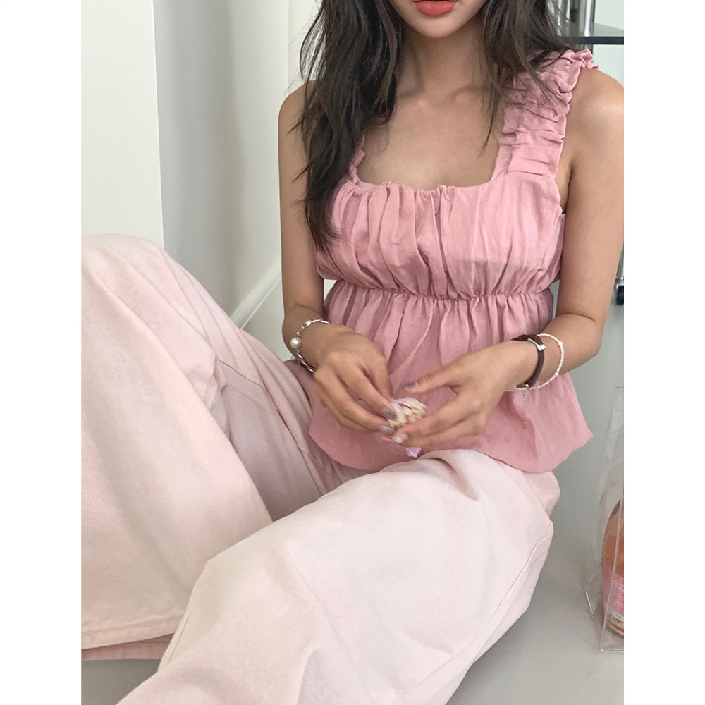 나비 린넨 스퀘어 나시 에이라인 셔링 크롭 블라우스
