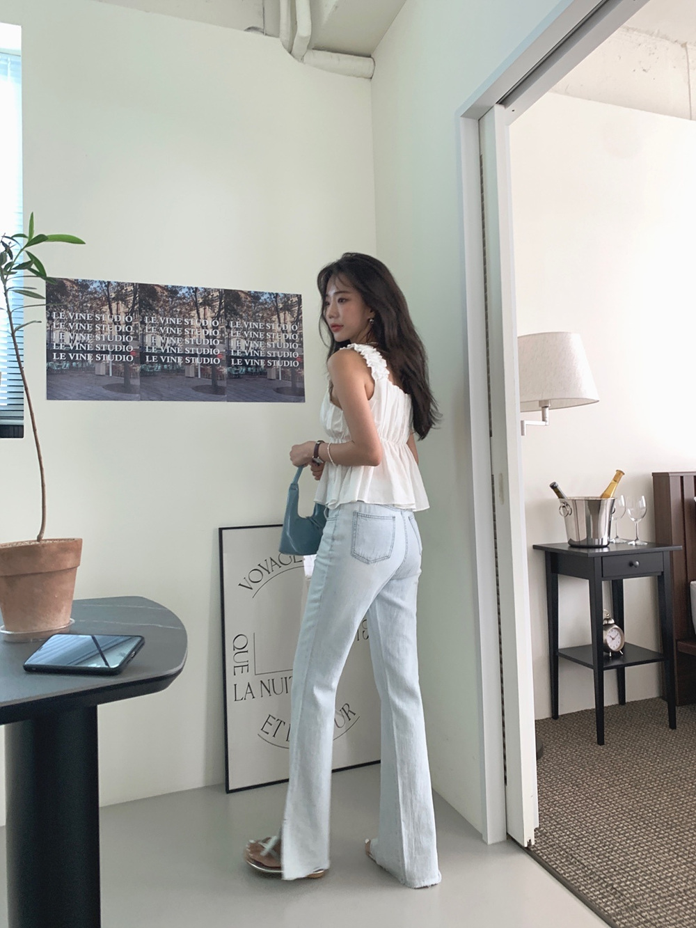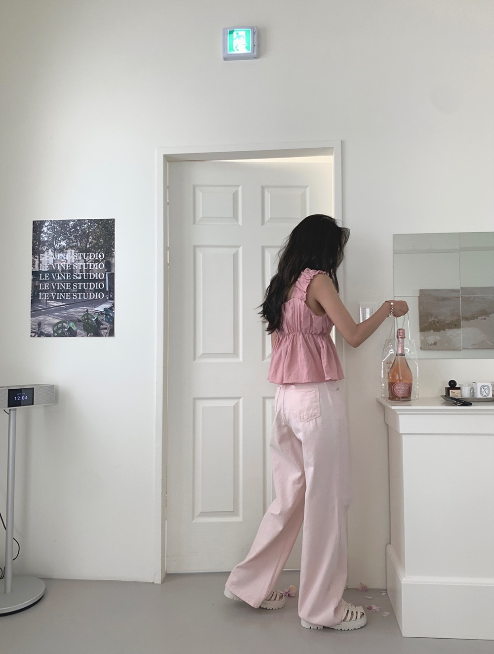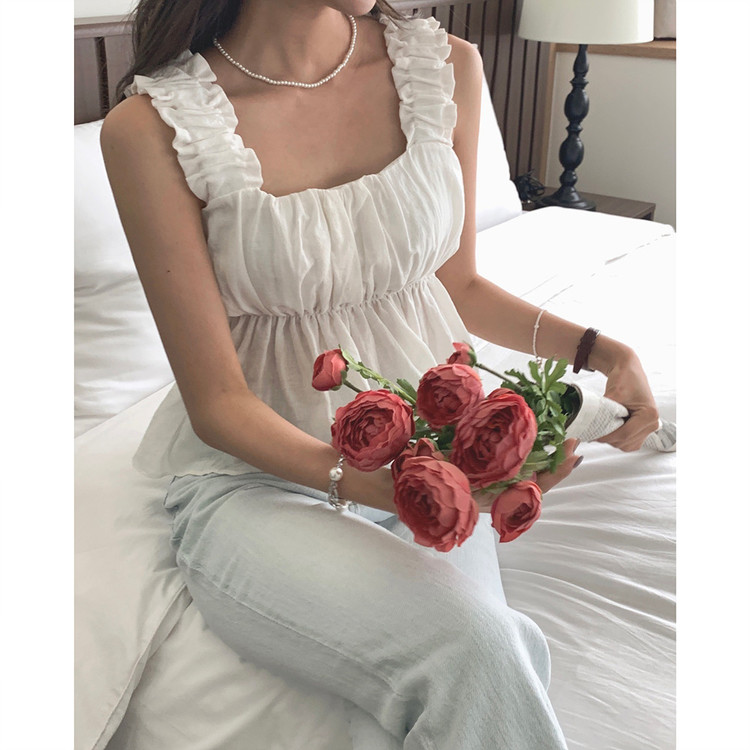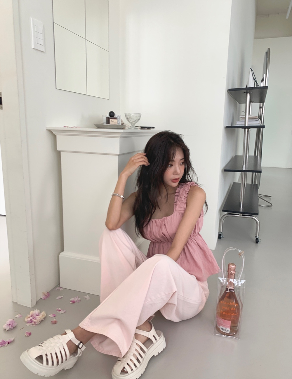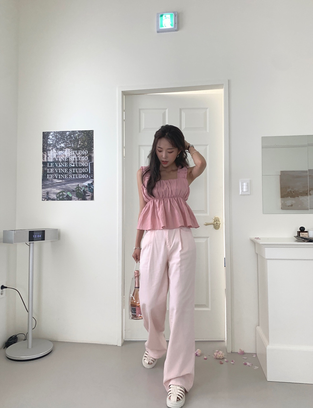 나비 린넨 스퀘어 나시 에이라인 셔링 크롭 블라우스