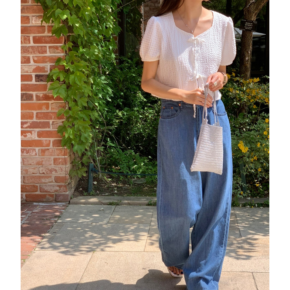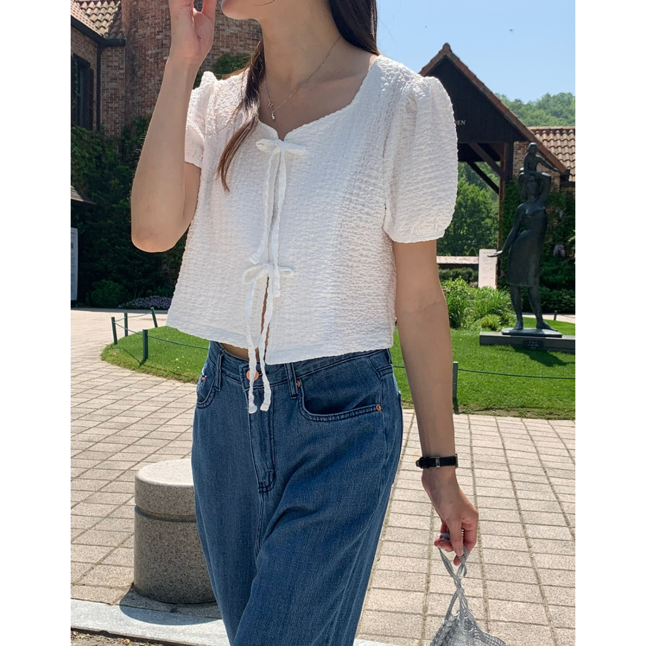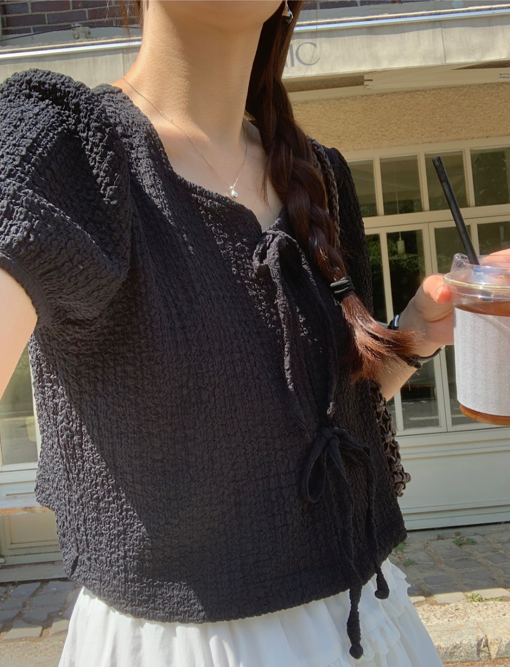 리본 볼드 엠보 블라우스 퍼프 리본 볼레로