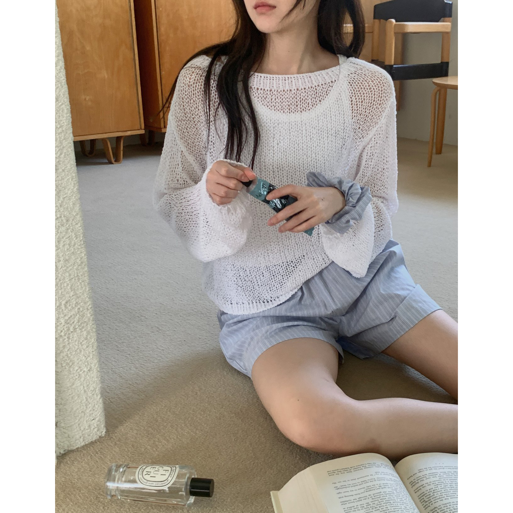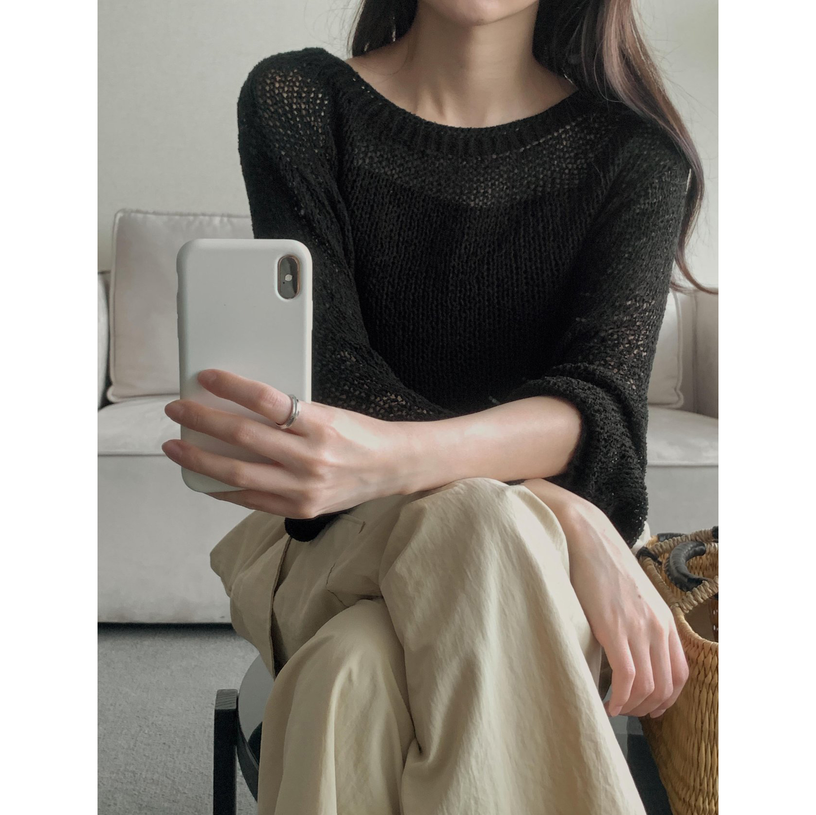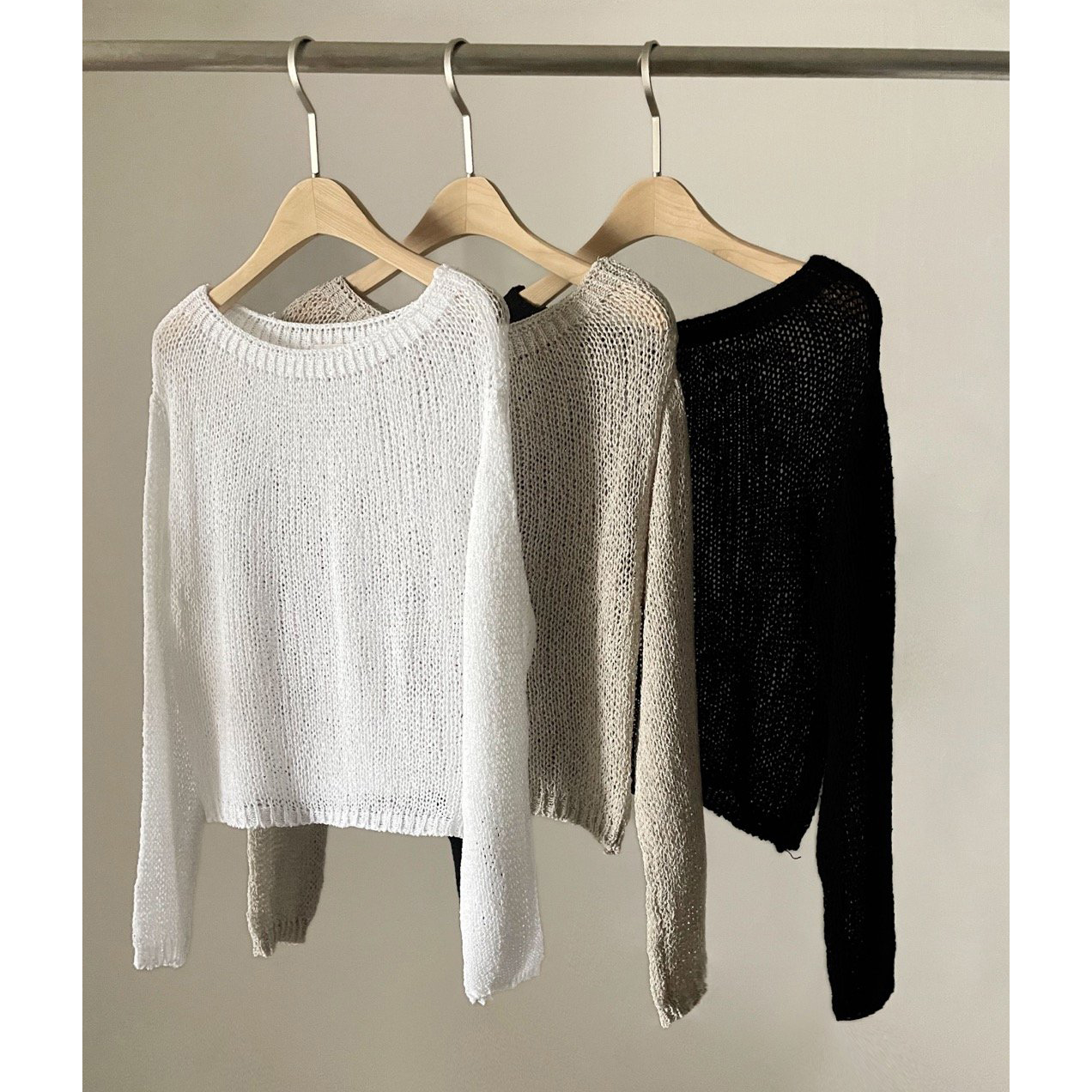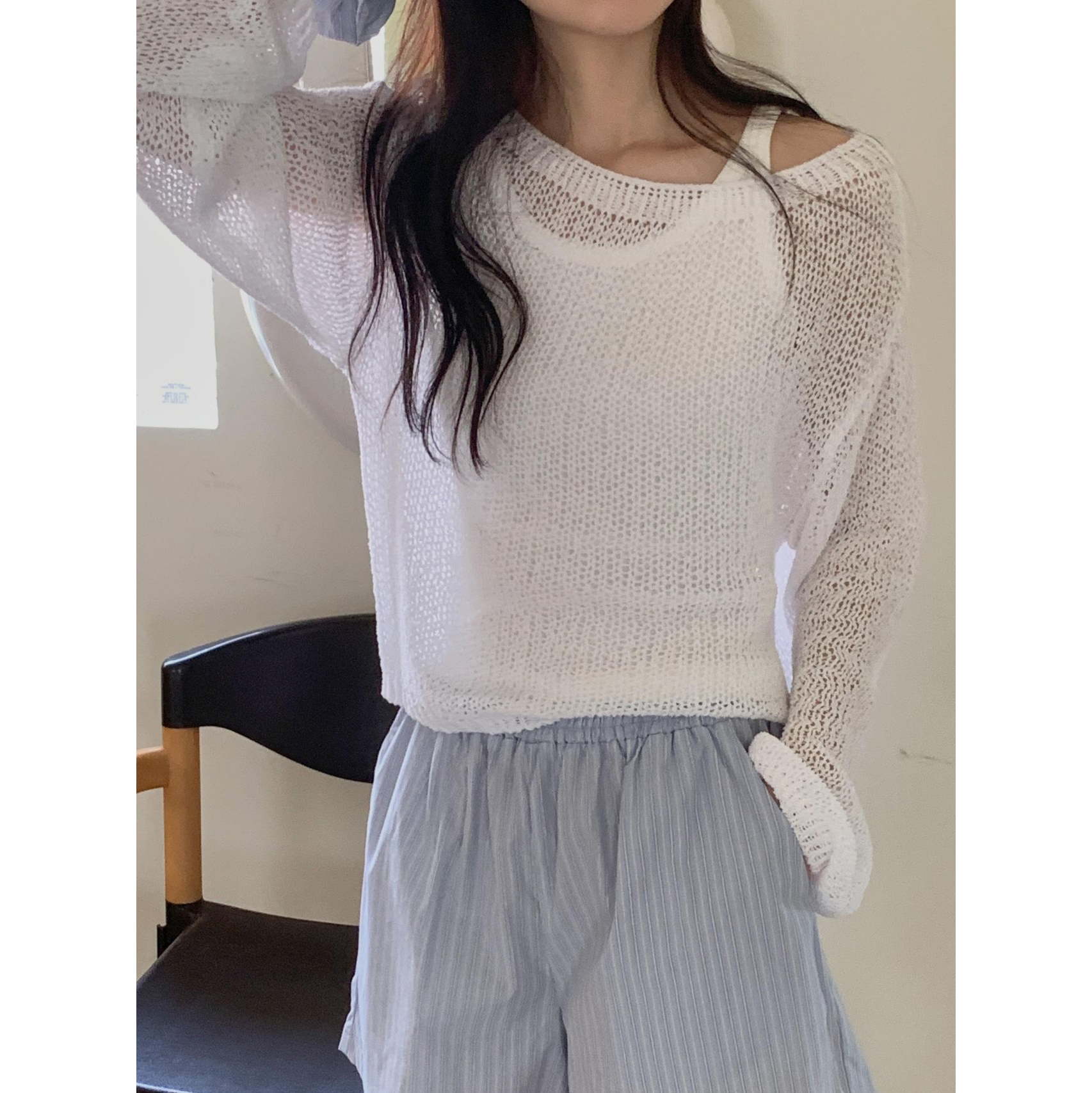보아 여름 보트넥 그물 긴팔 니트