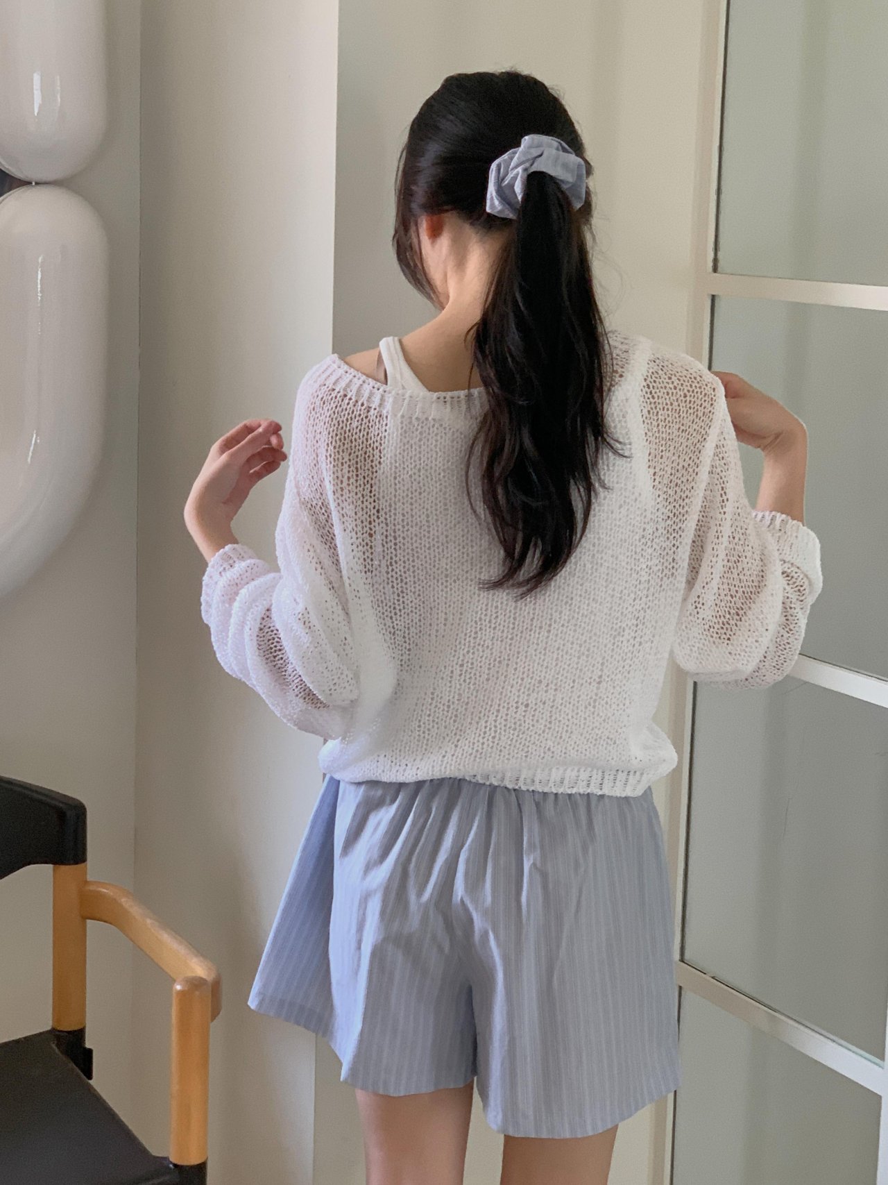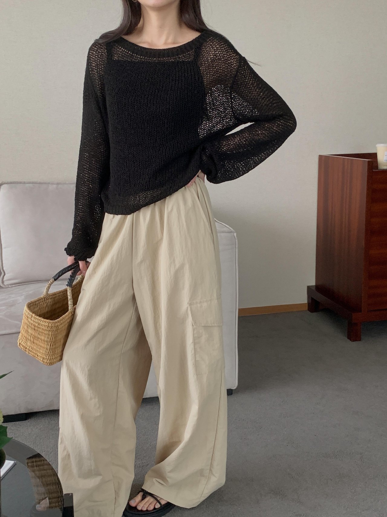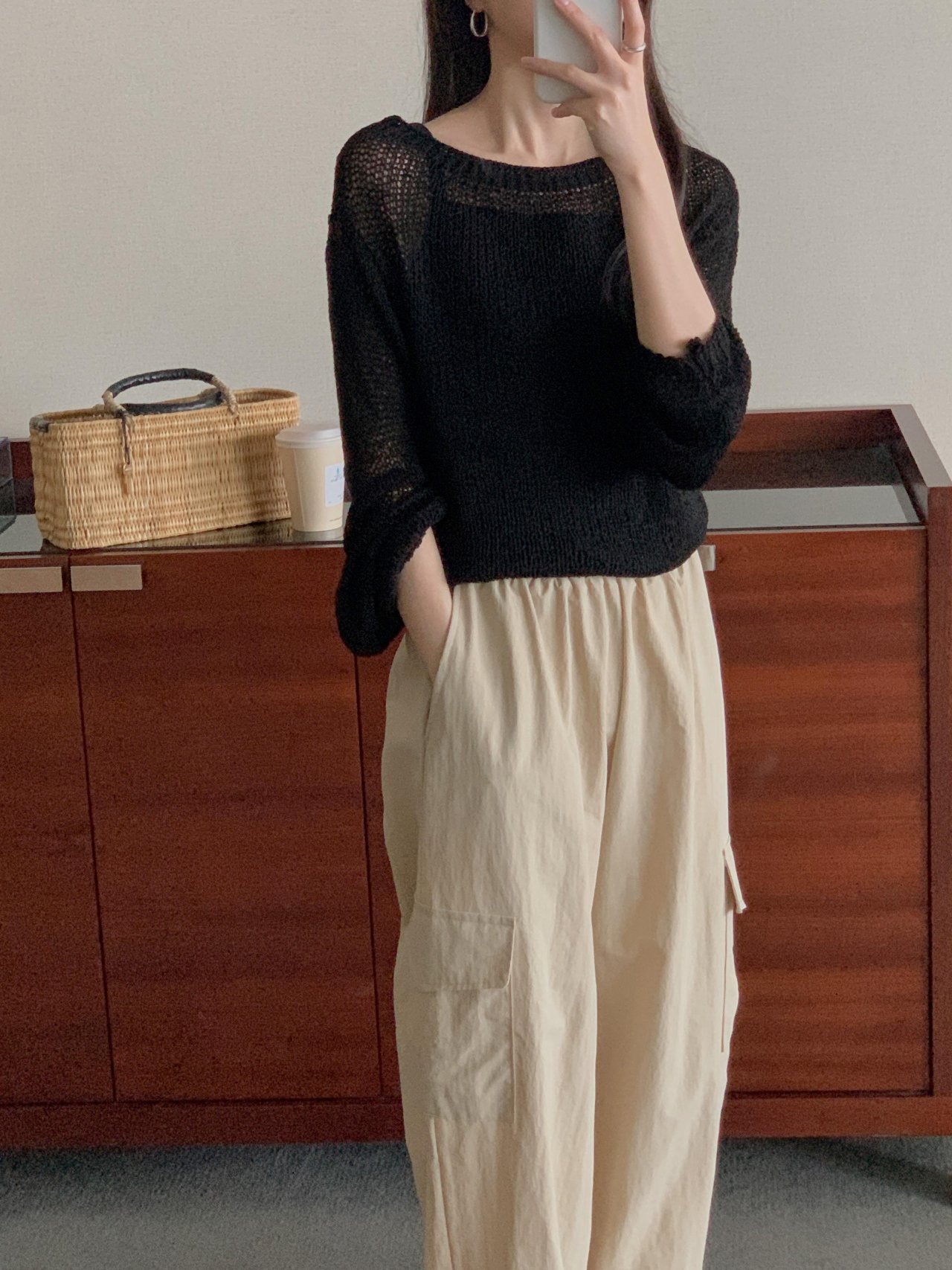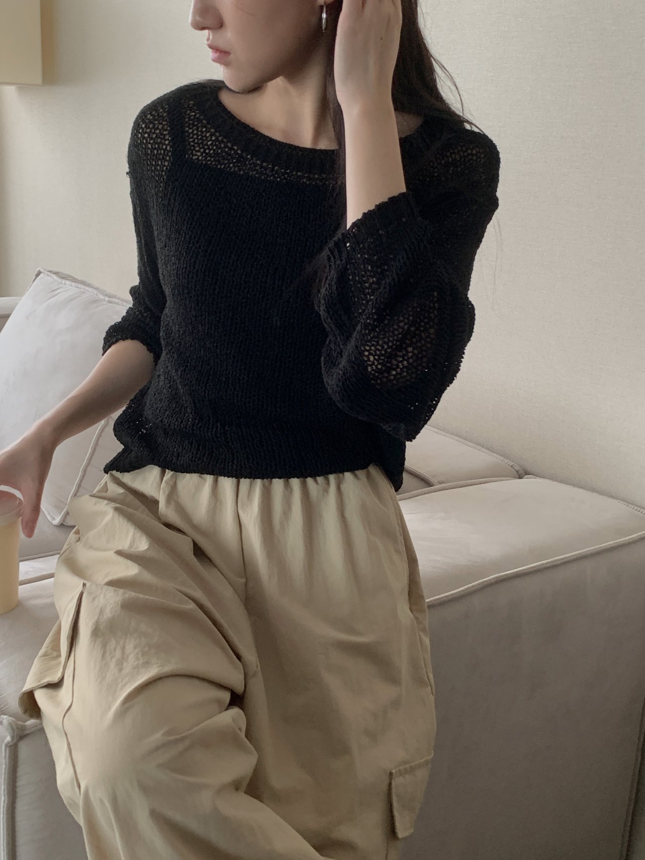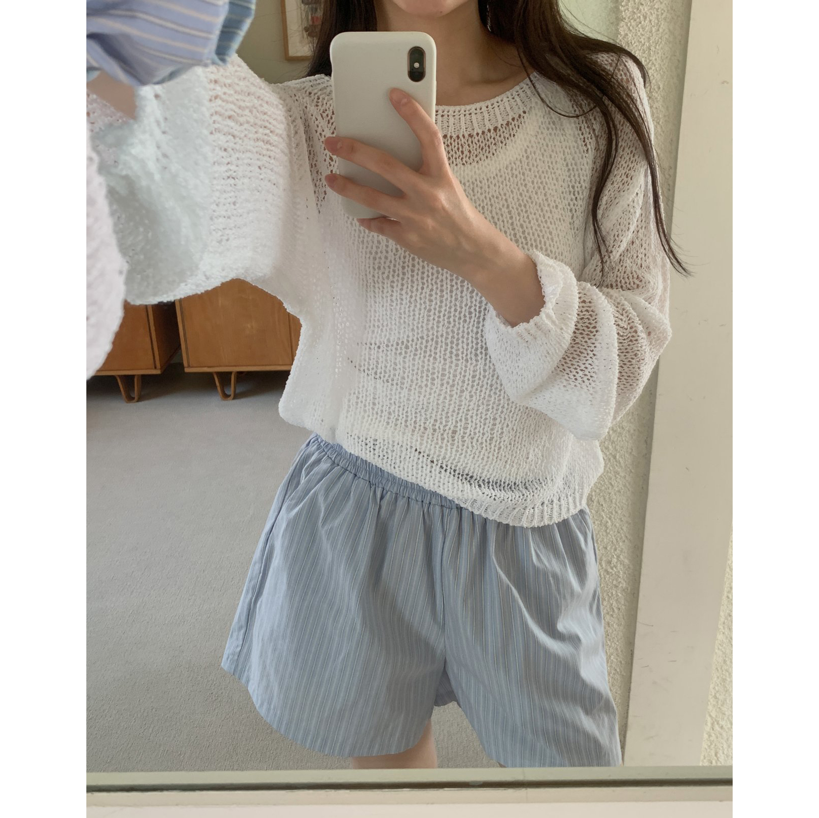 보아 여름 보트넥 그물 긴팔 니트