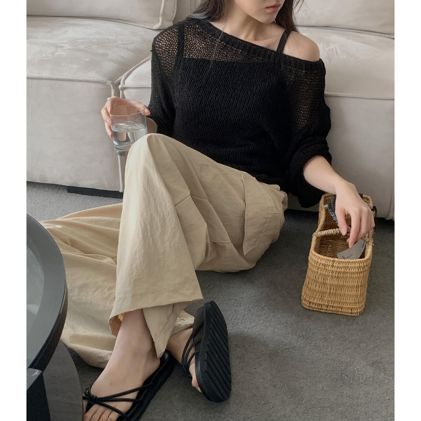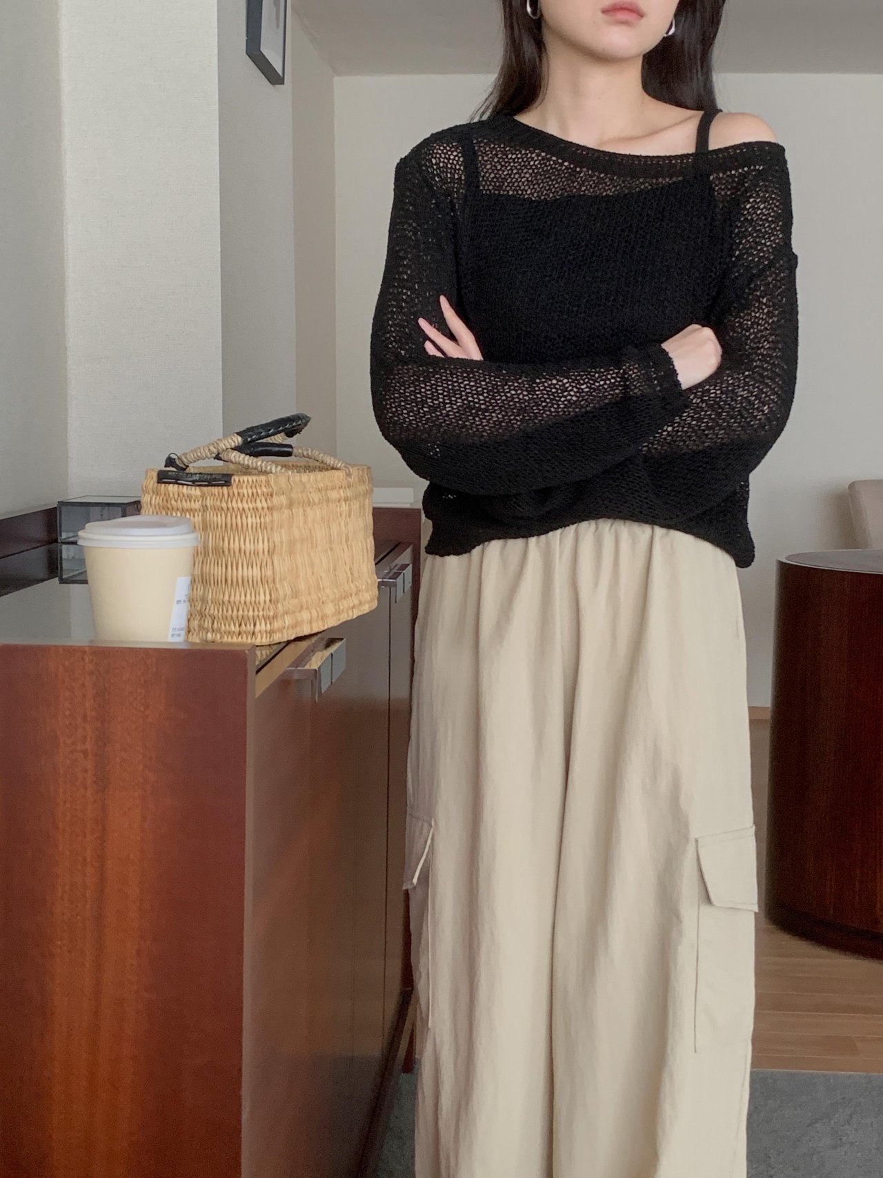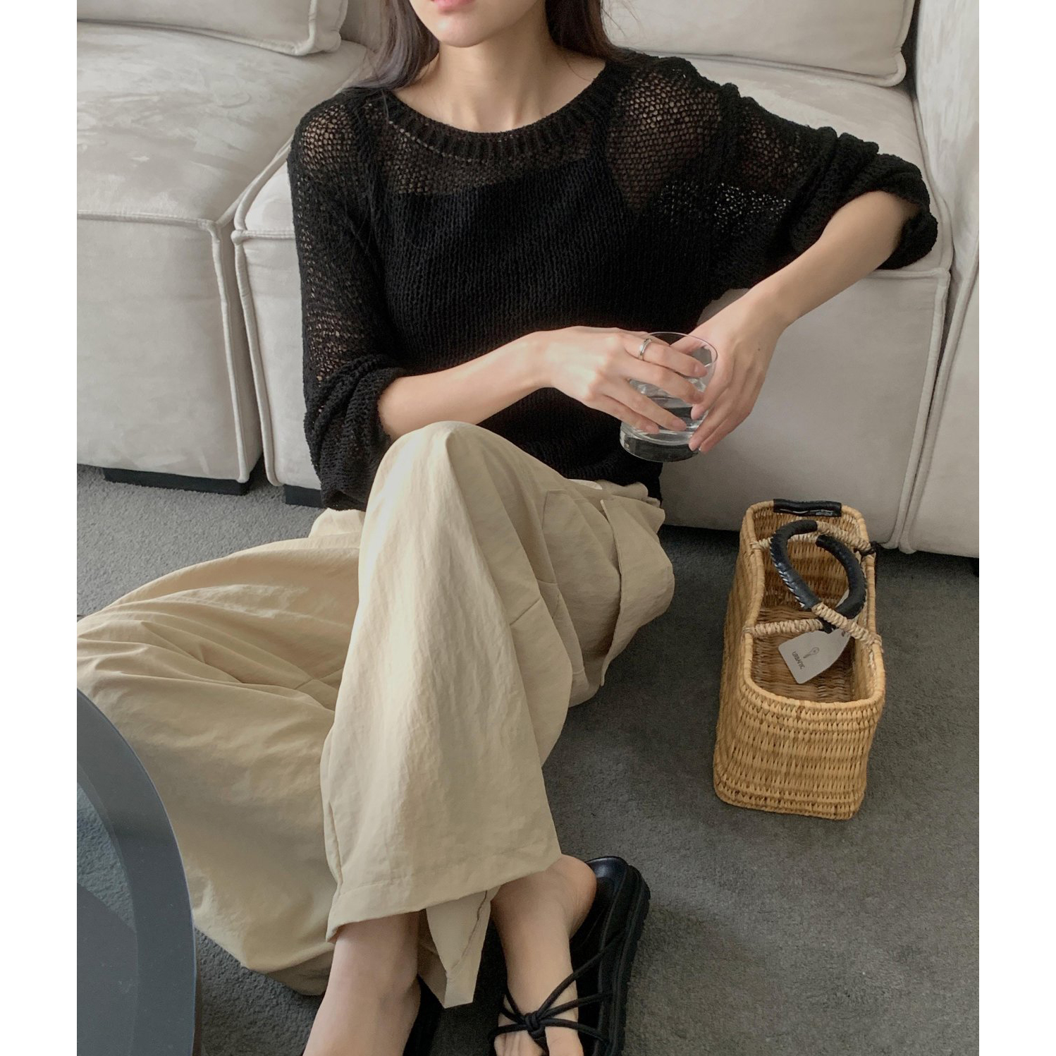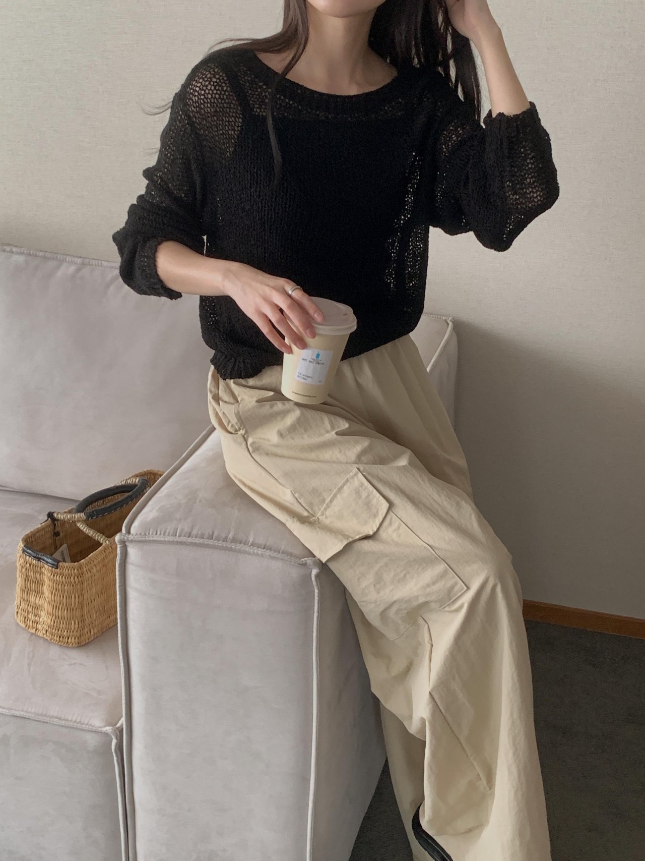 보아 여름 보트넥 그물 긴팔 니트