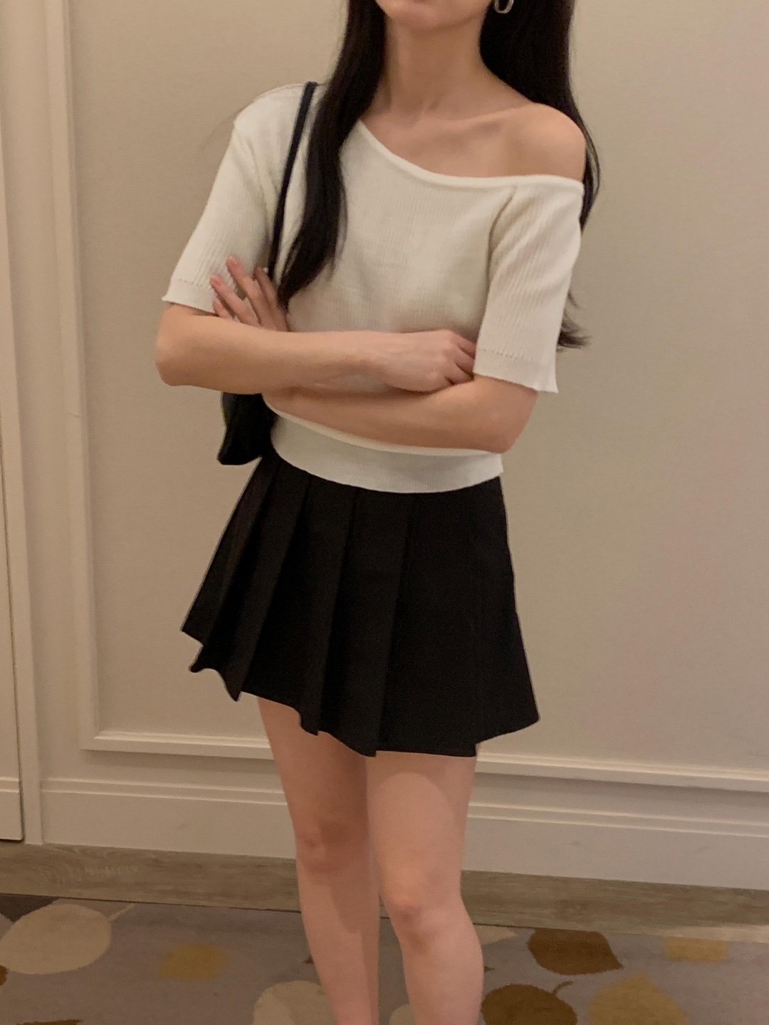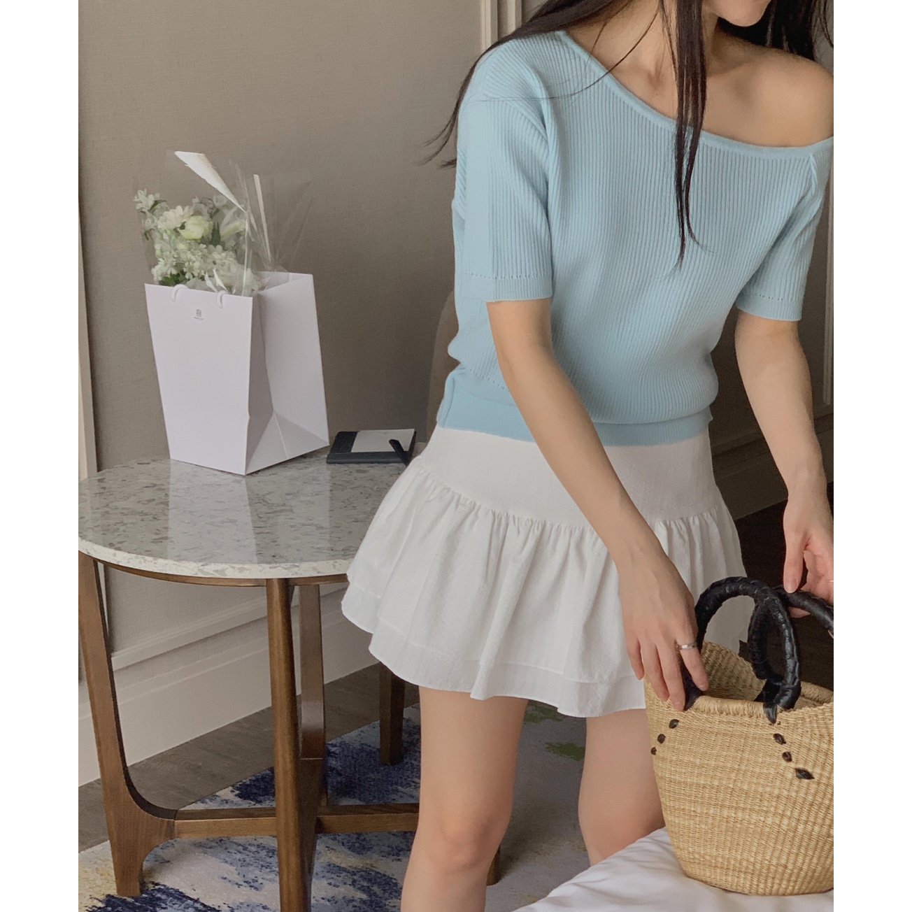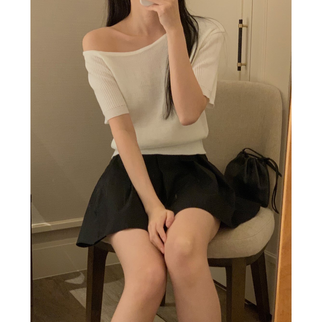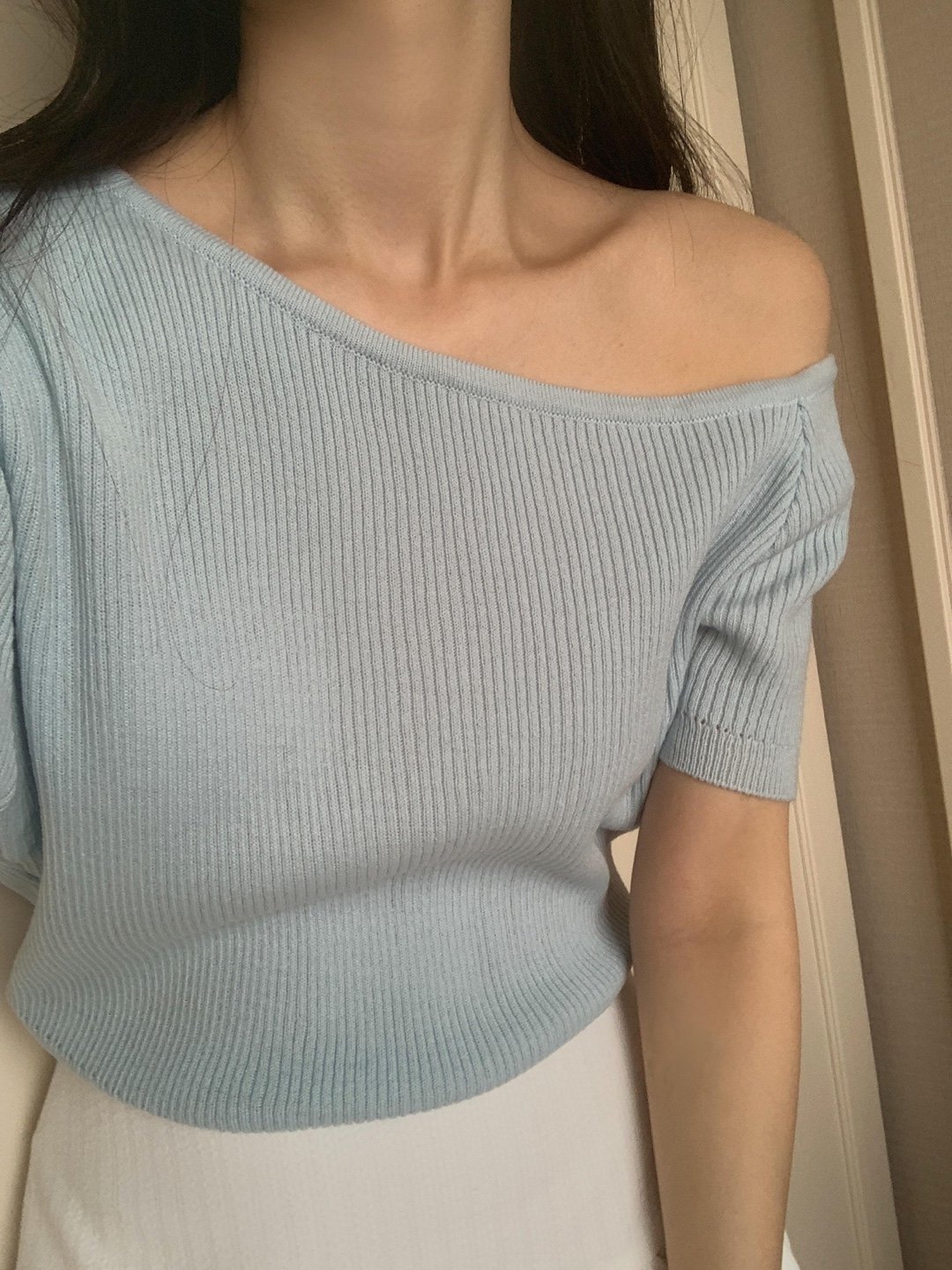 피움 오프 숄더 언발 넥 반팔 골지 니트
