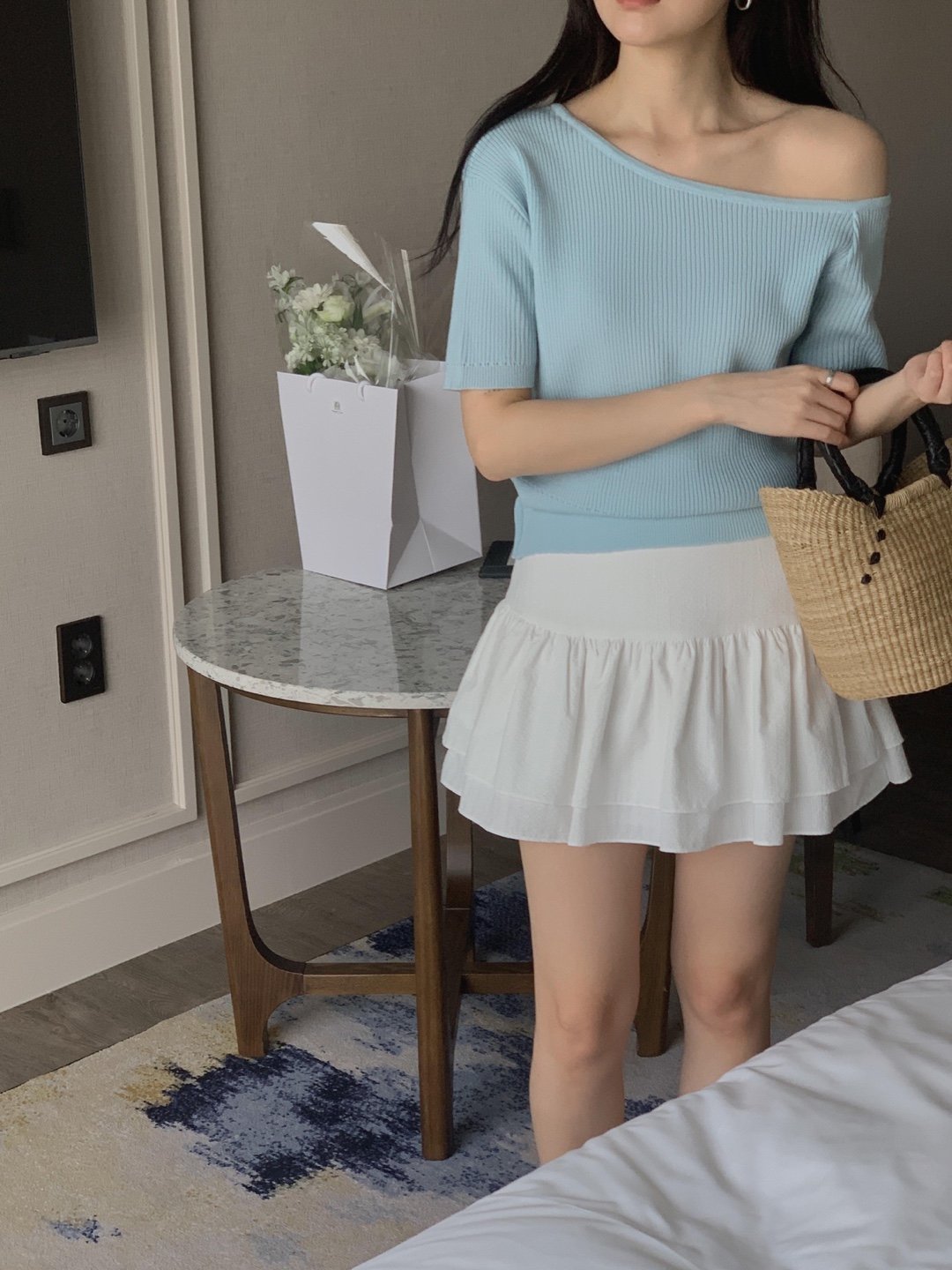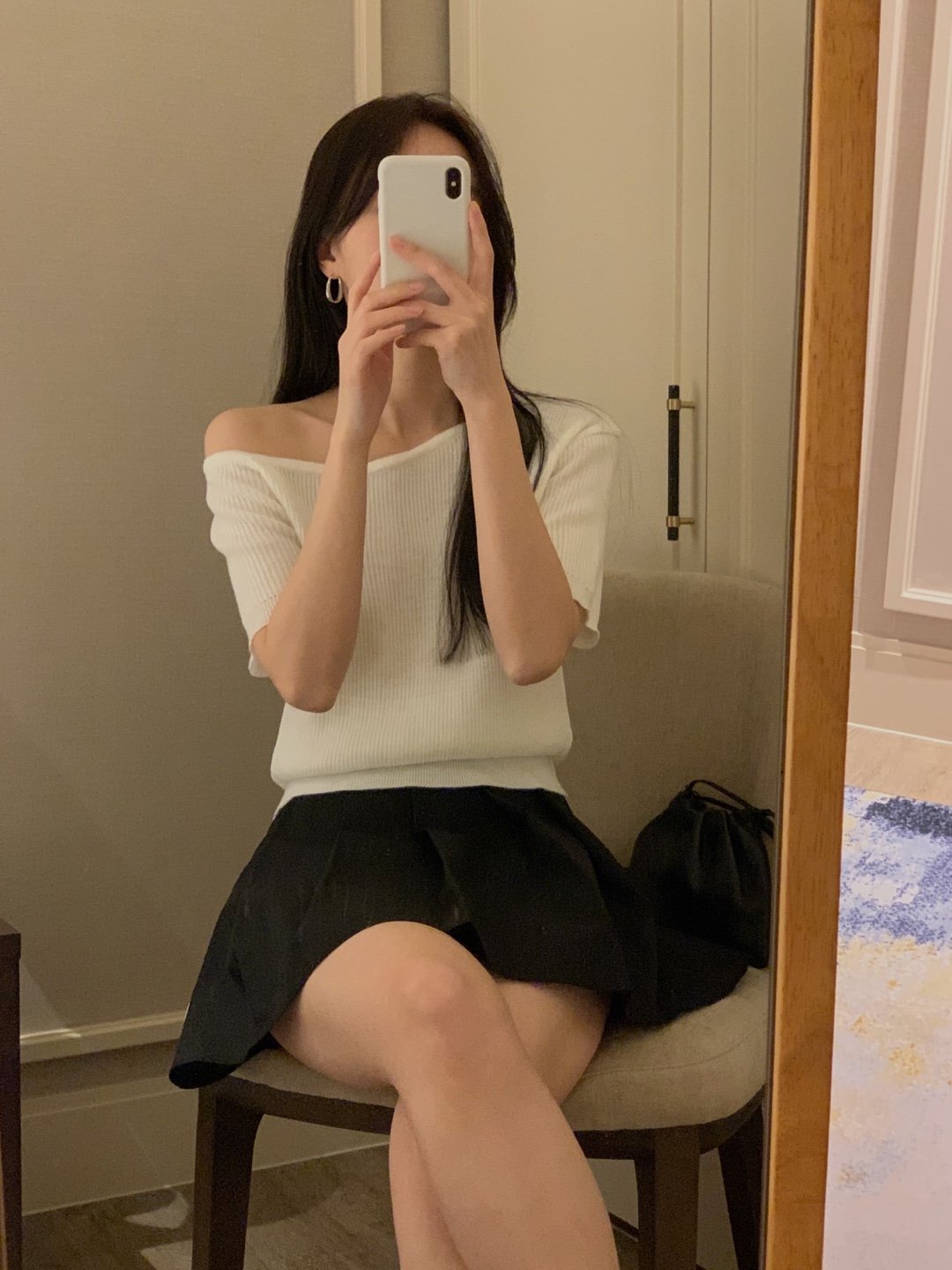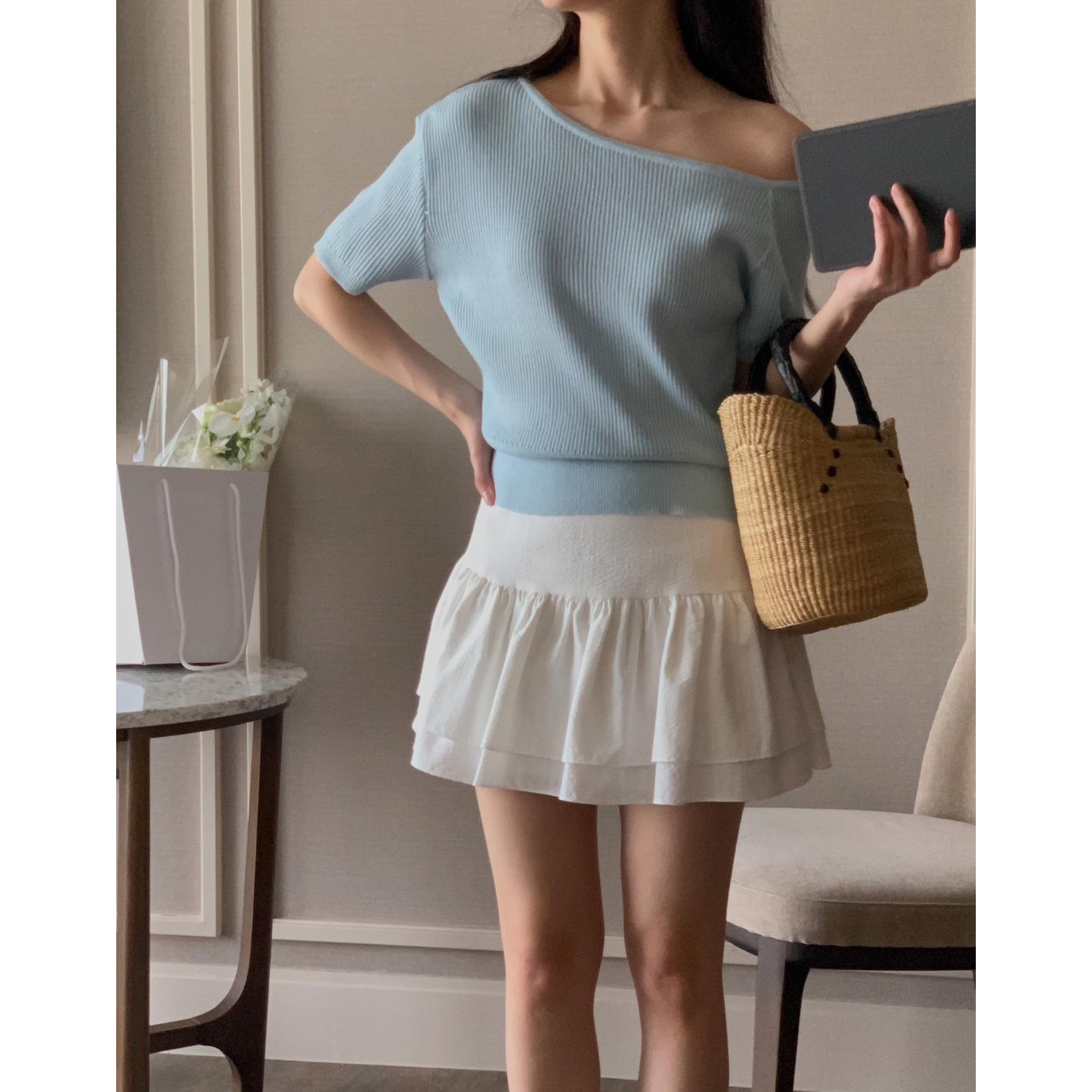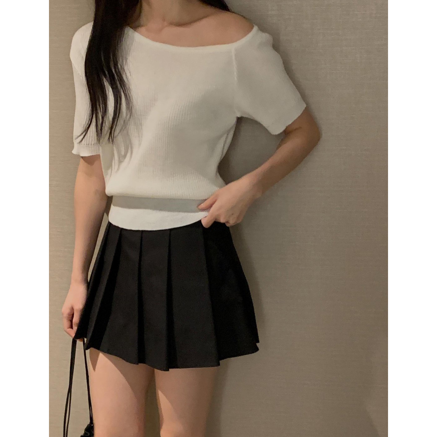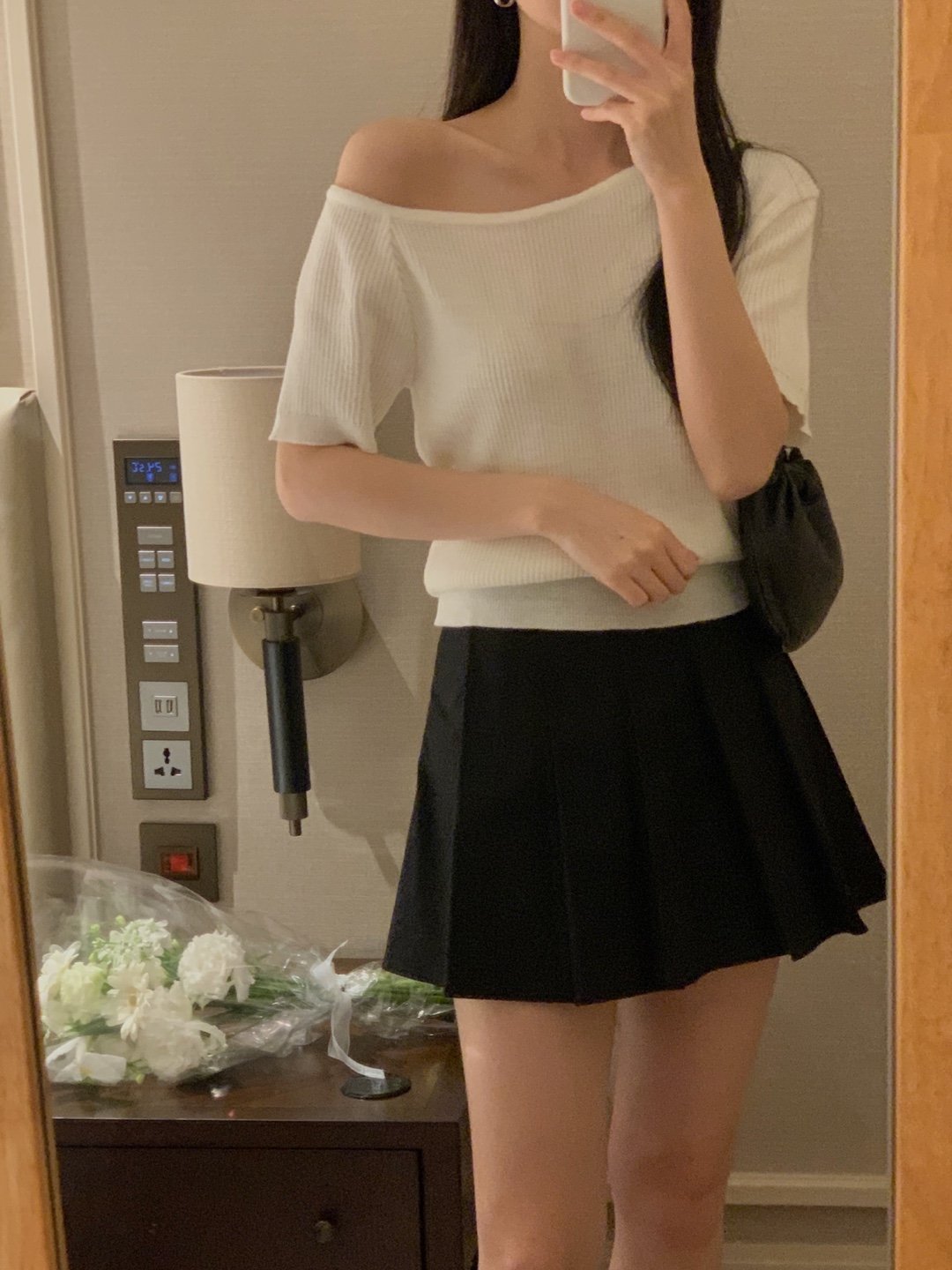 피움 오프 숄더 언발 넥 반팔 골지 니트