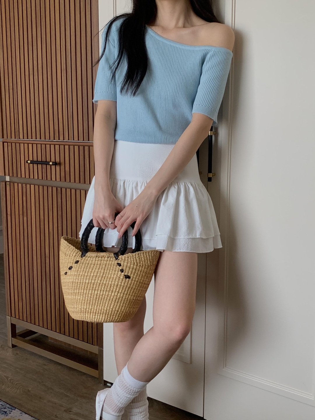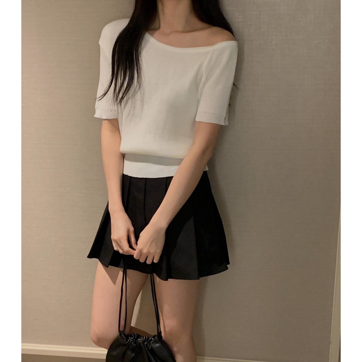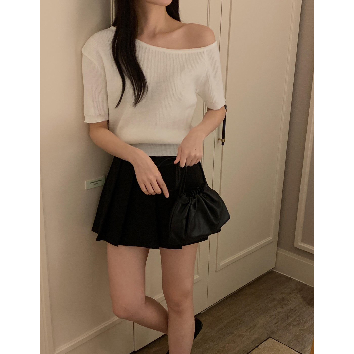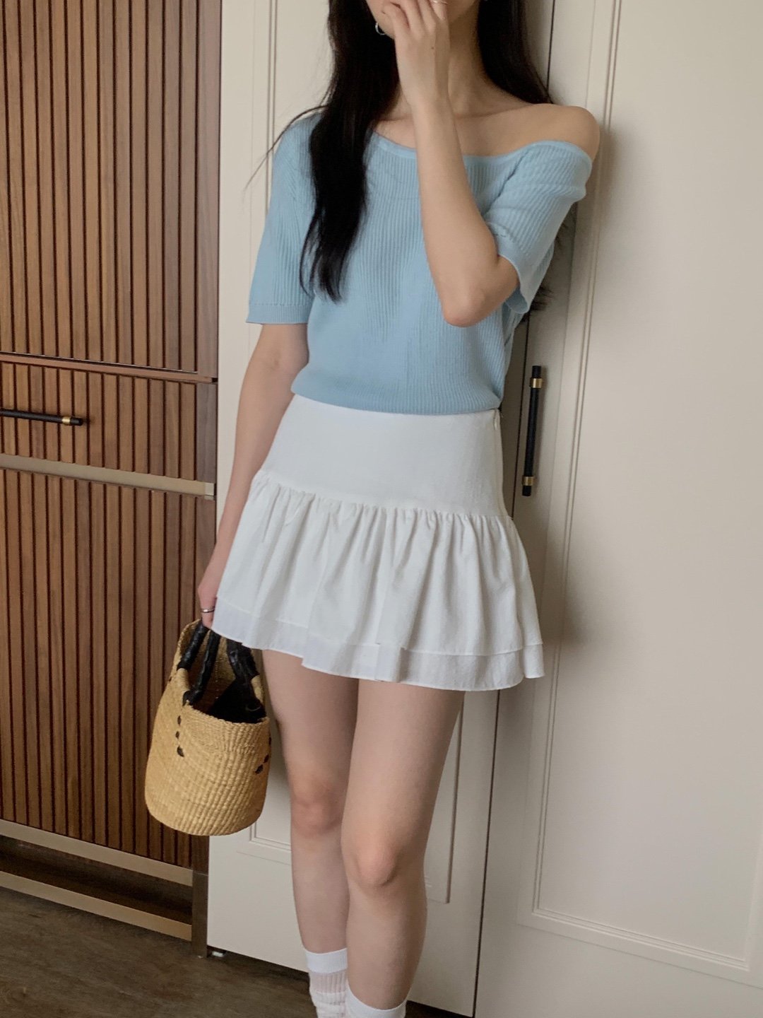 피움 오프 숄더 언발 넥 반팔 골지 니트